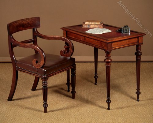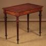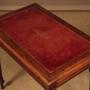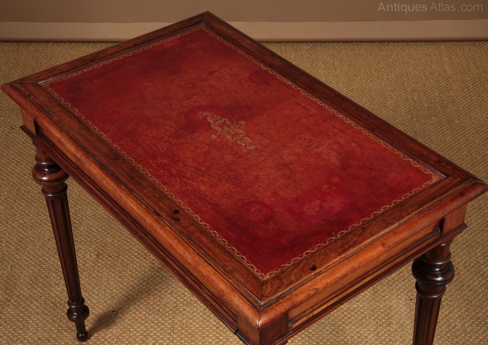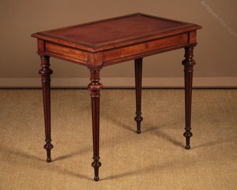 Superb quality little walnut desk or writing table c.1900. Just 32″ wide. Original red leather writing surface with lovely gilded decoration, set within a moulded edge over a slim oak lined drawer. Raised on elegant turned and tapering legs with fluted detail and unusual ball feet. Solid walnut sides and rear, polished alround. Excellent colour and condition, cleaned and waxed in our workshops. Key supplied.