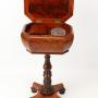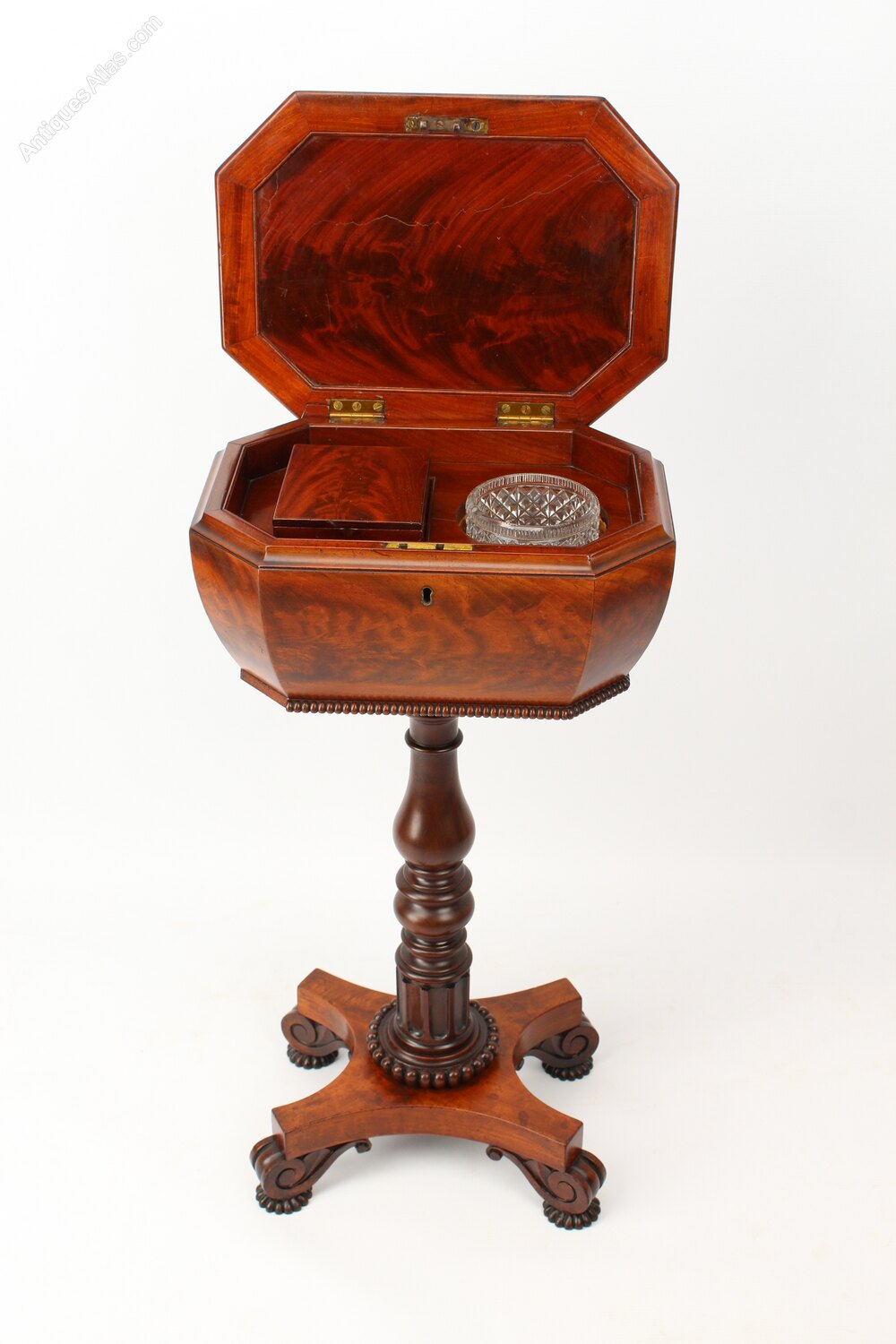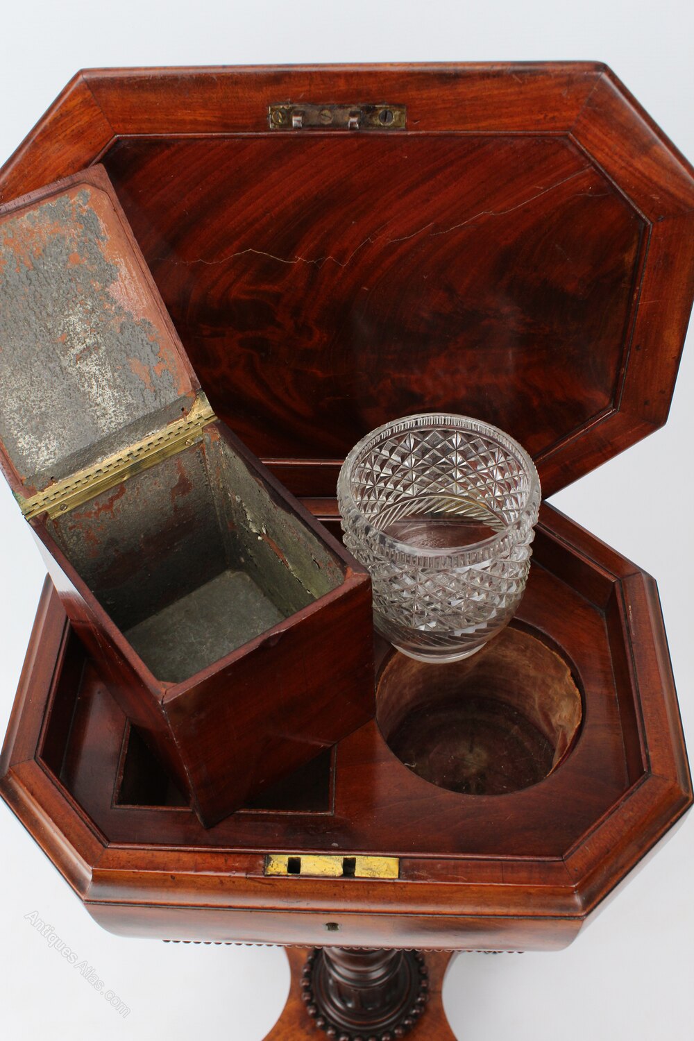 With sarcophagus shaped box raised on a tapered turned stem and standing on a pedestal base with quatrefoil platform and carved scroll feet. The hinged lid opens to reveal a fitted interior with its original removable tea container with remnants of its original foil lining and a velvet lined receptacle containing a cut glass mixing bowl.