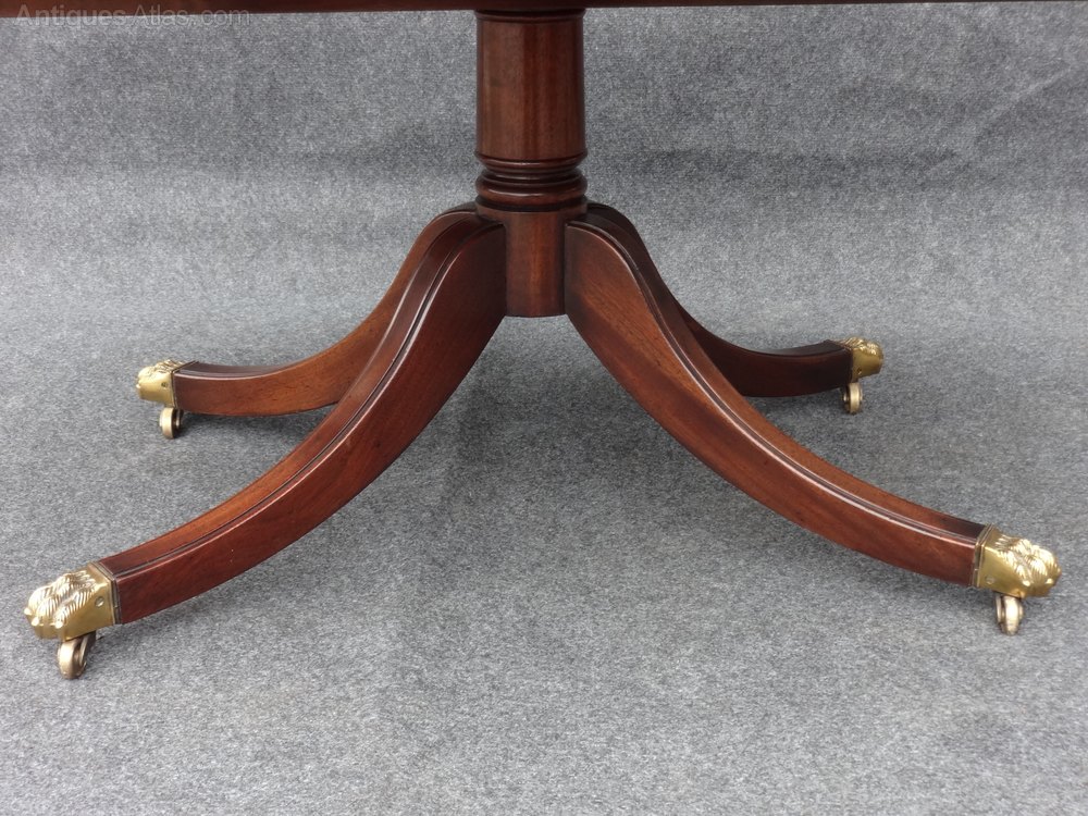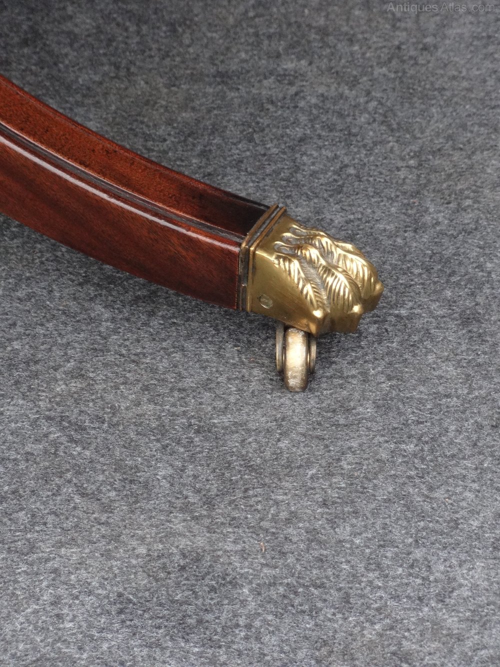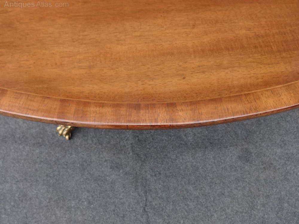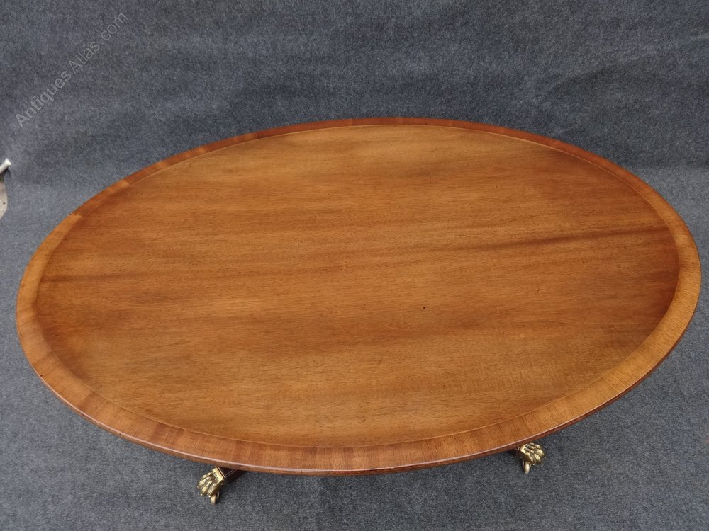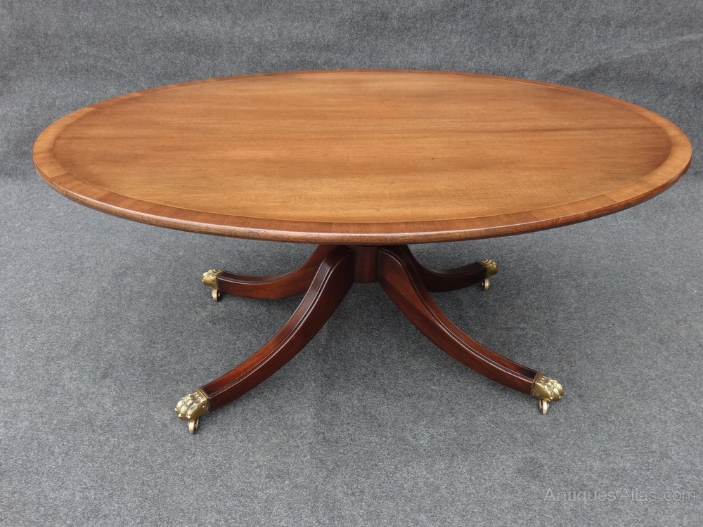 Solid mahogany coffee table, crossbanded edge, standing on pedestal base, brass toes and castors. In very good original condition.