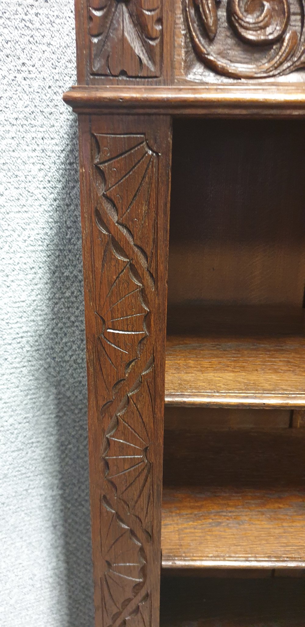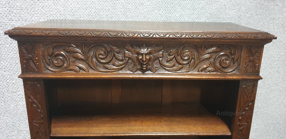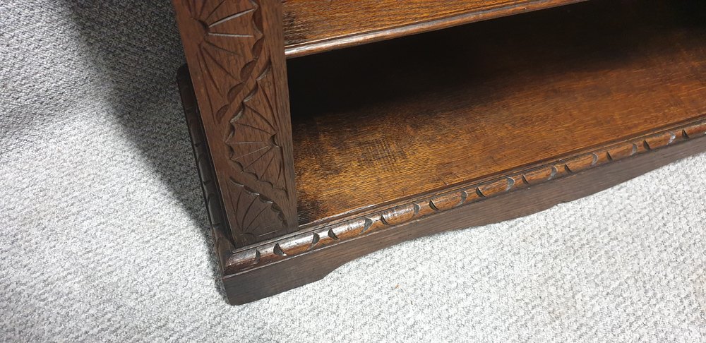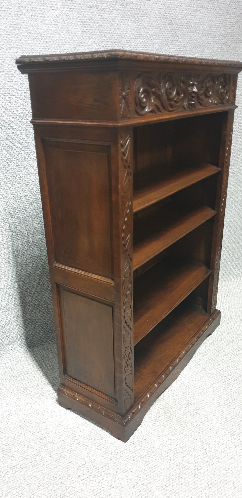 Excellent quality green man solid oak open adjustable bookcase, with reeded panel sides. Excellent colour and condition.