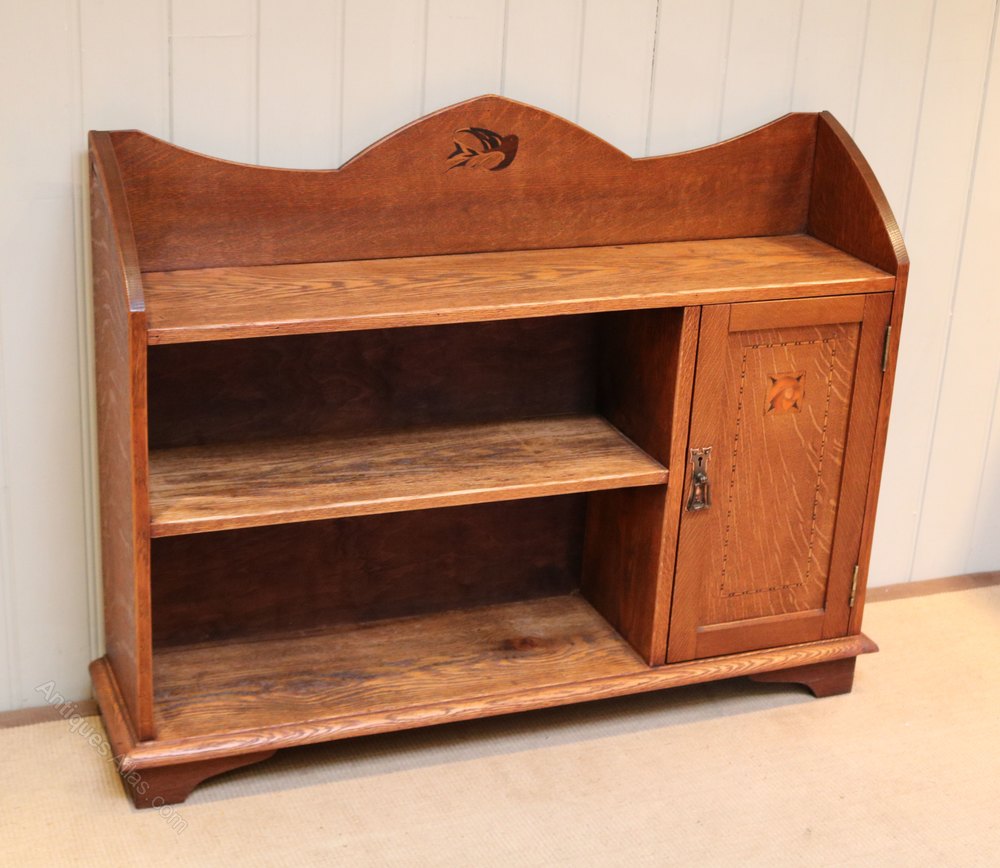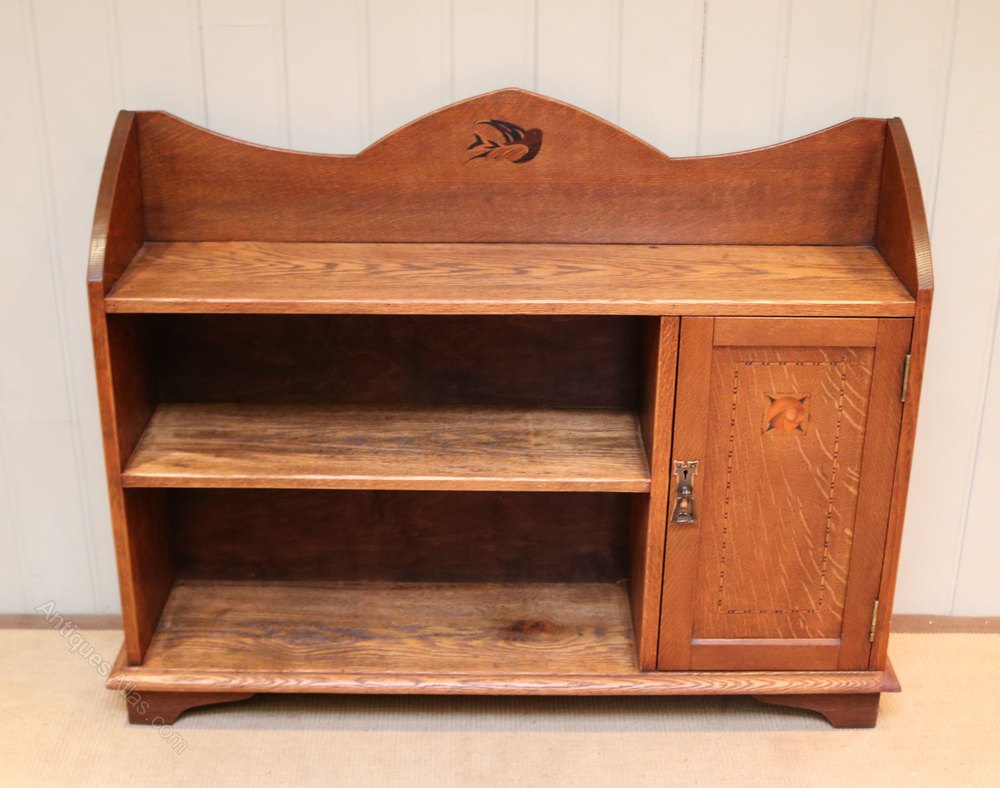 Solid oak Arts and Crafts cabinet bookcase having a single inlaid cupboard to one side with an internal shelf and an open bookcase section to the other with a shaped top having an inlaid bird decoration ,raised on bracket feet