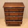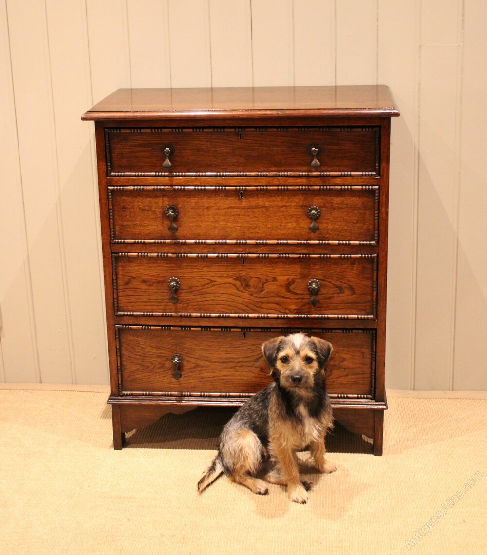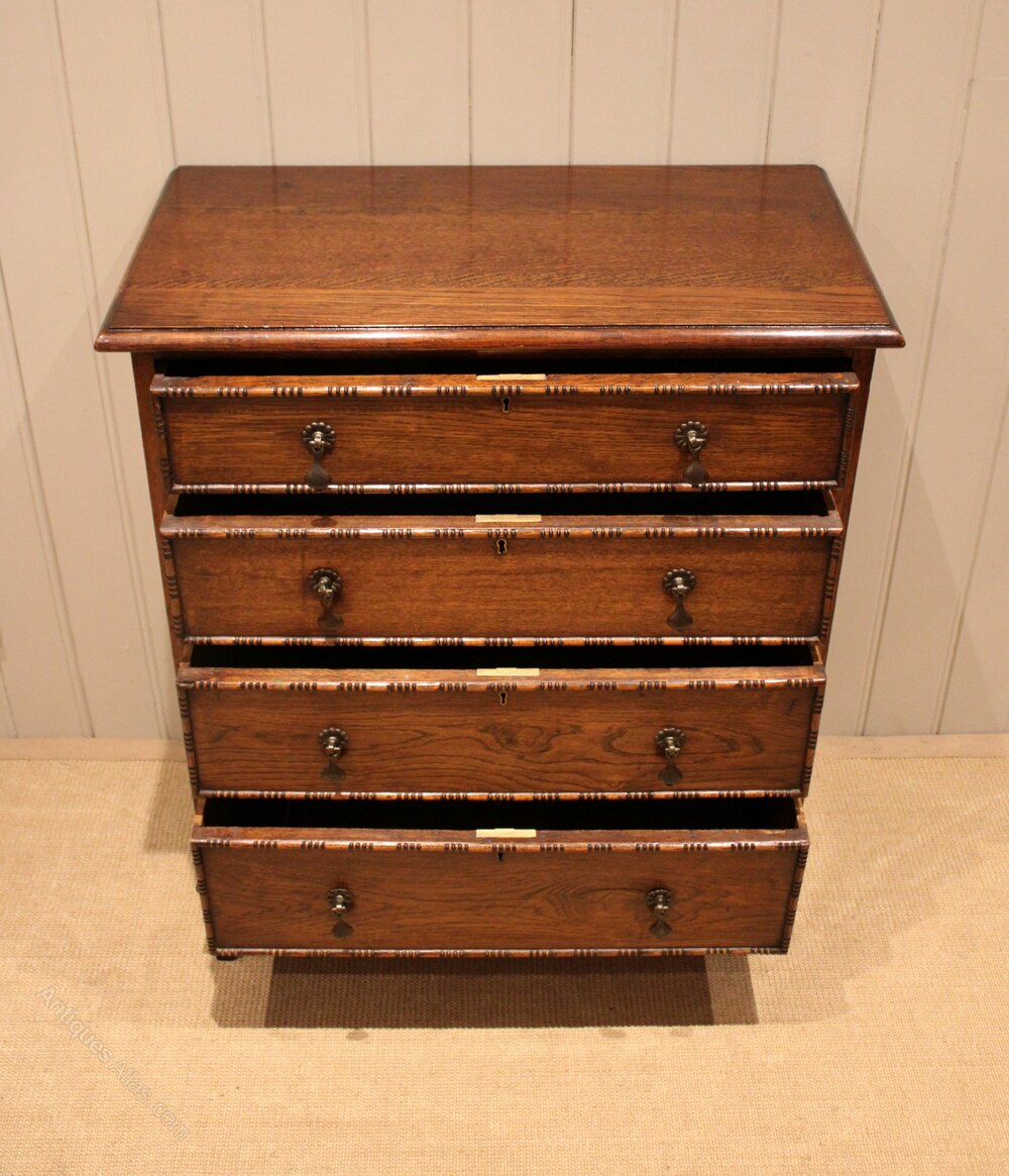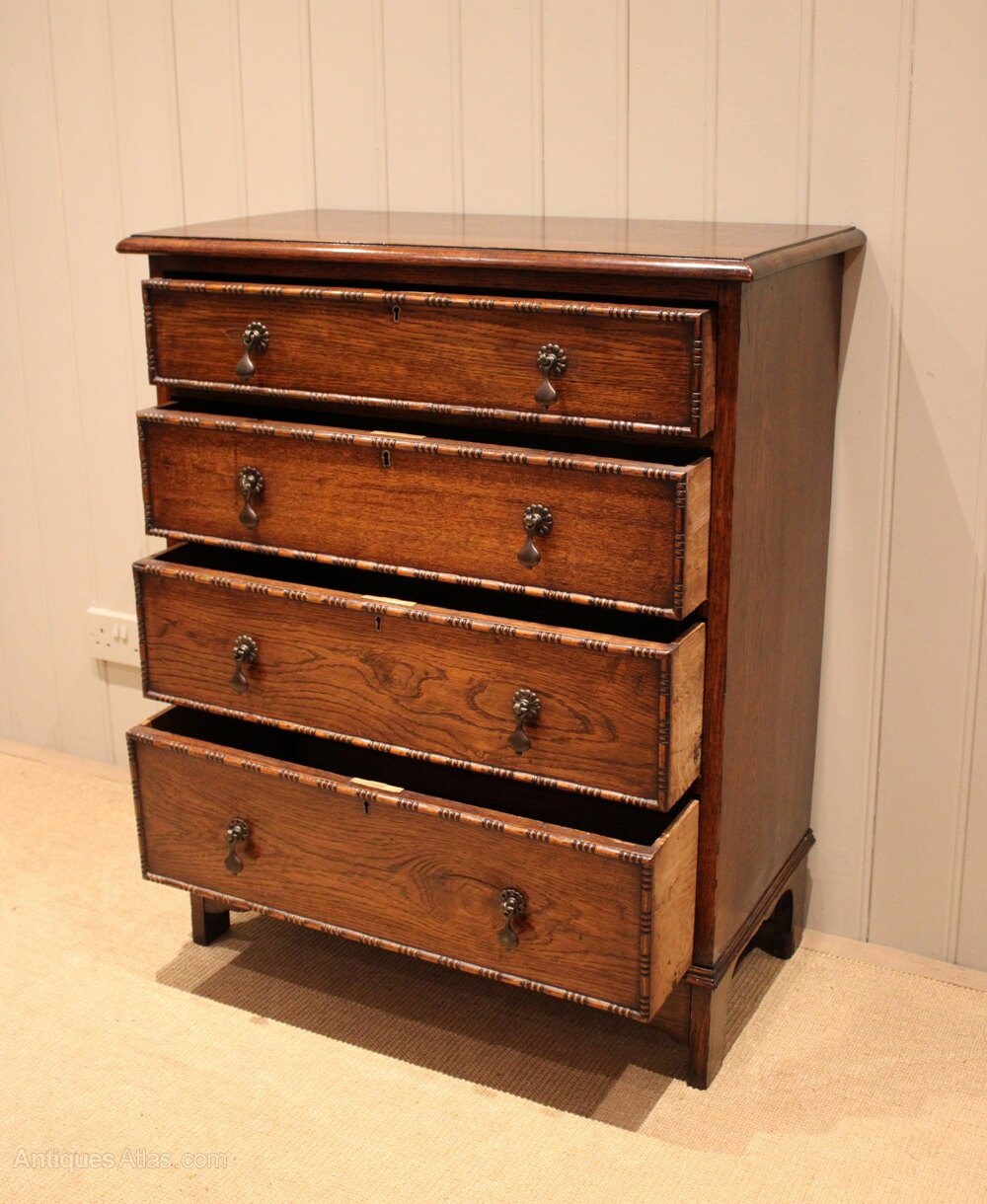 Solid oak chest of four graduated drawers having beaded edges , raised con bracket feet. The drawer depths are from the bottom up 17.5 cm , 15.5 cm , 13.5 cm and at the top 10 cm deep .