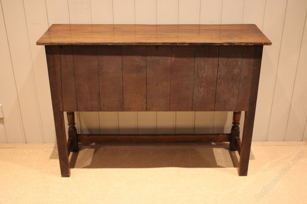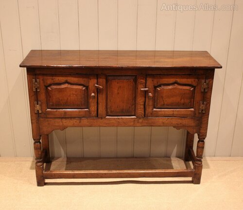 Solid oak dresser base having two cupboards raised on turned legs united by stretchers .
