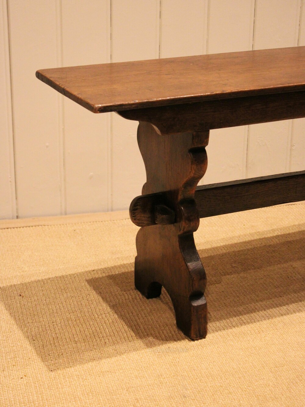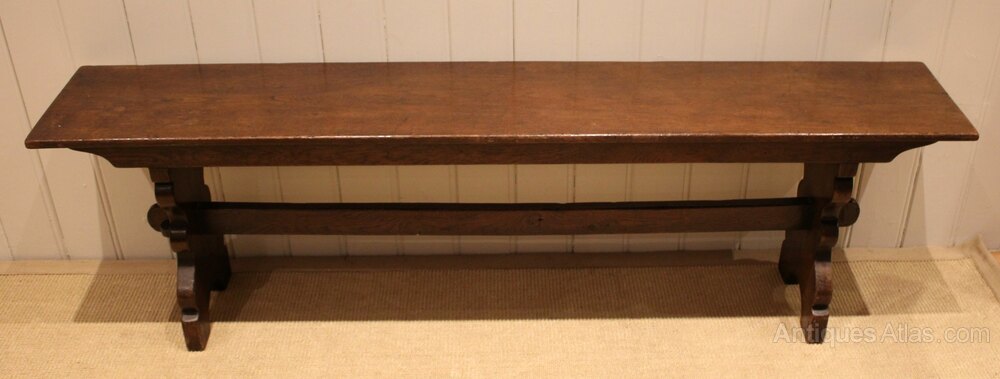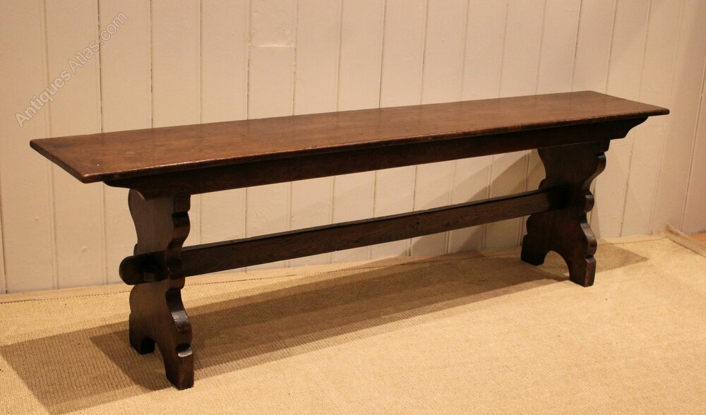 Solid oak farmhouse bench having shaped supports to each end united by a stretcher .
