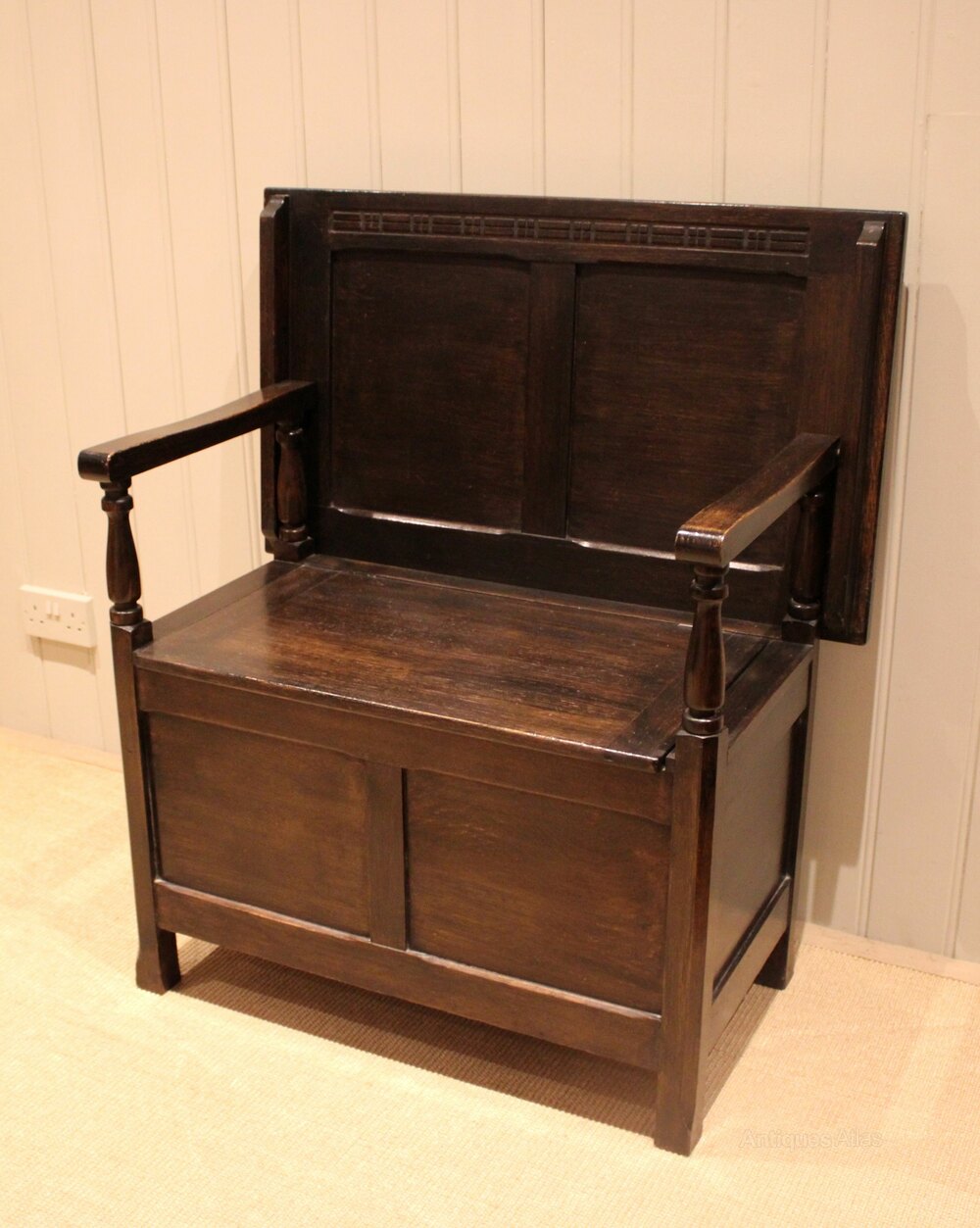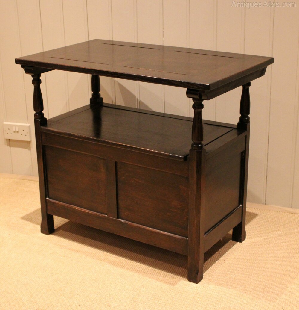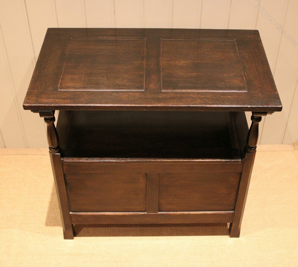 Solid oak monks bench having a panelled front and top with a lift up seat for storage , the back folds down to become a table , on turned supports , raised on short square legs . The height when folded is 71.5 cm .
