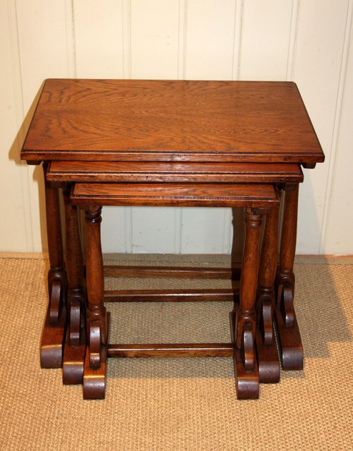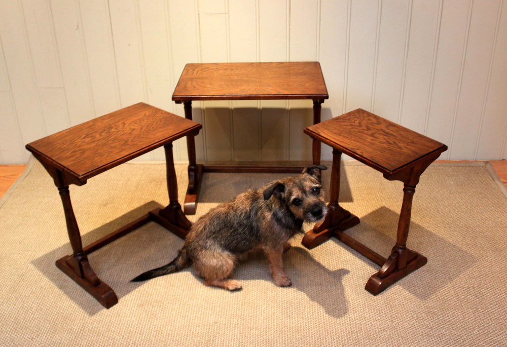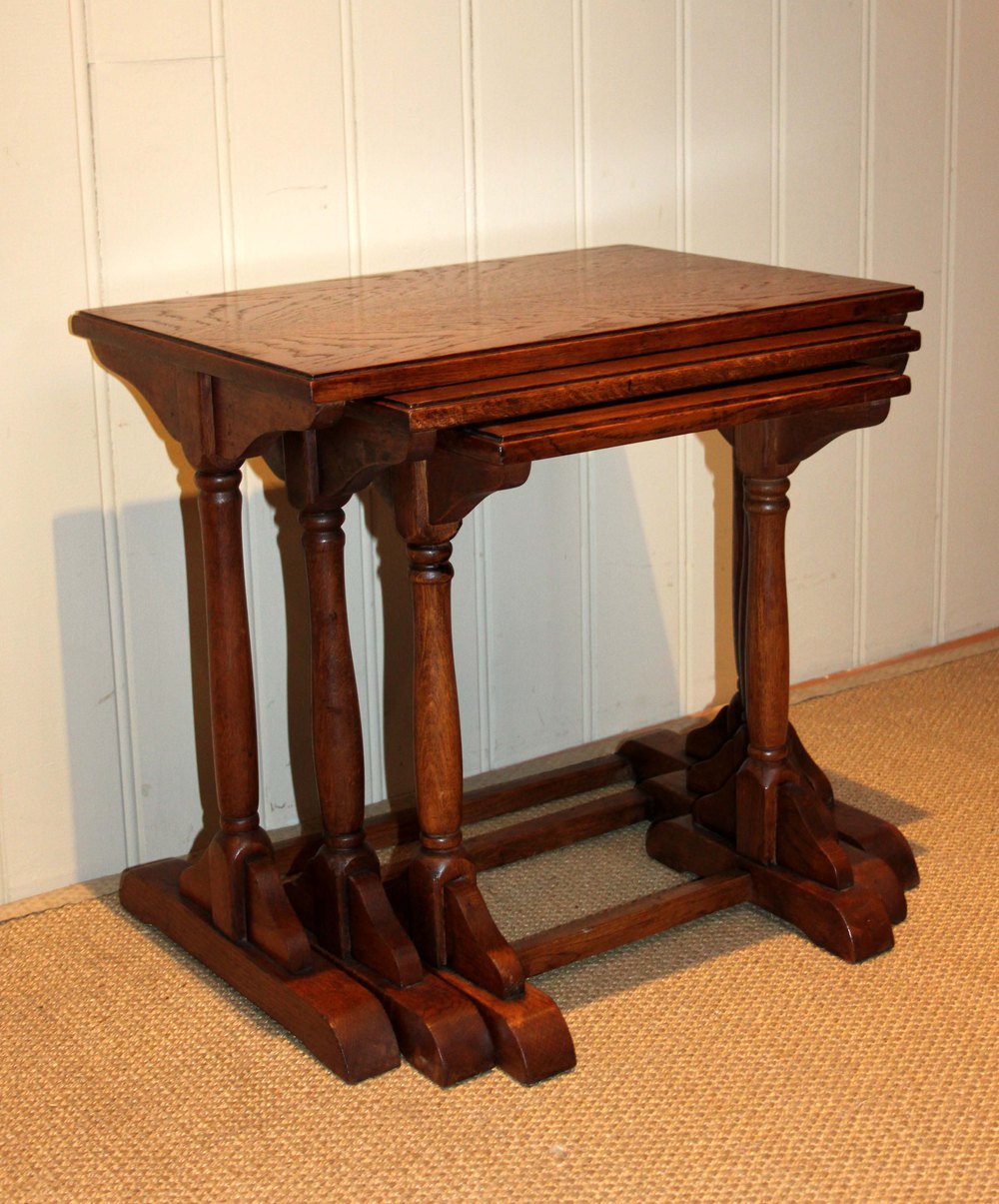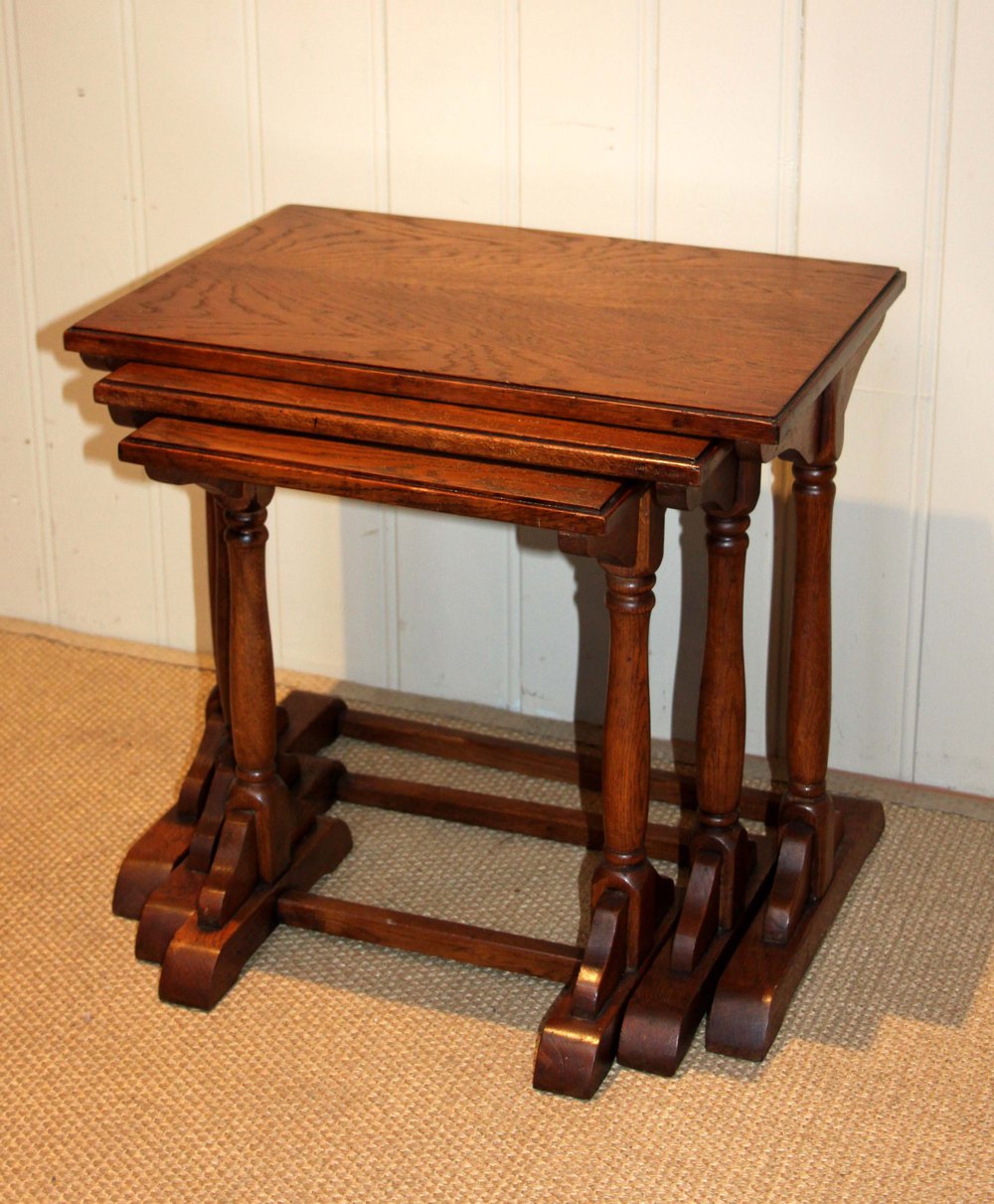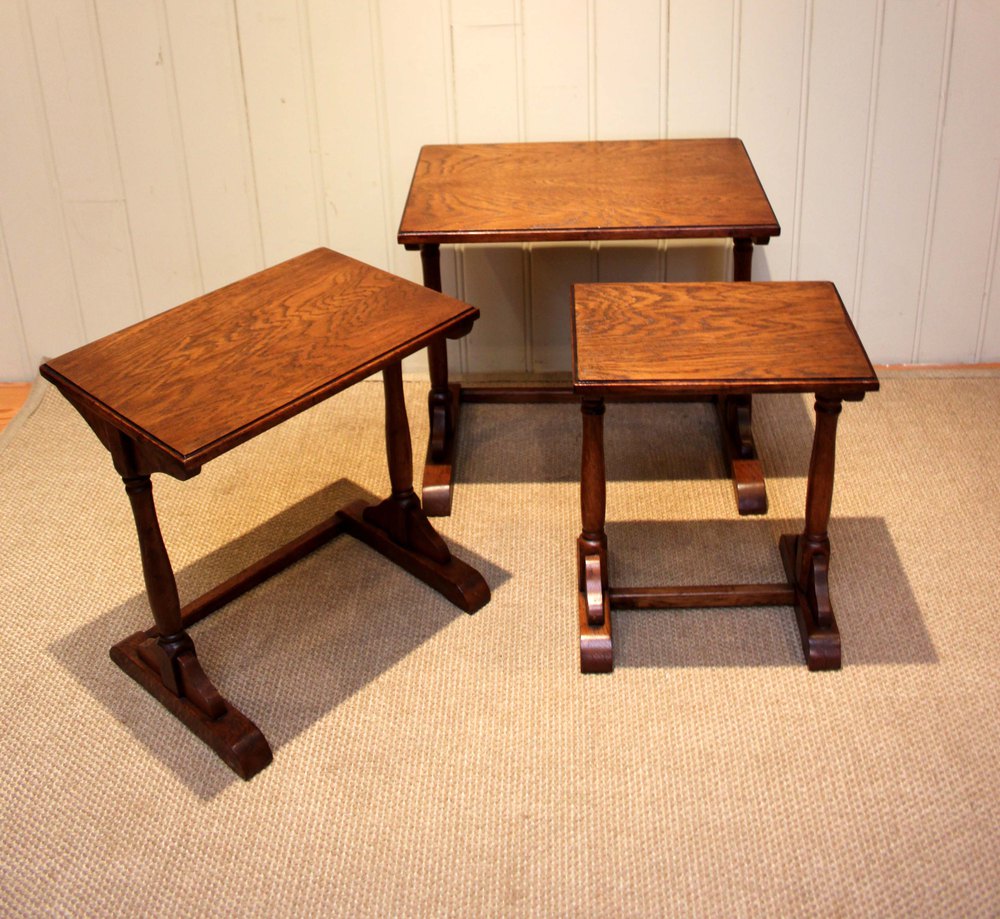 Solid oak nest of three antique tables on substantial turned supports with trestle bases