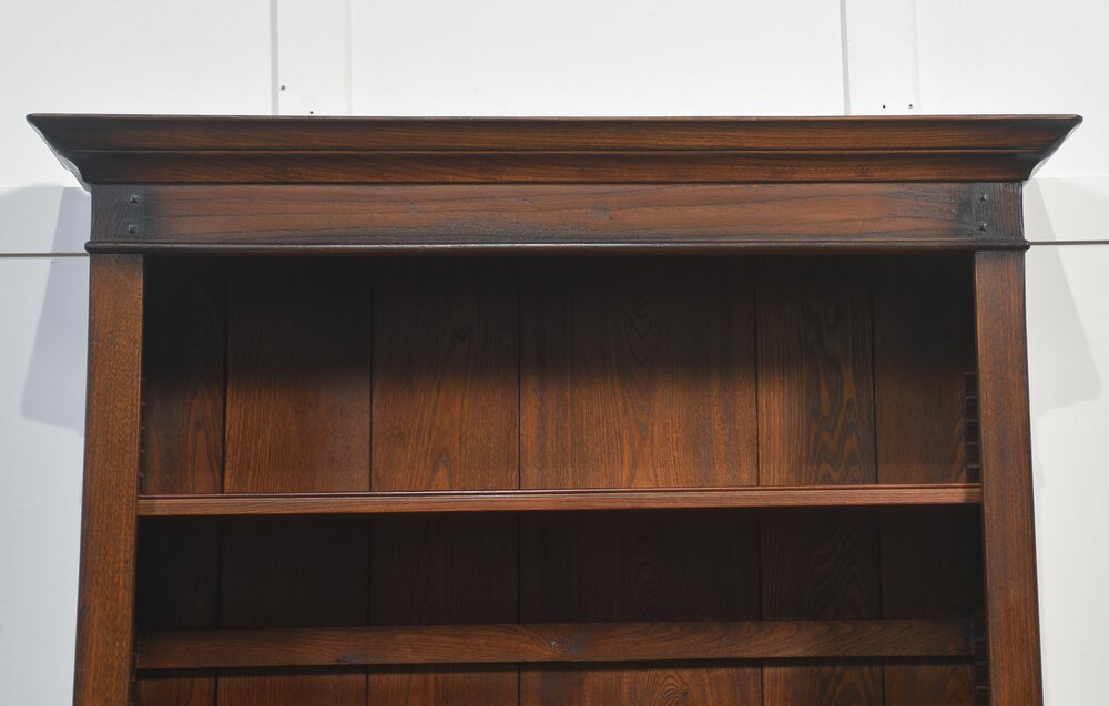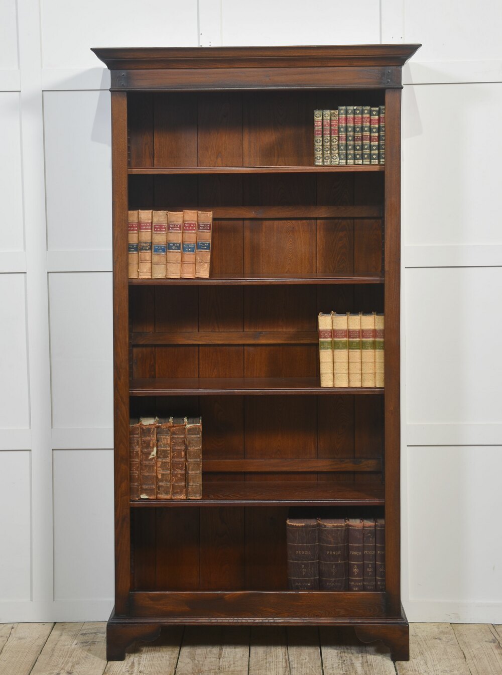 This handsome open bookcase is crafted from solid oak and boasts a rich, warm patina that highlights the natural grain of the wood. Standing tall with a classic design, it features a moulded cornice top, panelled back, and four fully adjustable shelves, offering ample storage and display space for books, collectables, or decorative items.