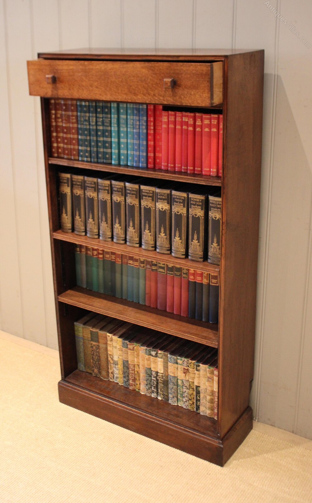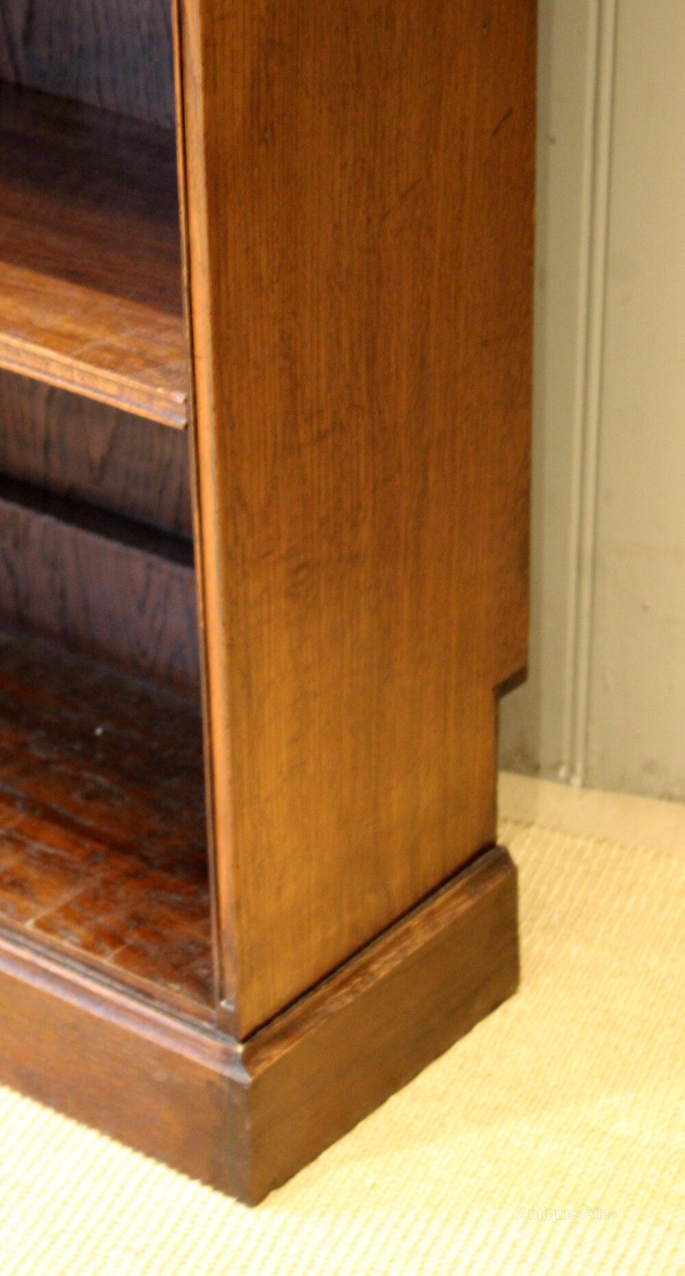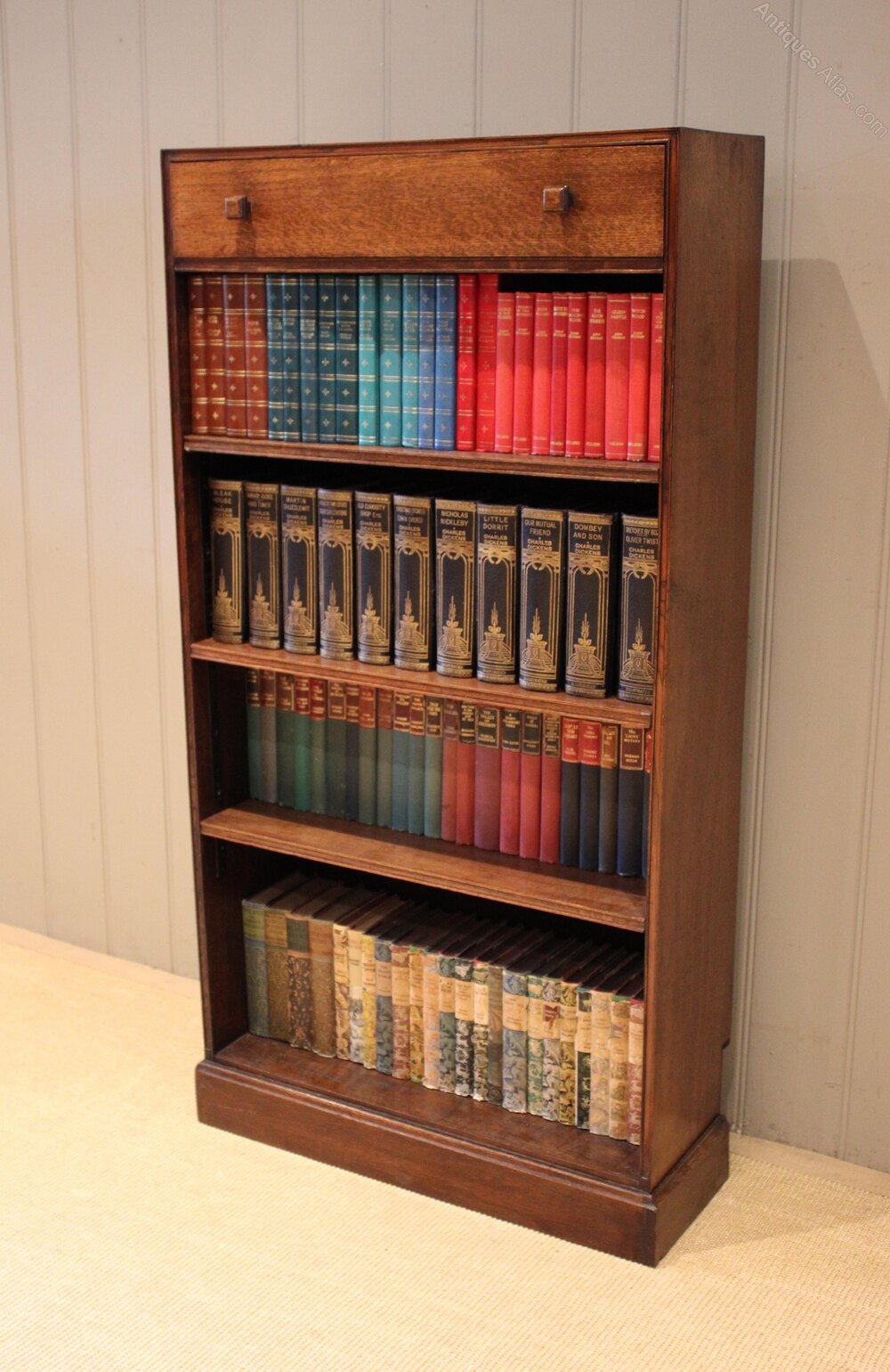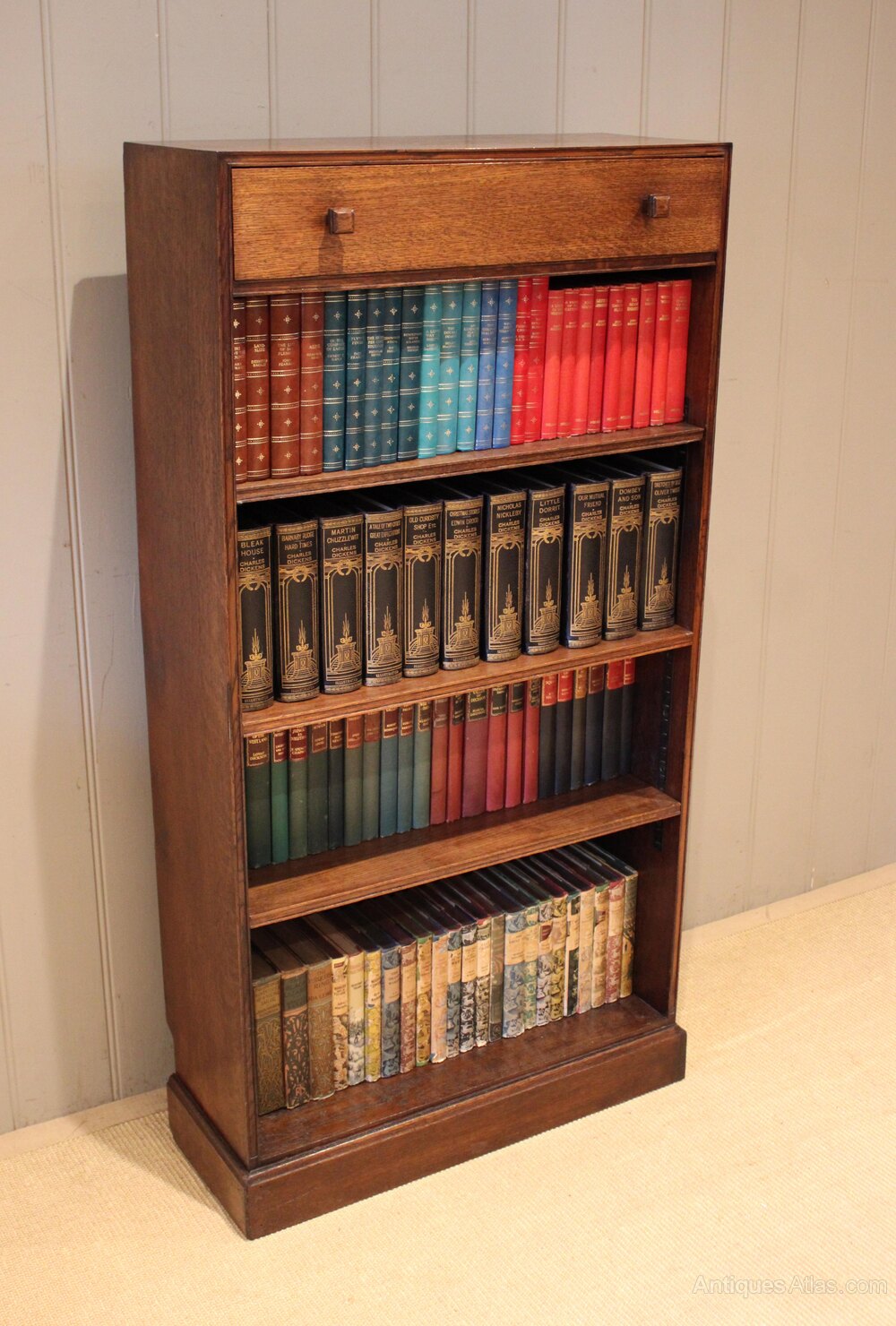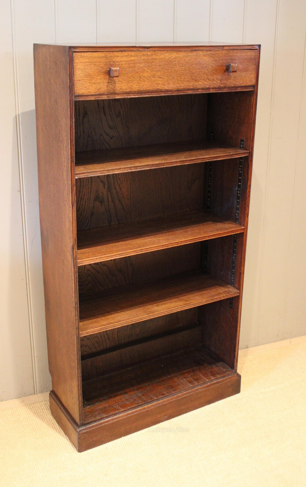 Solid oak open bookcase having three adjustable shelves , with a drawer to the top , raised on a plinth base . The shelves measure 61.5 cm wide and 24 cm deep .