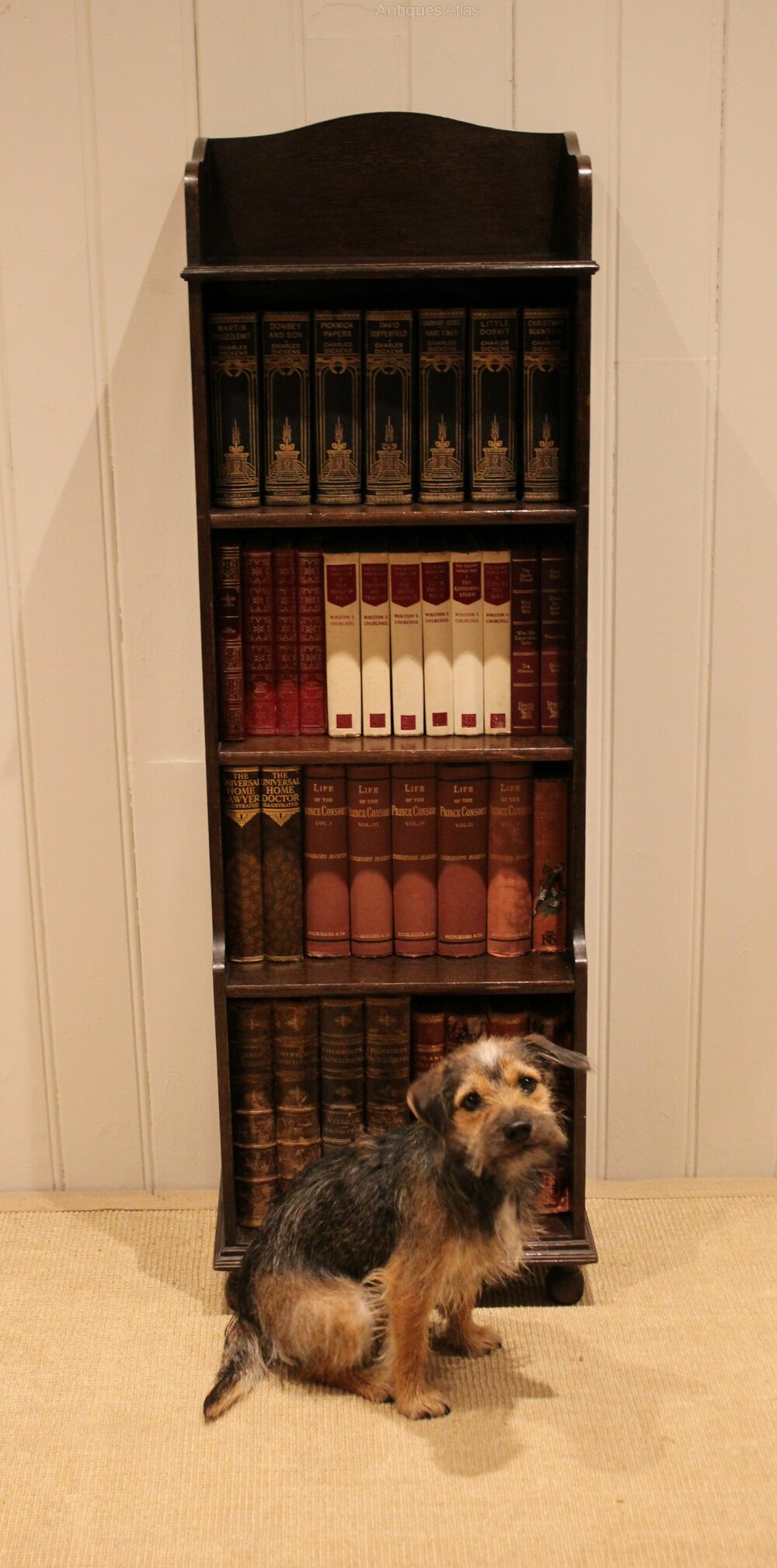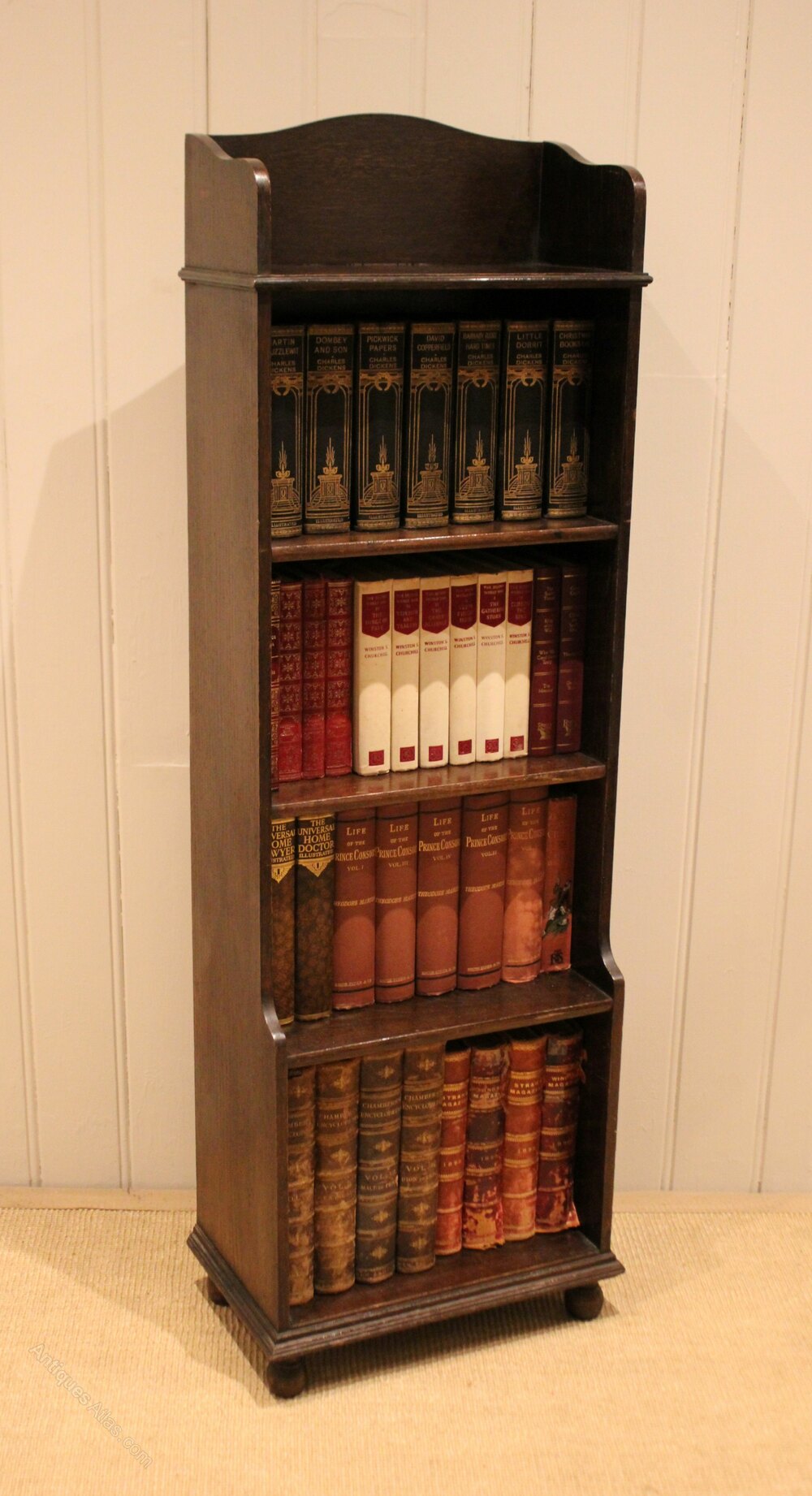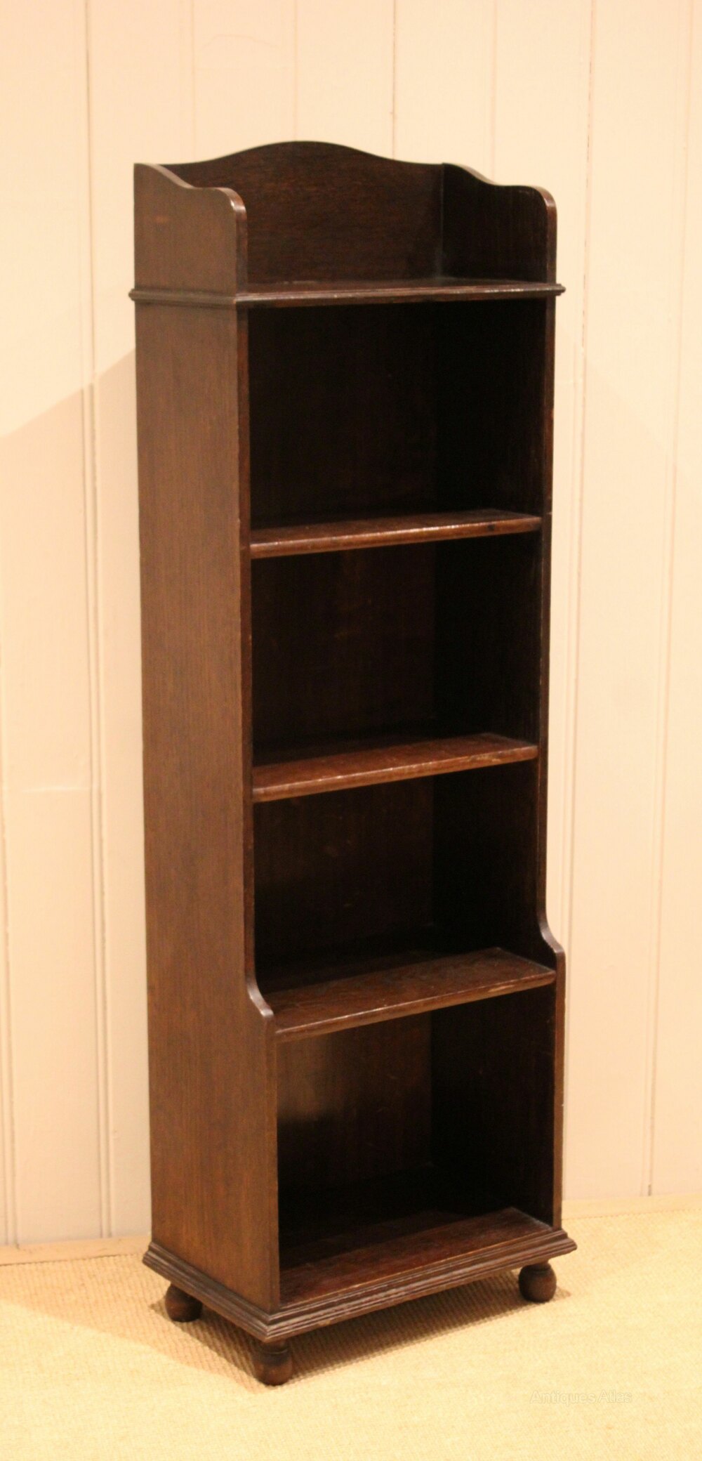 Solid oak open bookcase having three graduated shelves , an arched top , raised on bun feet . The shelf dimensions are 37.5 cm wide and from the bottom up 23 cm deep x 29 cm high , 23 cm deep x 24 cm high , 19 cm deep x 24 cm high and at the top 19 cm deep x 23 cm high .