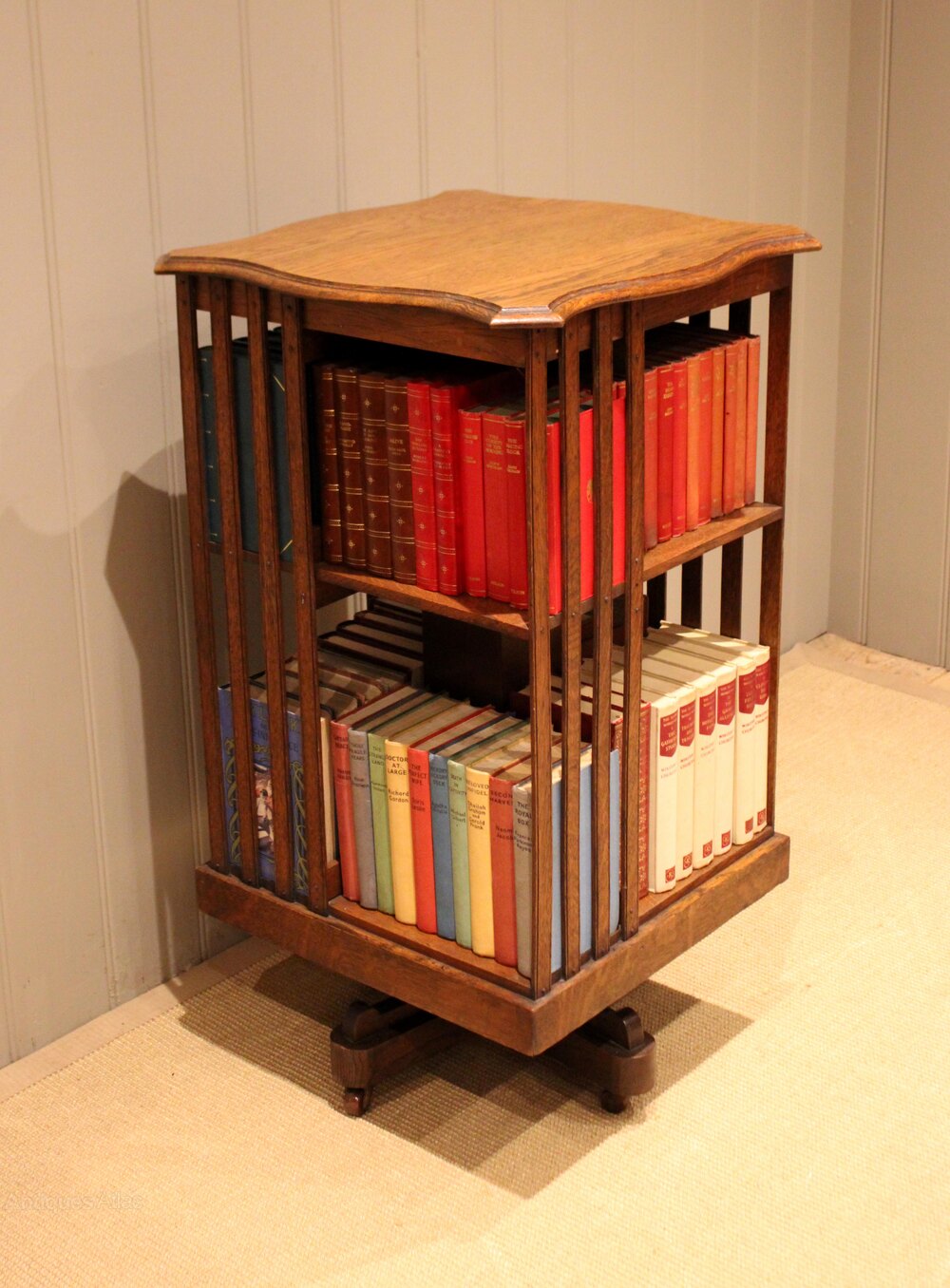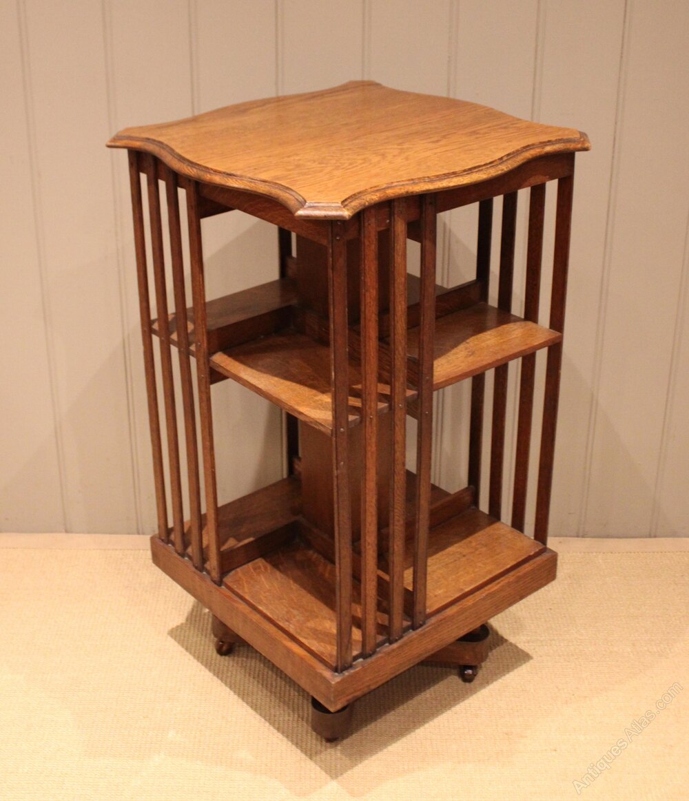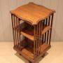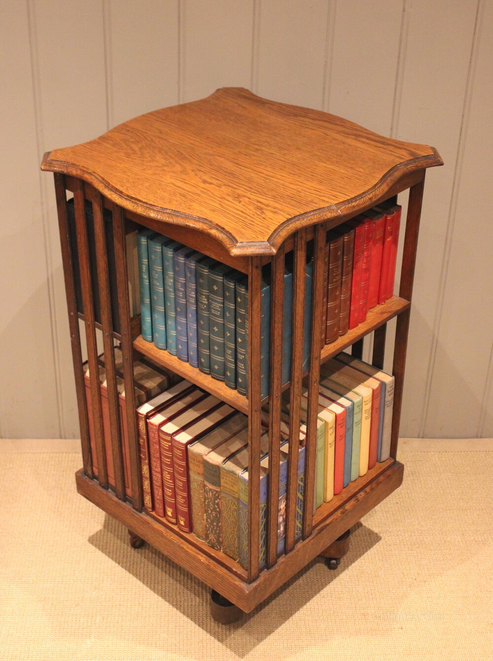 Oak revolving bookcase with a two tier structure with four vertical slats to each side on its original revolving base . The top book sections measure 15 cm deep x 25.5 cm high and the bottom are 22.5 cm deep x 34 cm high.