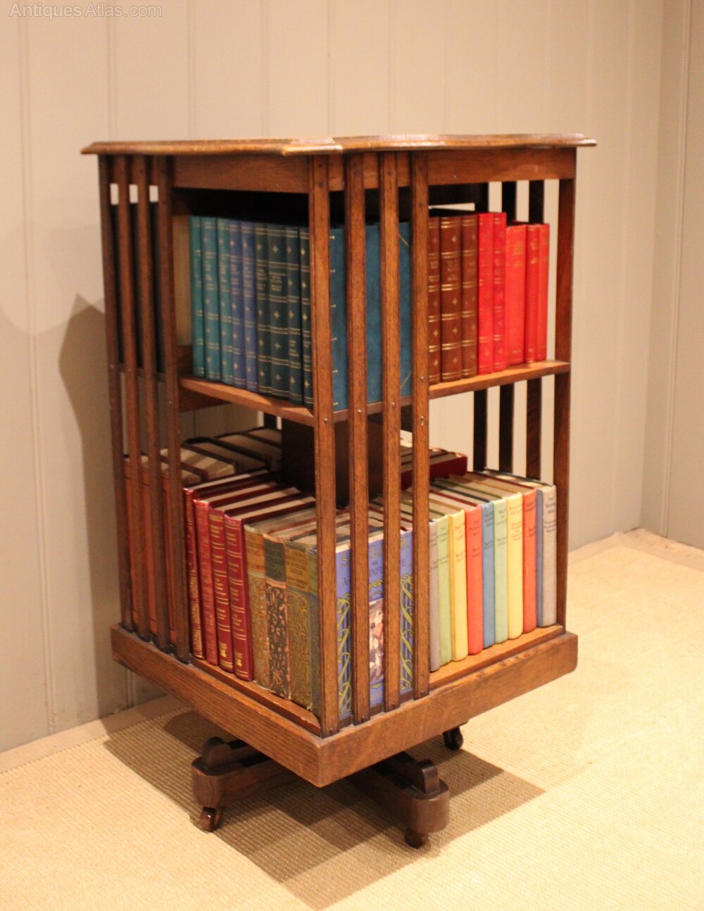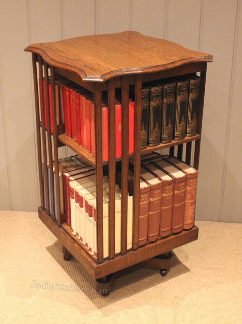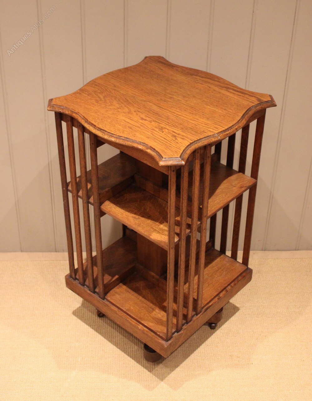 Oak revolving bookcase with a two tier structure with four vertical slats to each side on its original revolving base . The top book sections measure 15 cm deep x 25.5 cm high and the bottom are 22.5 cm deep x 34 cm high.