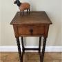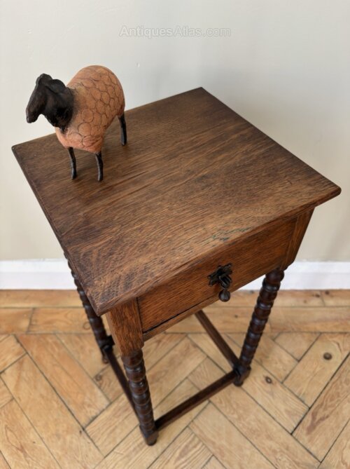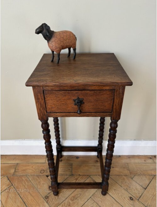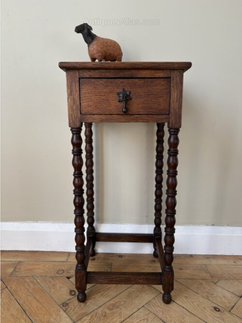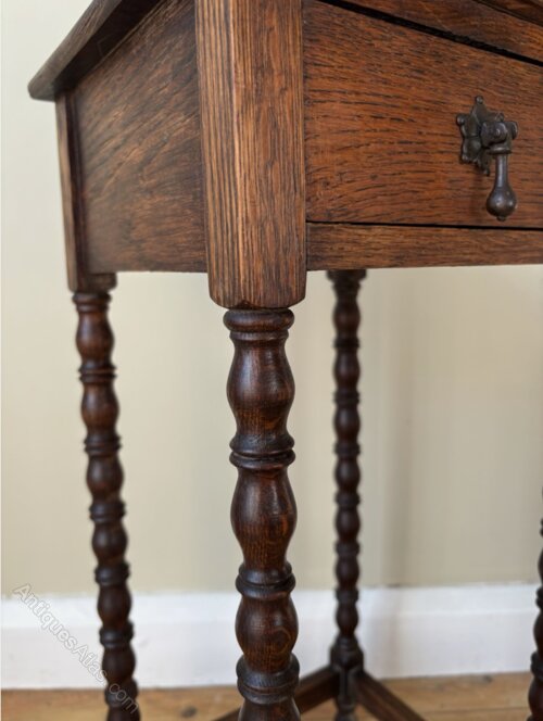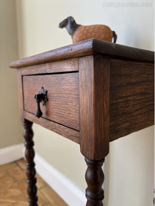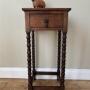 A great little table perfect for the smallest of spaces. Solid oak square top with tall slender bobbin legs and a little drawer at the front for tucking away those essentials. It’s in good sturdy condition with a small faint mark to the top surface its only flaw.