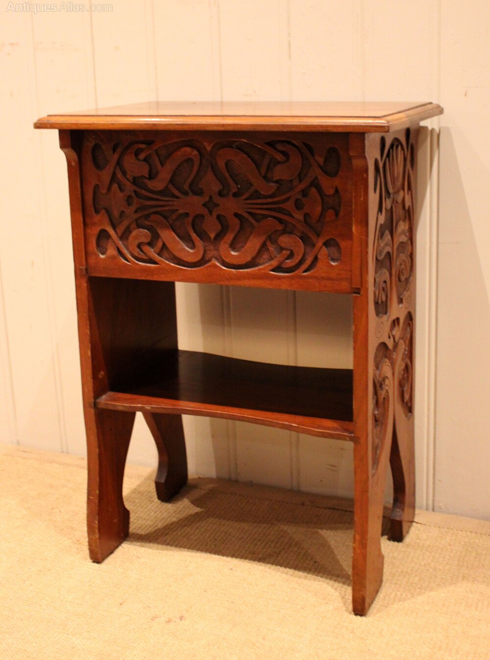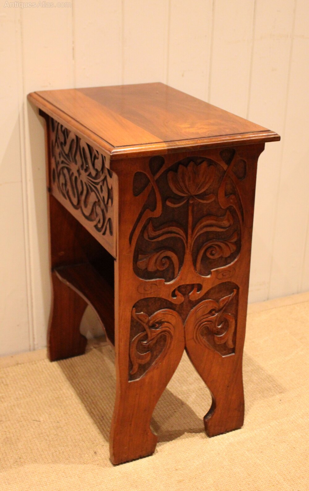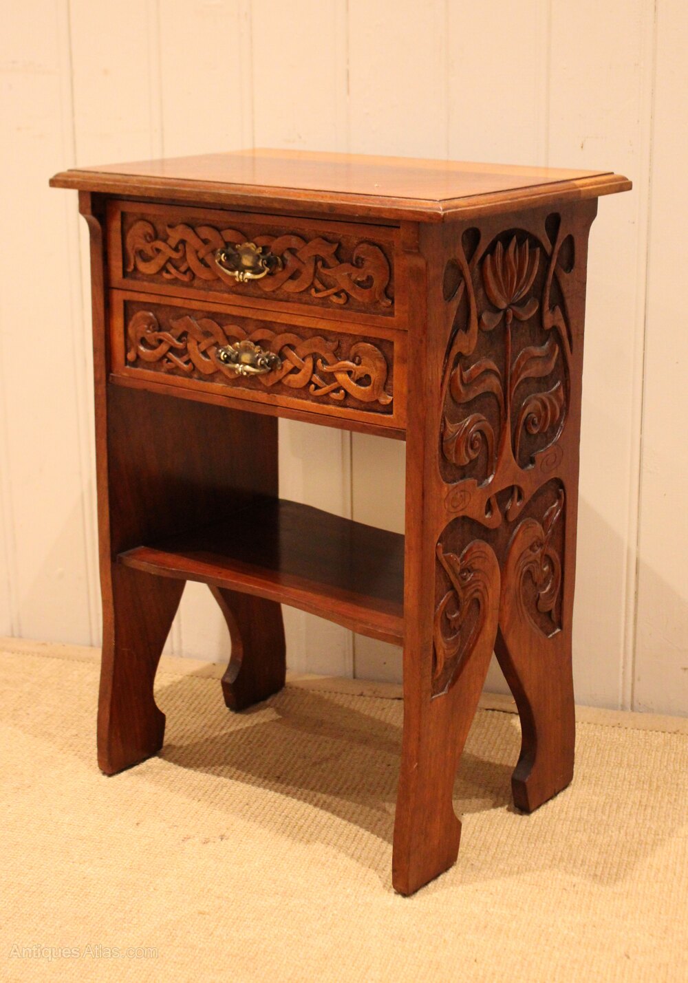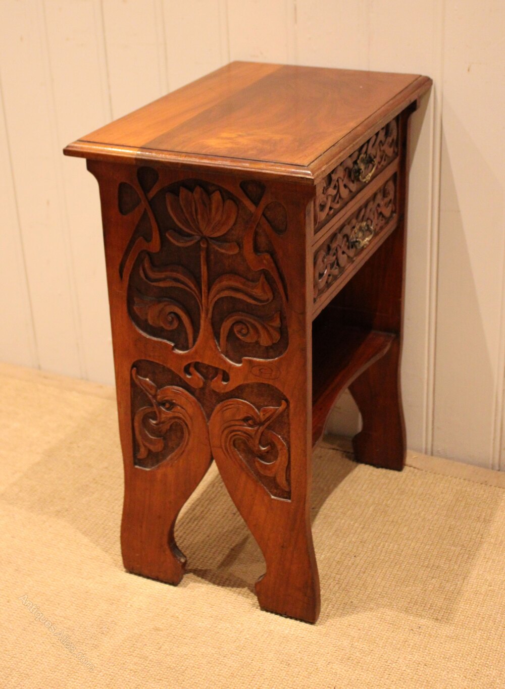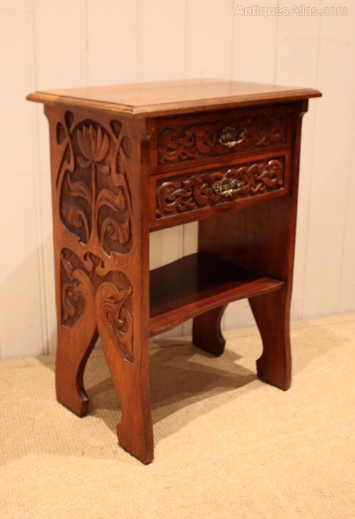 Solid walnut Art Nouveau cabinet having two drawers above an undertier , with heavily carved stylized floral sides , raised on shaped supports .