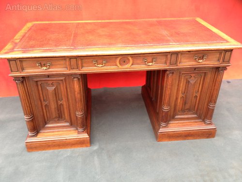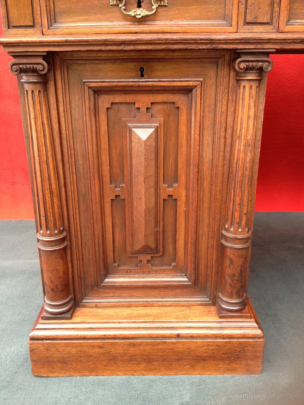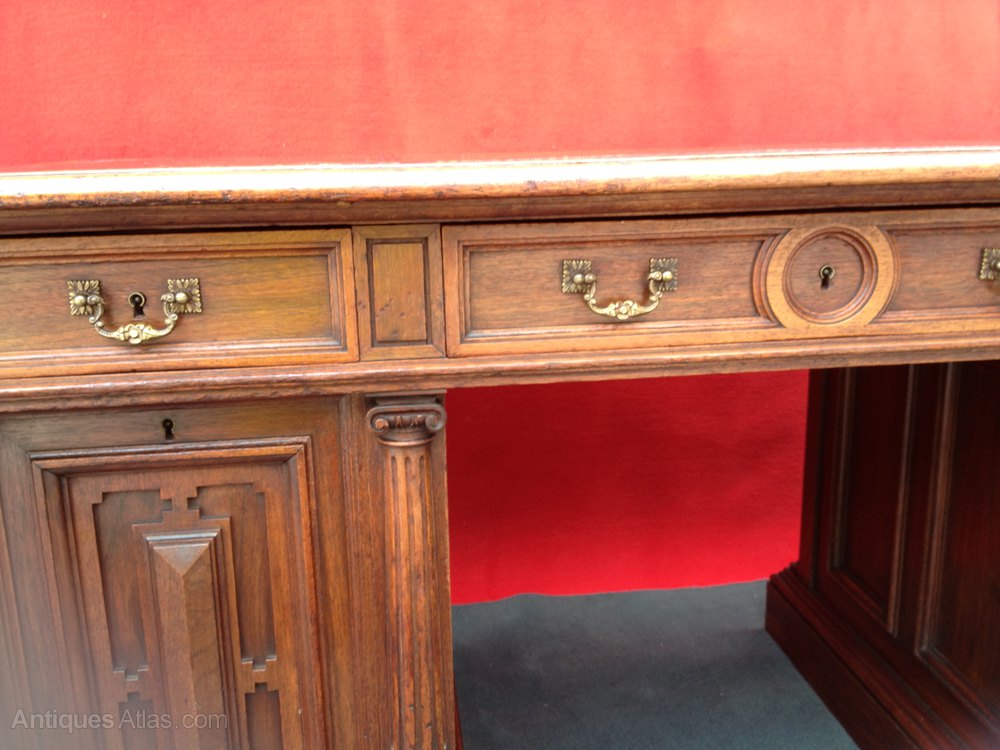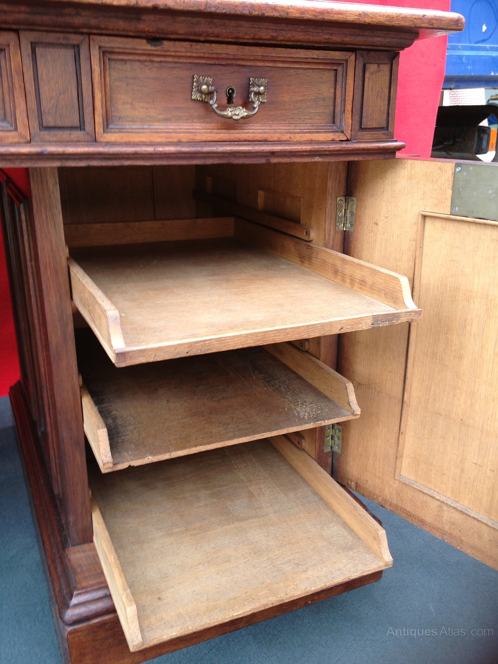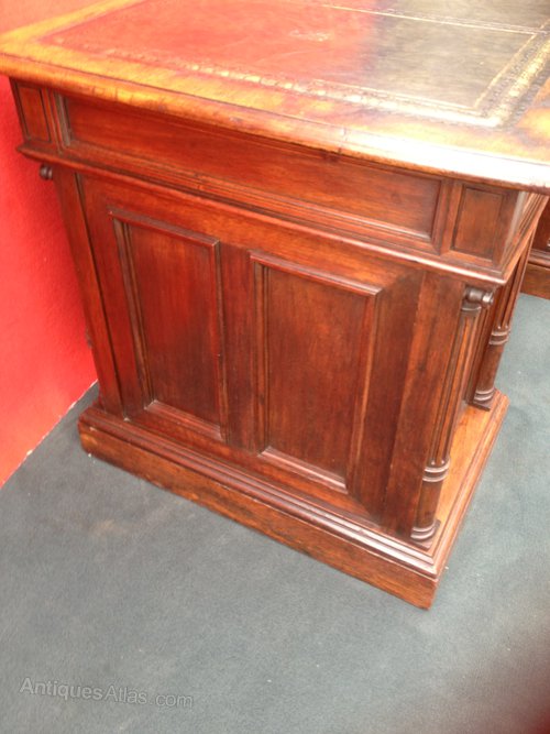 with inset green leather, 3 drawers across the top 2 doors with corinthium columns, behind 3 pull out slides. in original condition, panelled on all sides, mirror image to the back