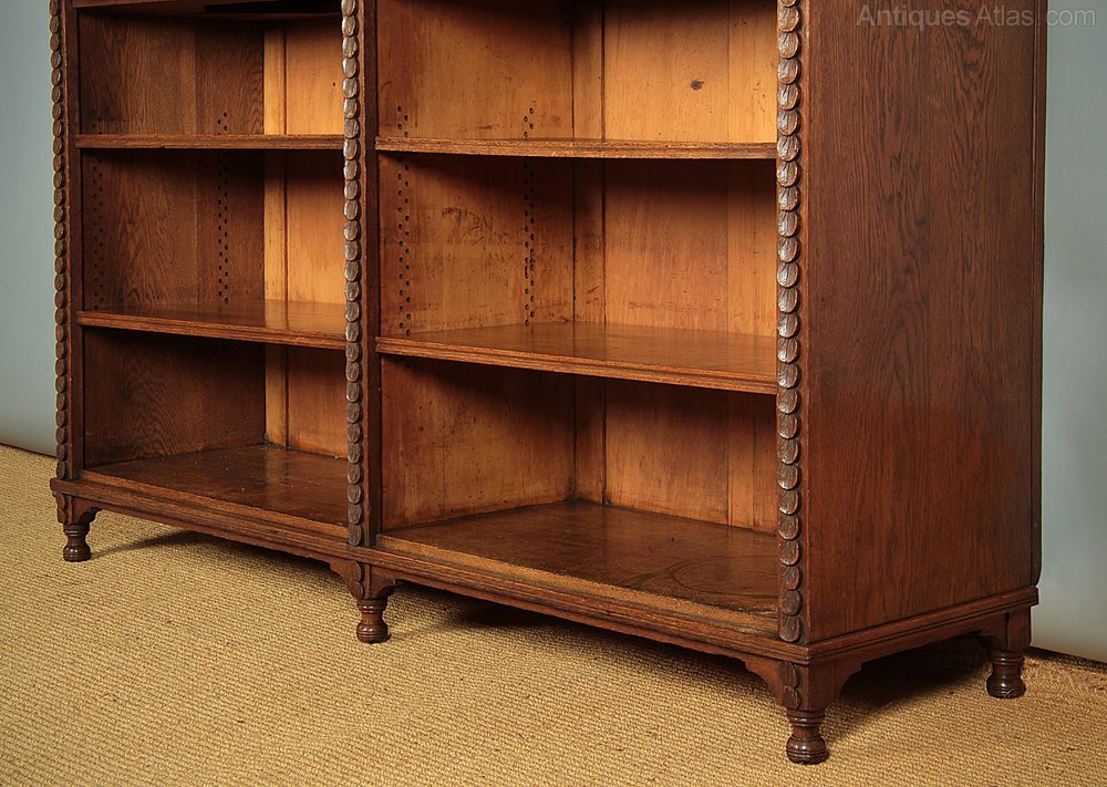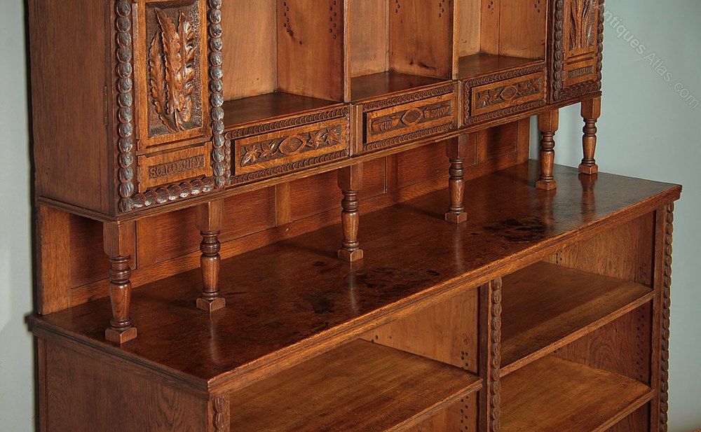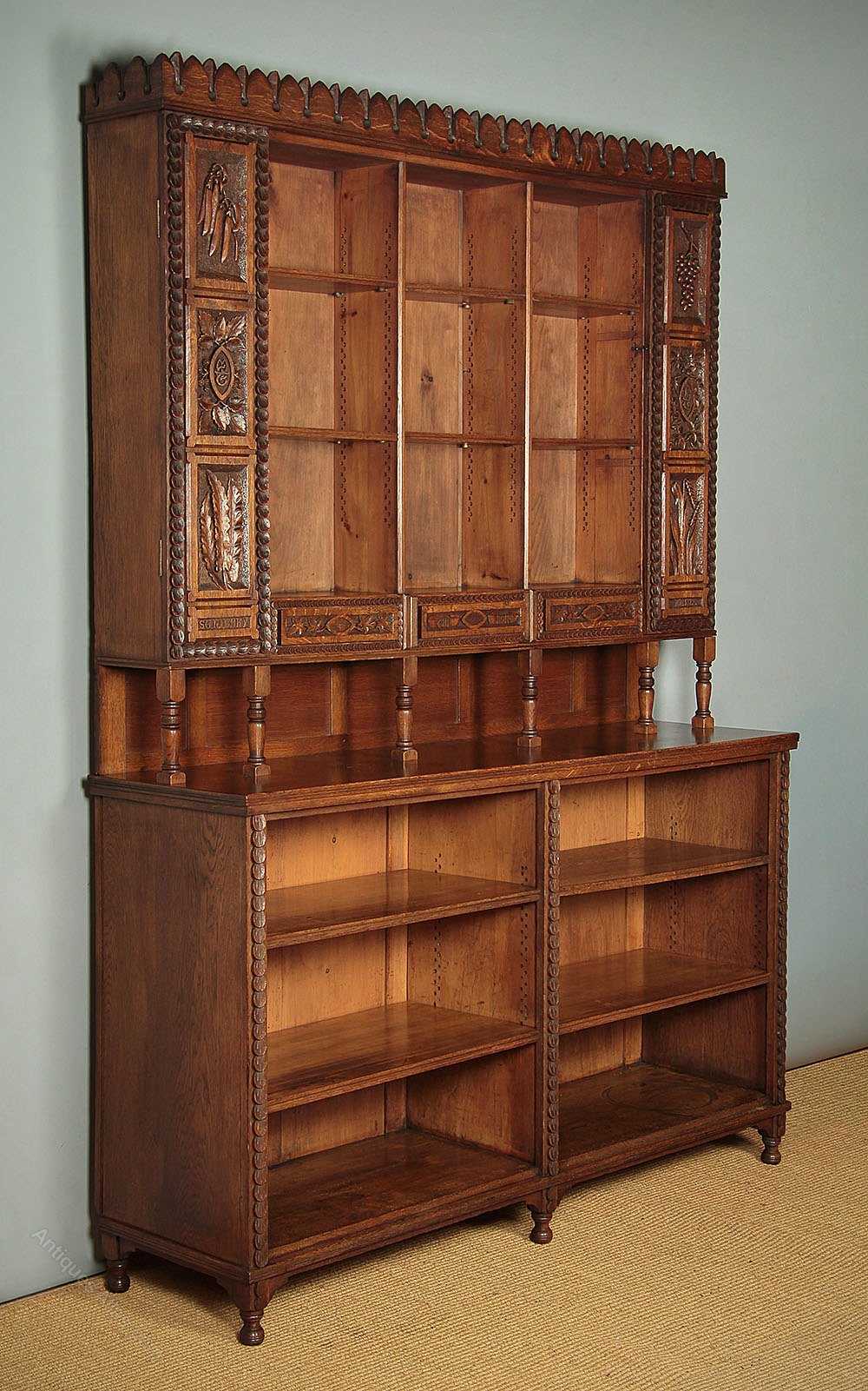 Unique 19th.c. carved oak dresser dated 1872. Ideal shelving in a kitchen or shop perhaps, it features a tall rack with six adjustable shelves arranged in three rows with three small spice drawers below and flanked on each side with long cupboard doors. Raised on turned spindles and a panelled back over a deeper open base with four adjustable shelves (15″ depth) and turned feet front and rear.