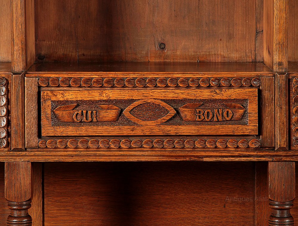Originating in the village of St Hilary the in the Vale of Glamorgan in South Wales, the village name is carved on the left hand cupboard door. St Hilary sits at the heart of an area well known for its agriculture and theme of harvest is represented in the carving on the cupboard doors which feature swelling pea pods, a bunch of grapes, ripe ears of corn and a long chard like leaf. Possibly commissioned as a wedding piece, the middle panels feature entwined initials set amongst blackberry and passion flowers, whilst the bottom of the right hand door is also carved with the date 1872. Topped with an unusual shaped cornice and with a repeated leaf detail to the front edges, the remarkable decorations are completed with rather enigmatic Latin phrase ‘Cui Bono’ (who benefits) carved on the front of the middle drawer. A repair to the cornice and some old marks to the top of the base, otherwise excellent original condition, cleaned and waxed in our workshops.