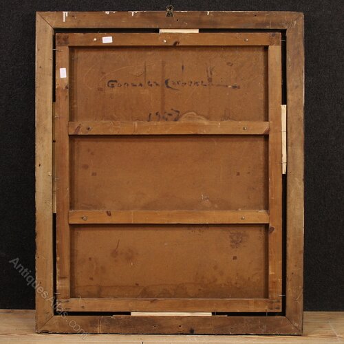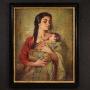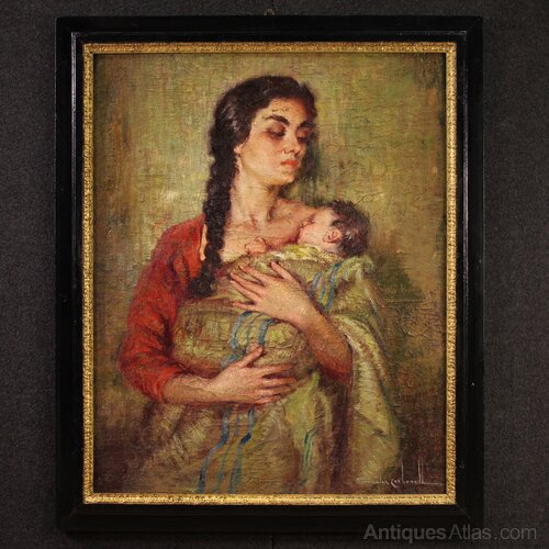 Spanish painting from the mid-20th century. Oil on canvas, glued on masonite, painting depicting Maternity, Woman with child in her arms of excellent pictorial quality. Painting of great pleasantness and good brightness, characterized by bright colors, for antique dealers, interior designers and collectors. Painting signed lower right (see photo) attributable to the Spanish painter Rosendo Gonzalez Carbonell (1910-1984) lacking authentication. Painting that develops vertically, of excellent proportion, complete with ebonized and gilded wooden frame. The woman's face has some small color losses (see photo), artwork overall with a beautiful patina and in good state of conservation. Internal size H 98 x W 79 cm.