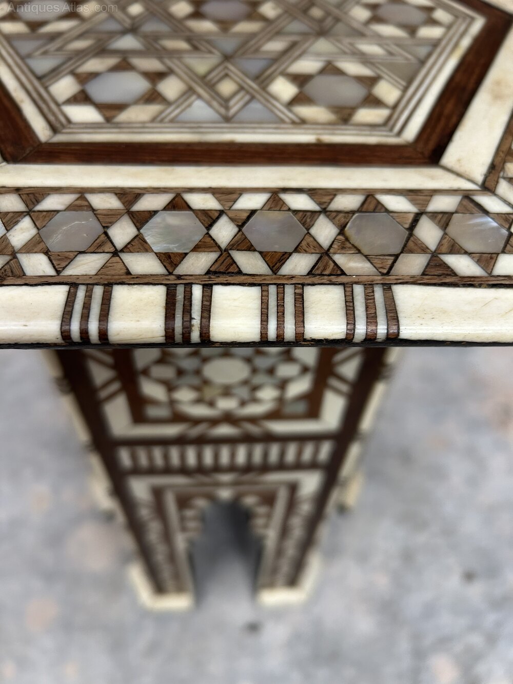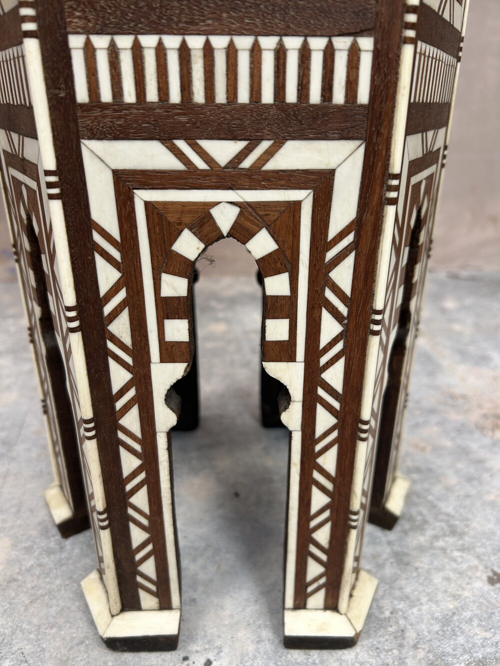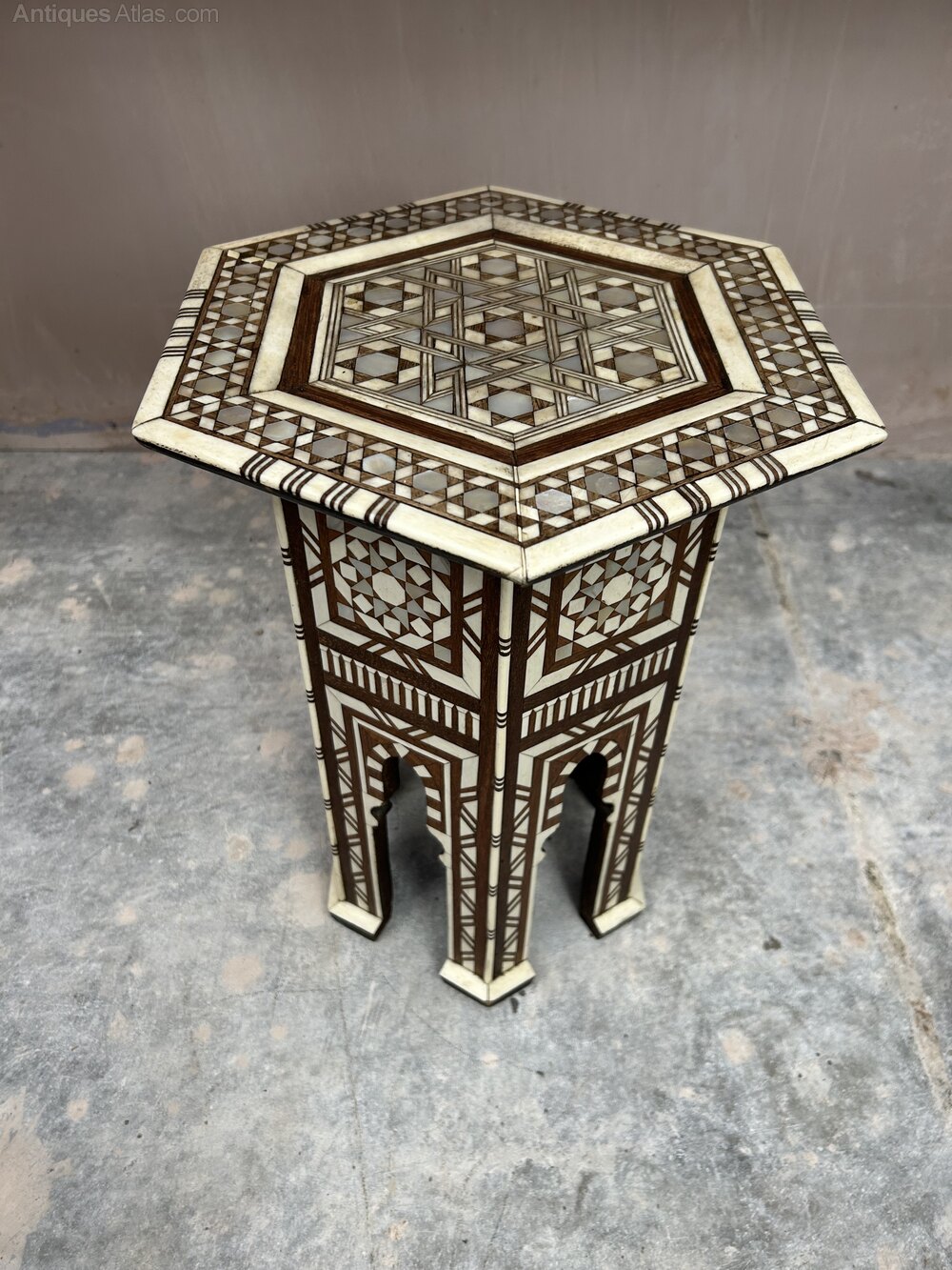 Syrian late 19 century bone & mother of pearl inlayed hexagonal table circa 1890 of outstanding quality and in excellent condition without any missing inlay and no filler.