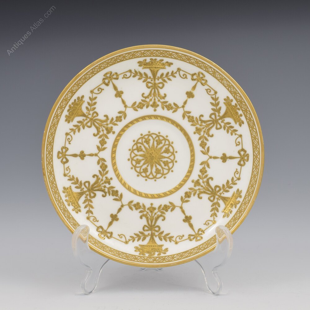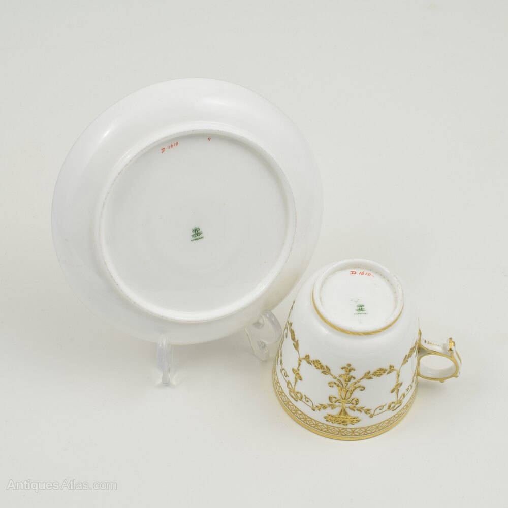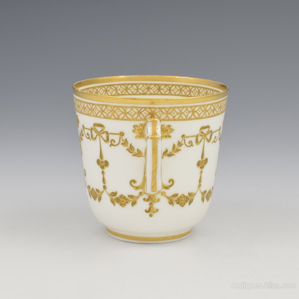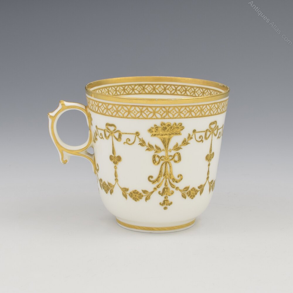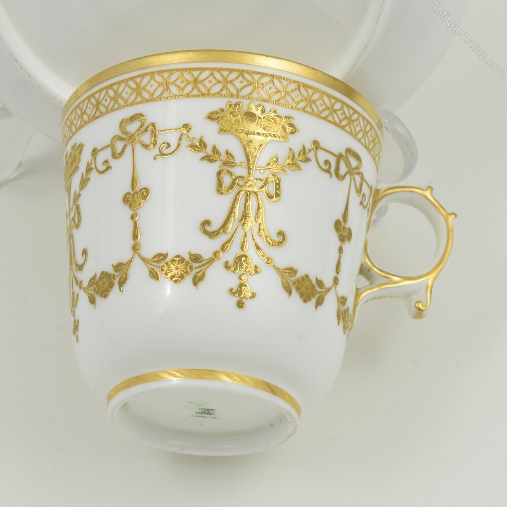 A very fine Copeland coffee cup and saucer with stunning, ornate, raised and tooled gilt decoration of stylised floral garlands, cornucopias, ribbons and swags. Geometric borders and rims and the unusual looped handle with spiked spurs is also carefully picked out in gilt and the centre of the saucer has a superb raised star with intricate knotted design and tooled detailing. Factory stamp to the bases and pattern number painted in red D1610, c.1860.