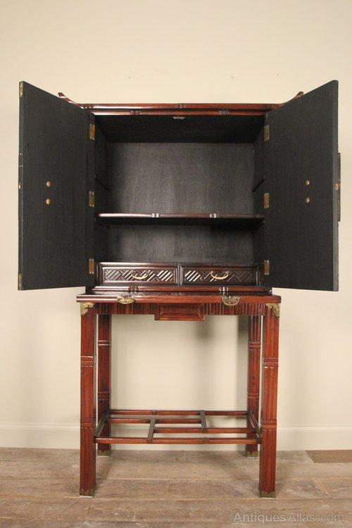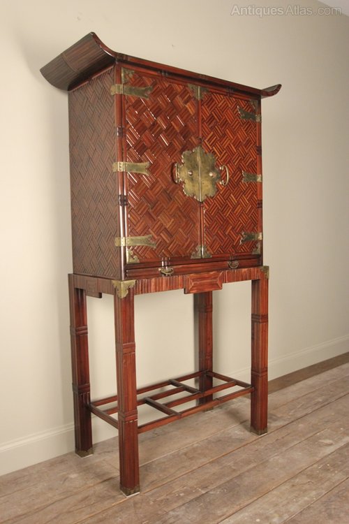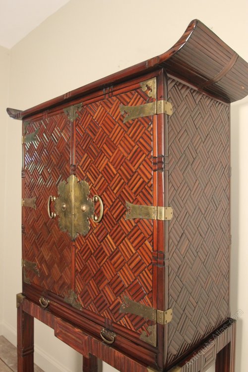 A oriental bamboo cabinet of striking appearance, emphasised by the brass strap hinges and locking plates. The cabinet having a pagoda top with bamboo lattice doors and side panels, wonderful rich colour throughout. The whole raised on 4 brass capped legs and adjoined by decorative stretchers. Having a single adjustable shelf and 2 drawers to the interior, along with a full width bamboo lattice pull-out slide. Excellent condition and colour throughout. please note the cabinet lifts off the base section for transportation.