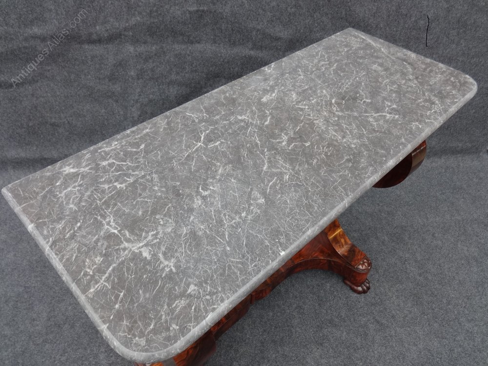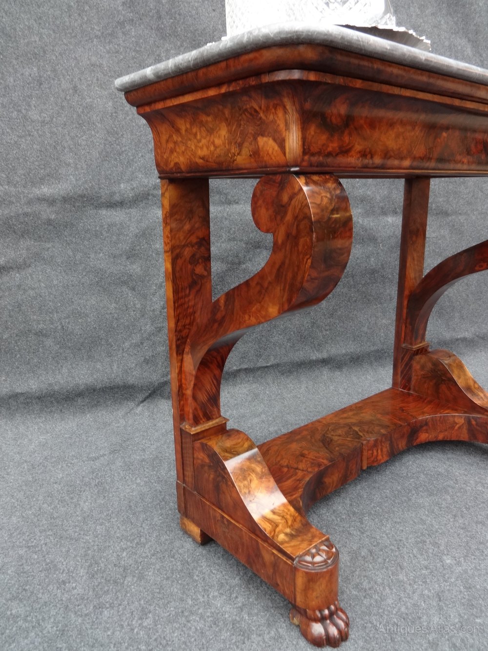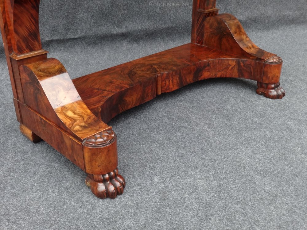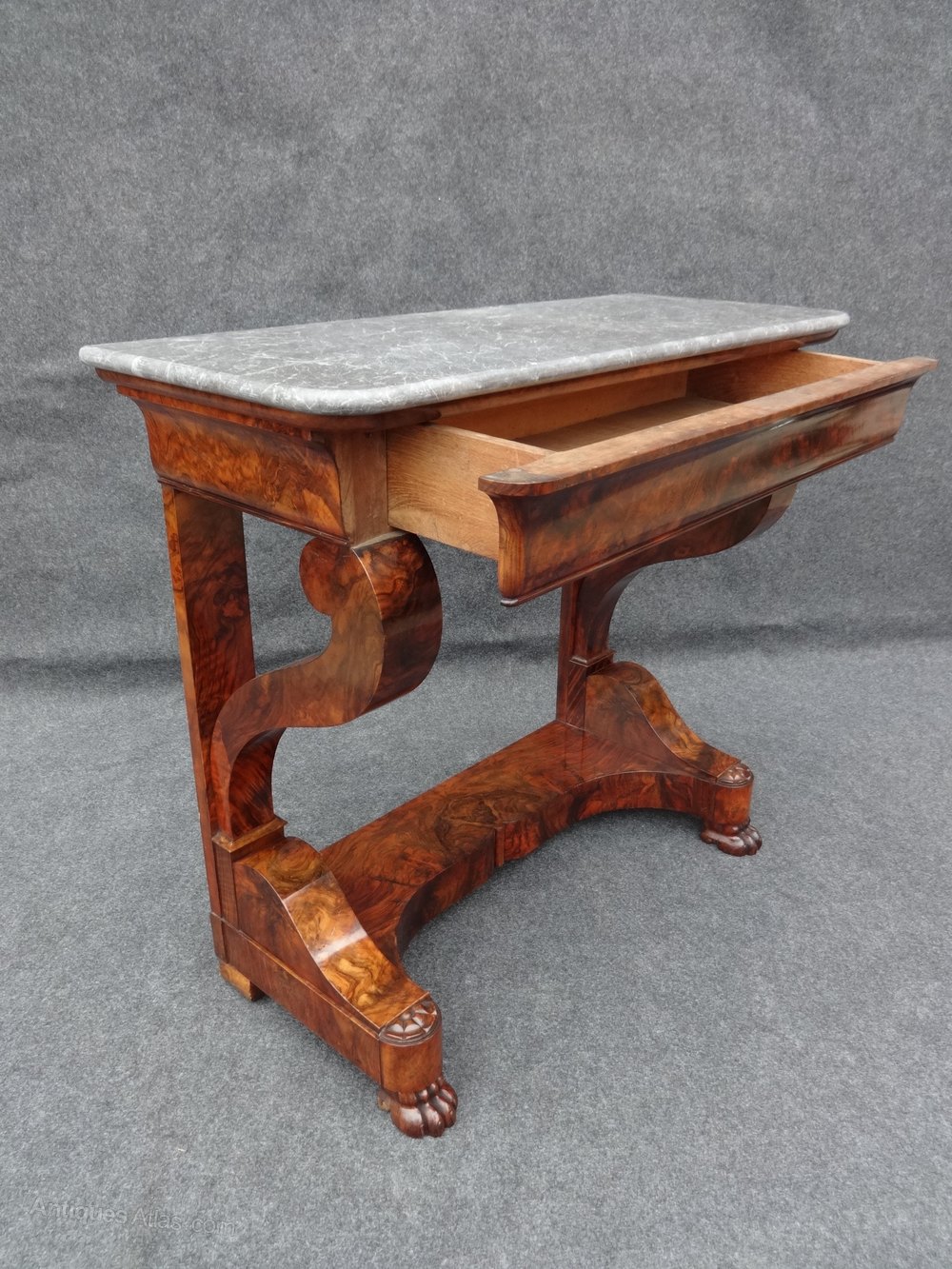 Superb quality French figured walnut console table, central drawer, standing on lions paw feet, lovely marble. excellent colour and condition.