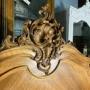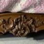 The headboard has a very intricate acanthus leaf with floral carving.