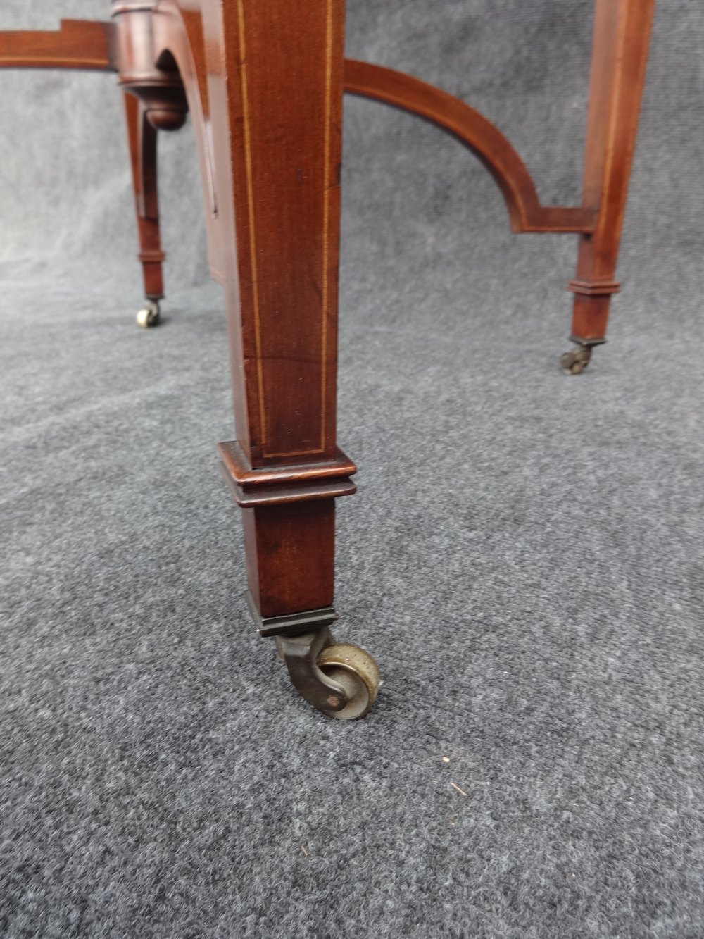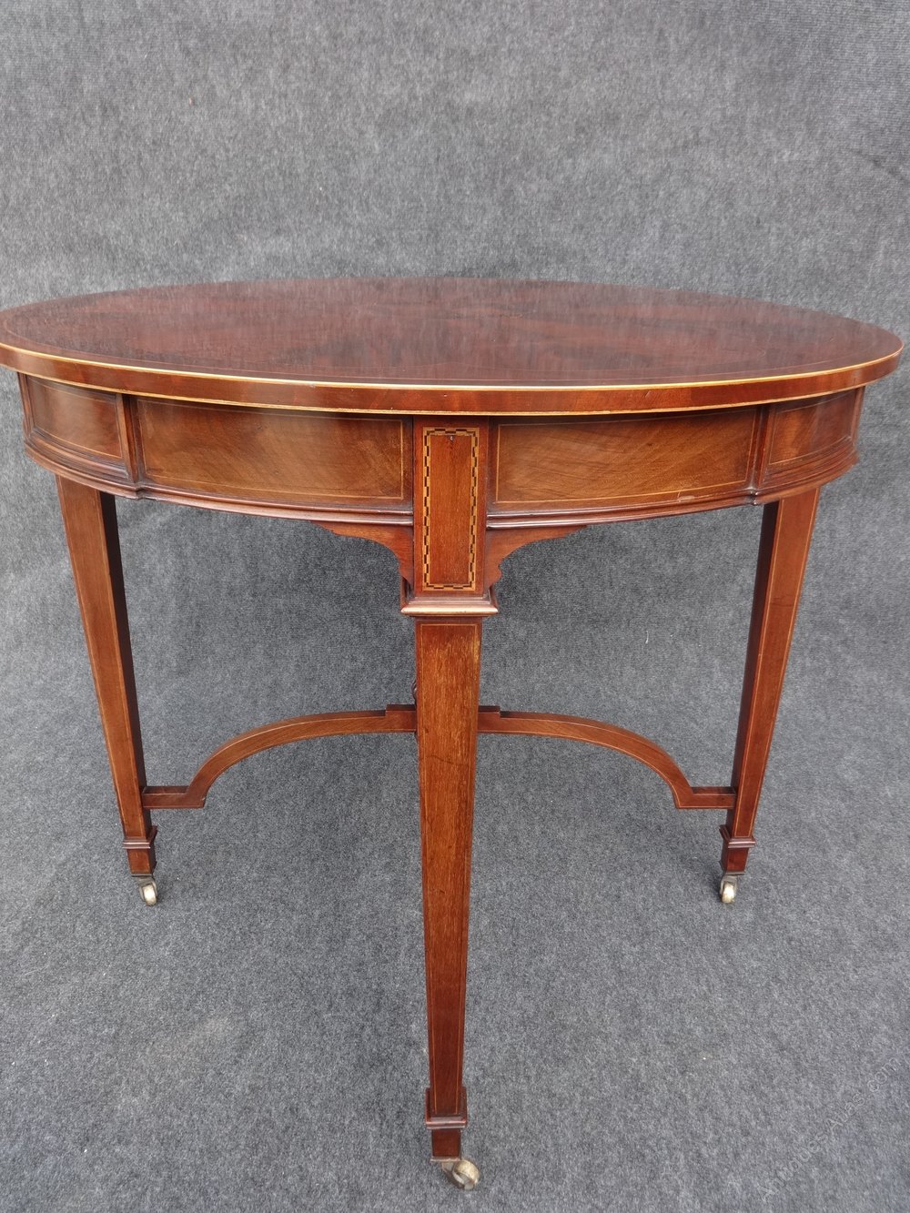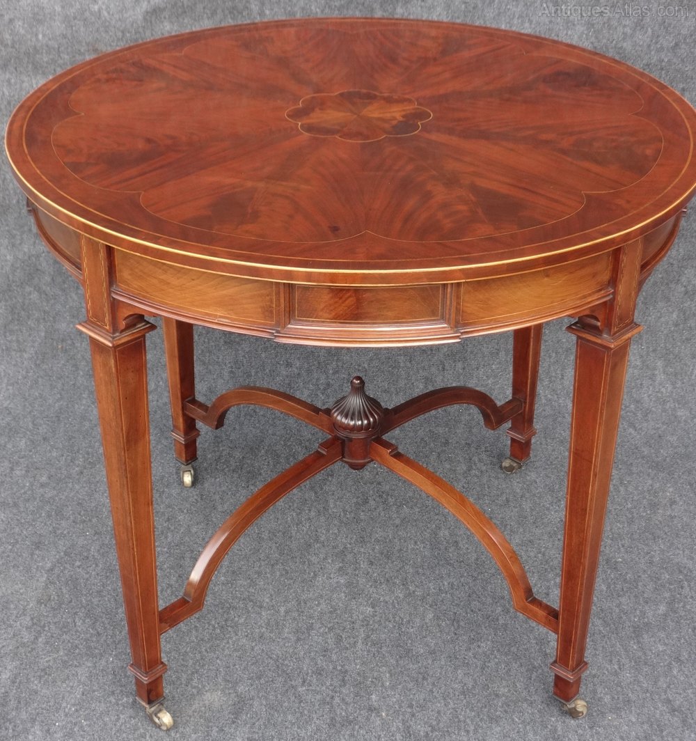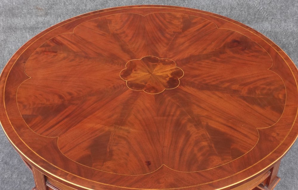 A stunning and quite large mahogany inlaid center table, standing on tapered legs with brass castors, mahogany urn to the understretcher, segmented top with central flower motif, boxwood stringing.
