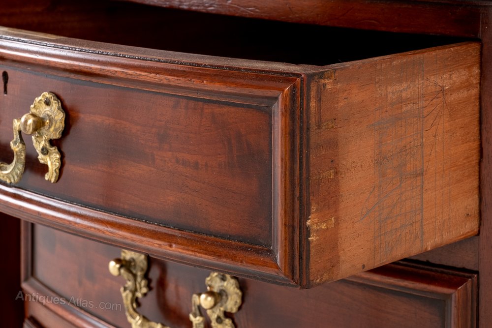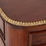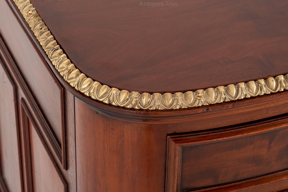 These wonderful chests of drawers stand upon a plinth base with 4 graduated mahogany lined drawers. The drawer fronts feature very high-quality timbers and retain their original cast ormolu swan neck handles. The tops of the chests also feature cast ormolu mouldings. The sides of the chest being of a panelled form. Presented in good condition.