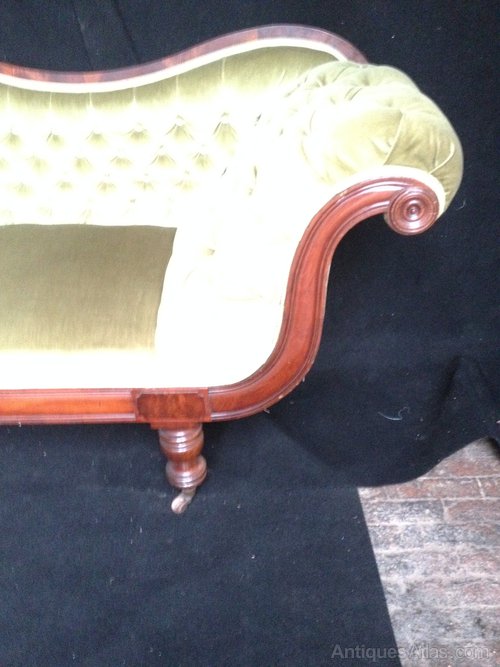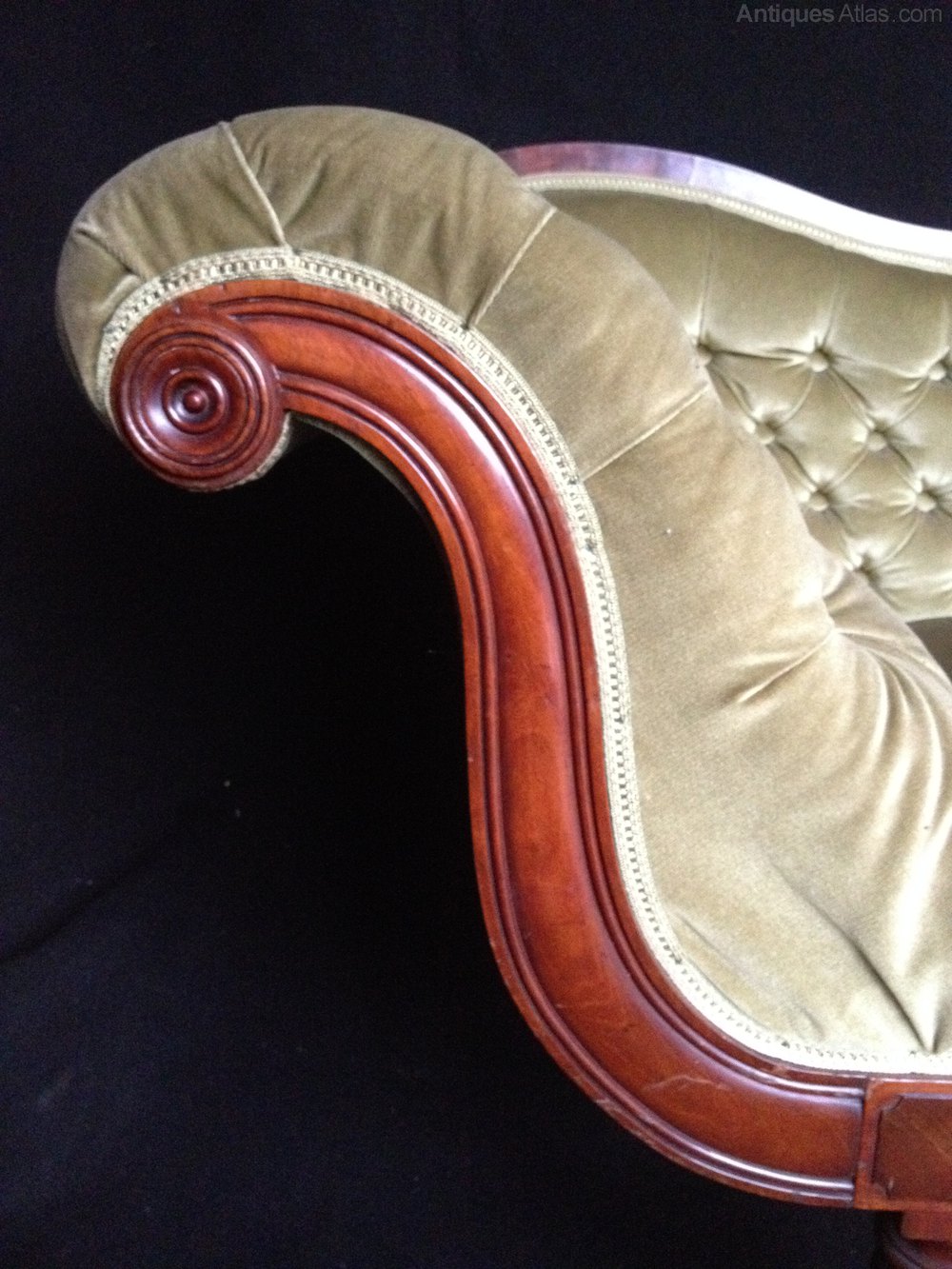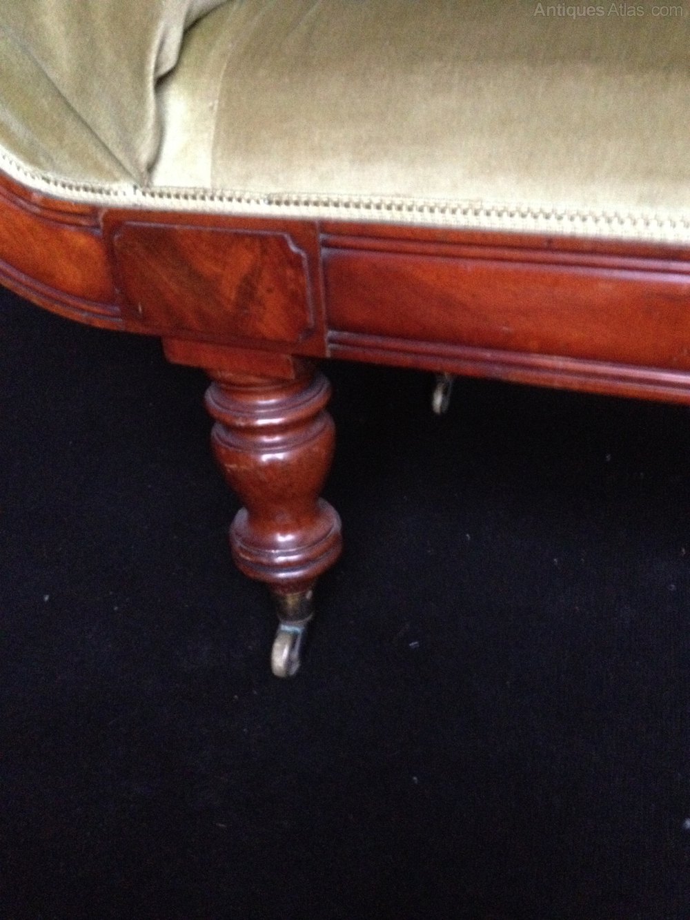 turned mahogany legs with brass castors, good mahogany frame, upholstered in green velvet in very good condition.