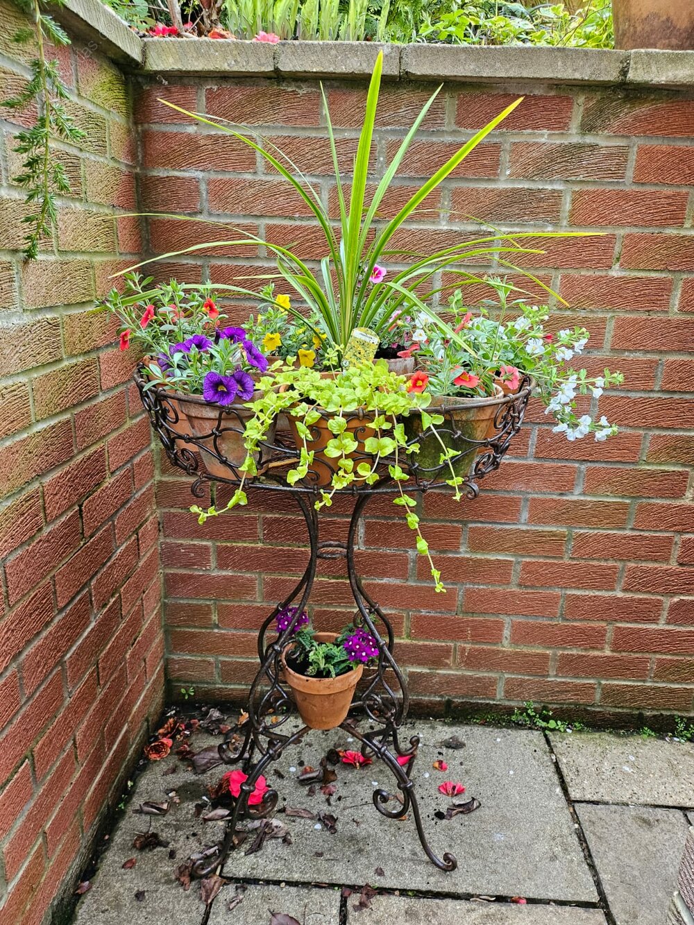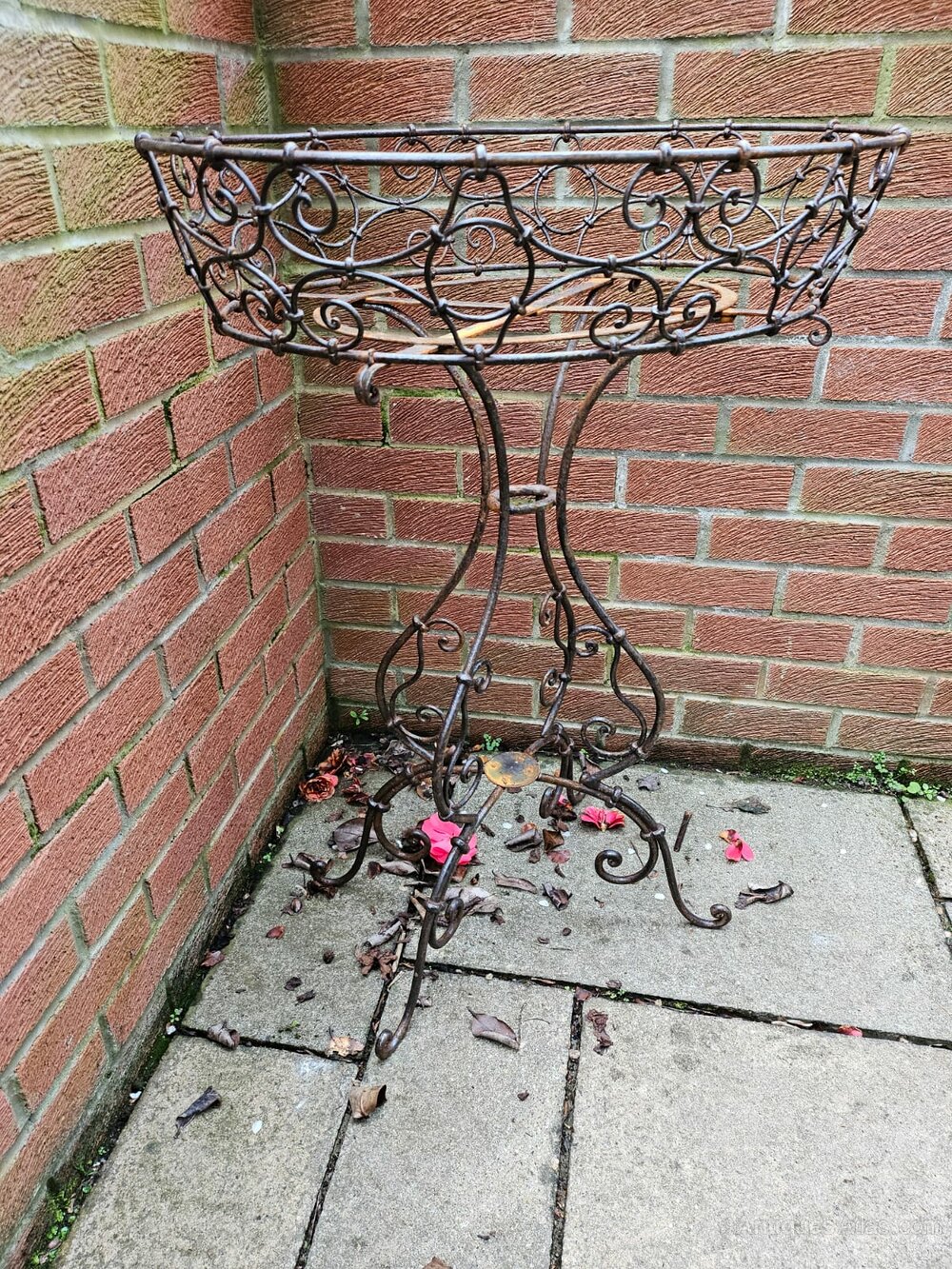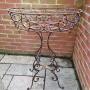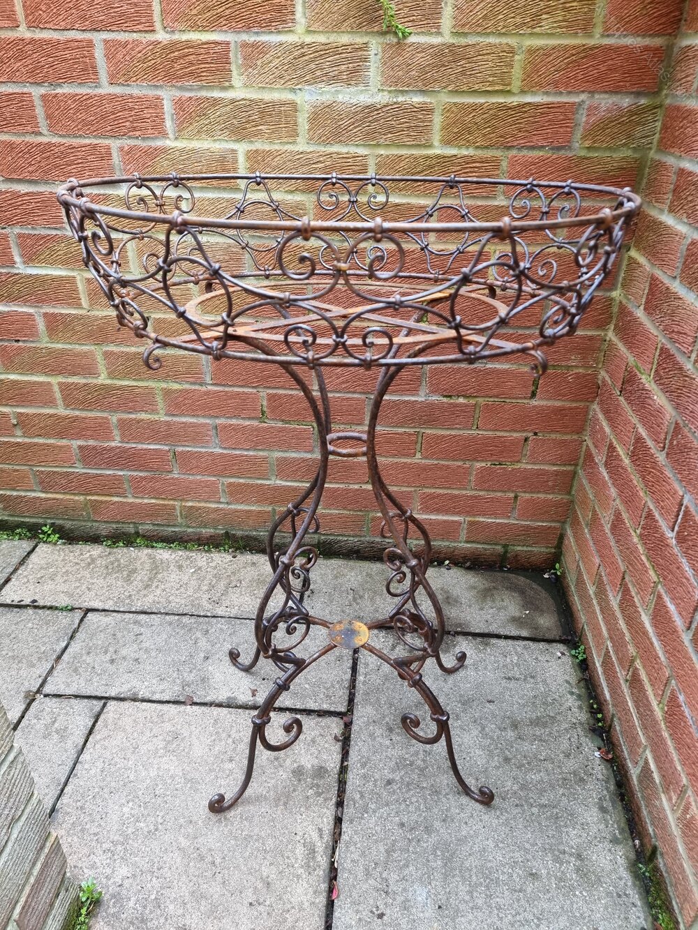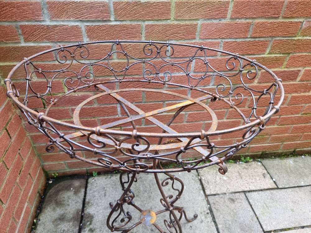 Handsome wrought iron basket plantstand. Very sturdy and sound, black, illustrated here with various pots with flowers. A wonderful addition to the garden and patio.