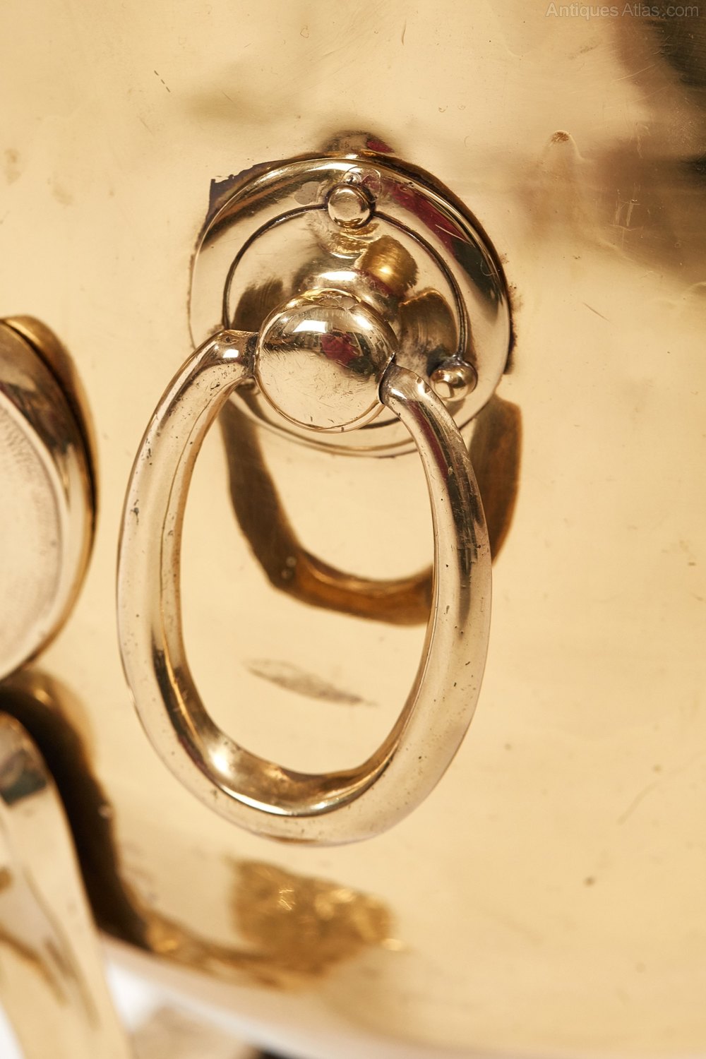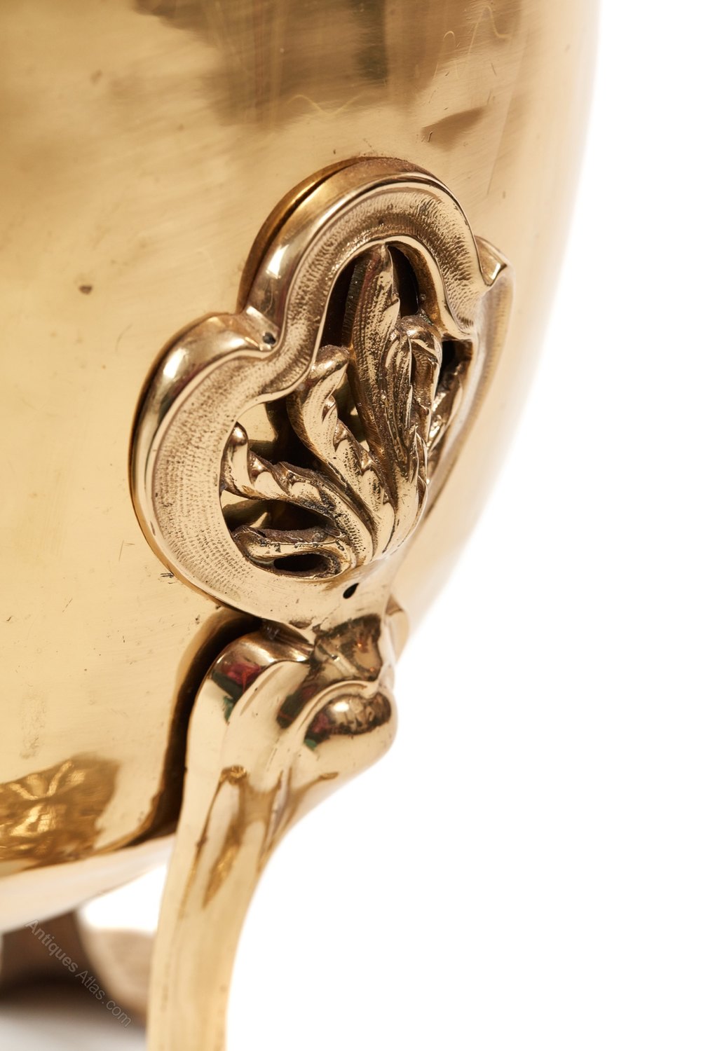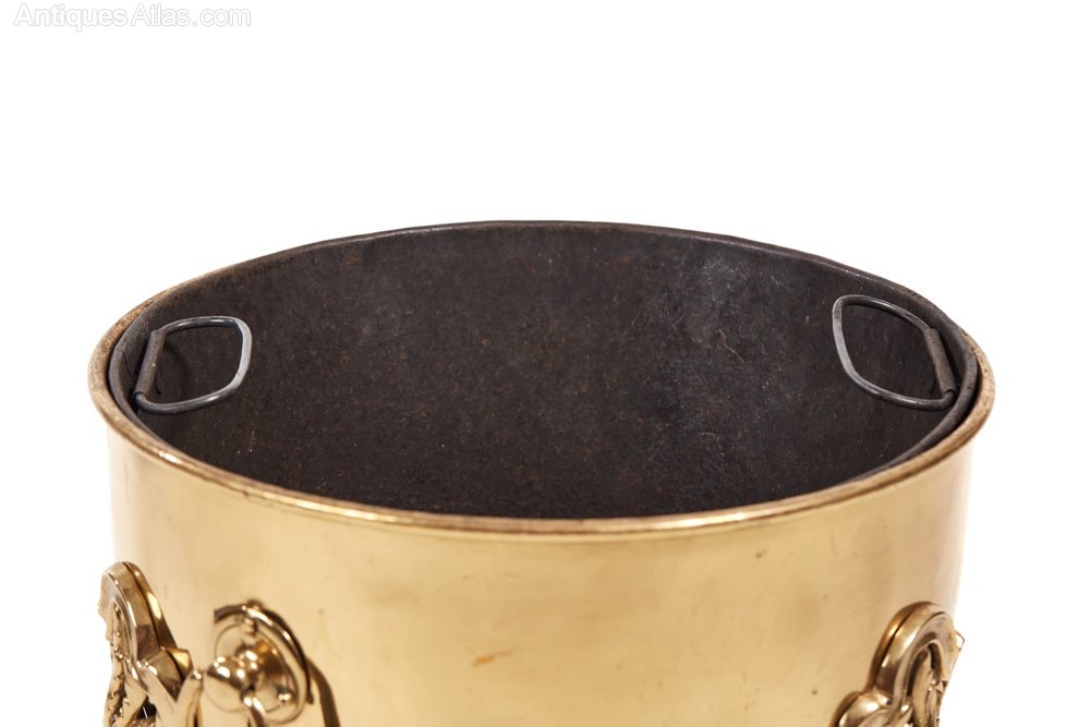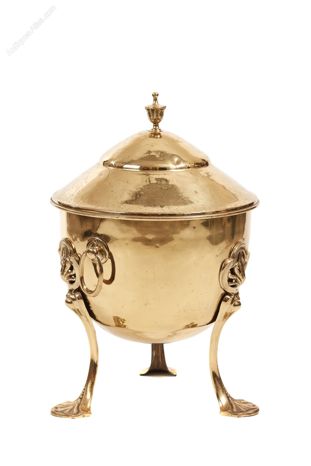 A Stylish brass art nouveau coal bin,having original lid and liner,brass carrying handles,standing on lovely shaped brass legs