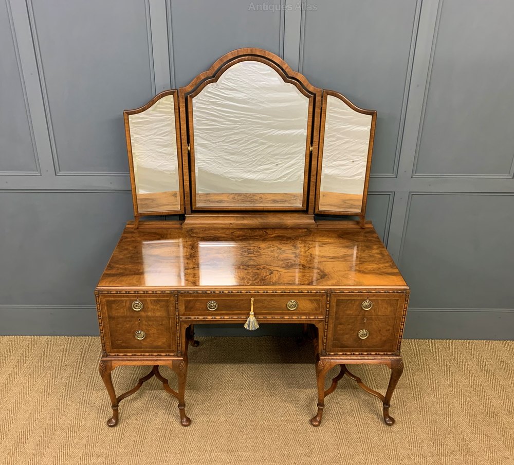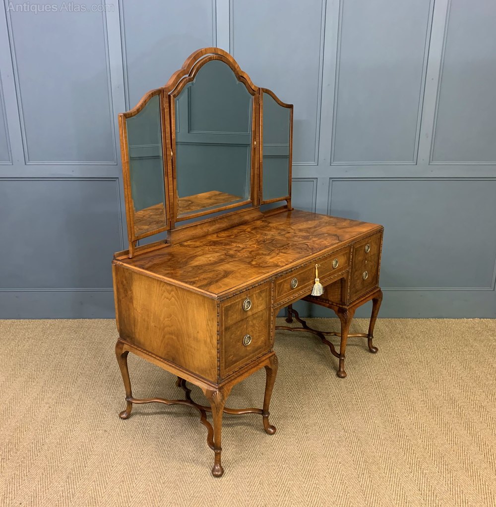 An excellent queen Anne style burr walnut dressing table of generous proportions. Very well constructed in solid walnut with attractive burr walnut veneers and mahogany drawer linings. The triple mirrors are adjustable and in very good order. The table has an arrangement of 4 short drawers flanking a longer central drawer. All standing on elegant cabriole legs with carved shell motifs to the knees and united by wavy form x-frame under stretchers. Sympathetically refinished in our workshops and now offered for sale in excellent condition with a great colour and patina, ready to go straight into the home.