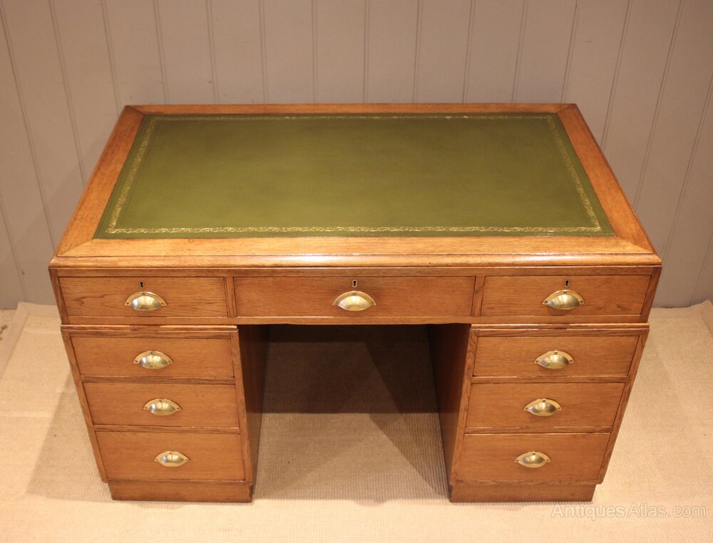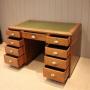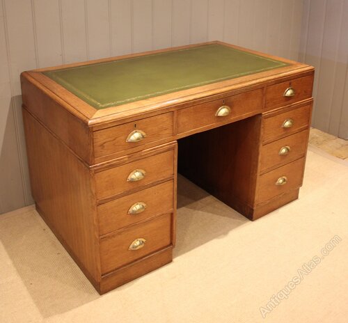 Substantial light oak pedestal desk having a tooled leather top above a single drawer flanked by a further four graduated drawers to either side , raised on a plinth base . The pedestal measures 59.5 cm high and 48 cm wide .