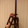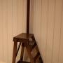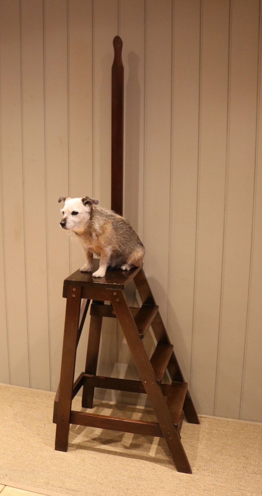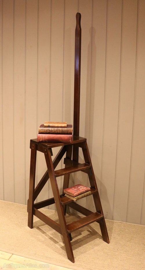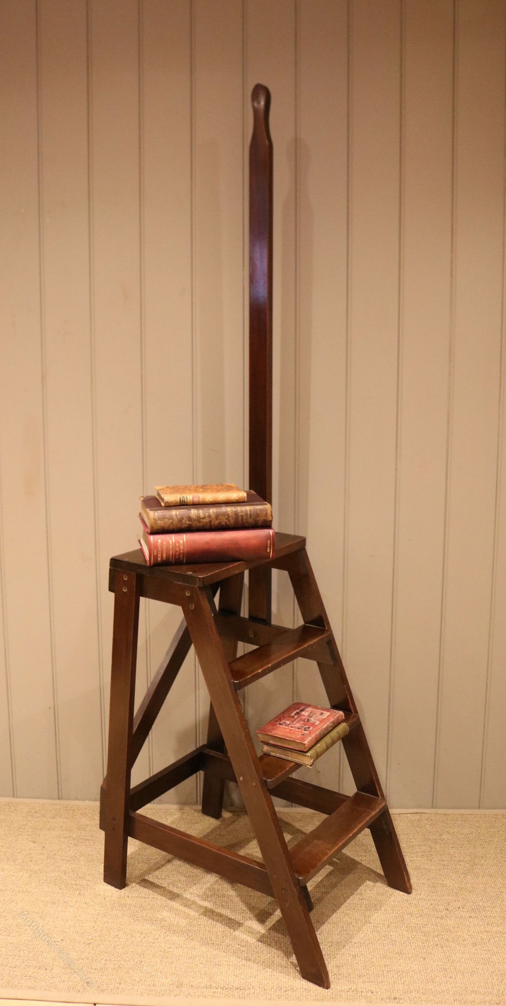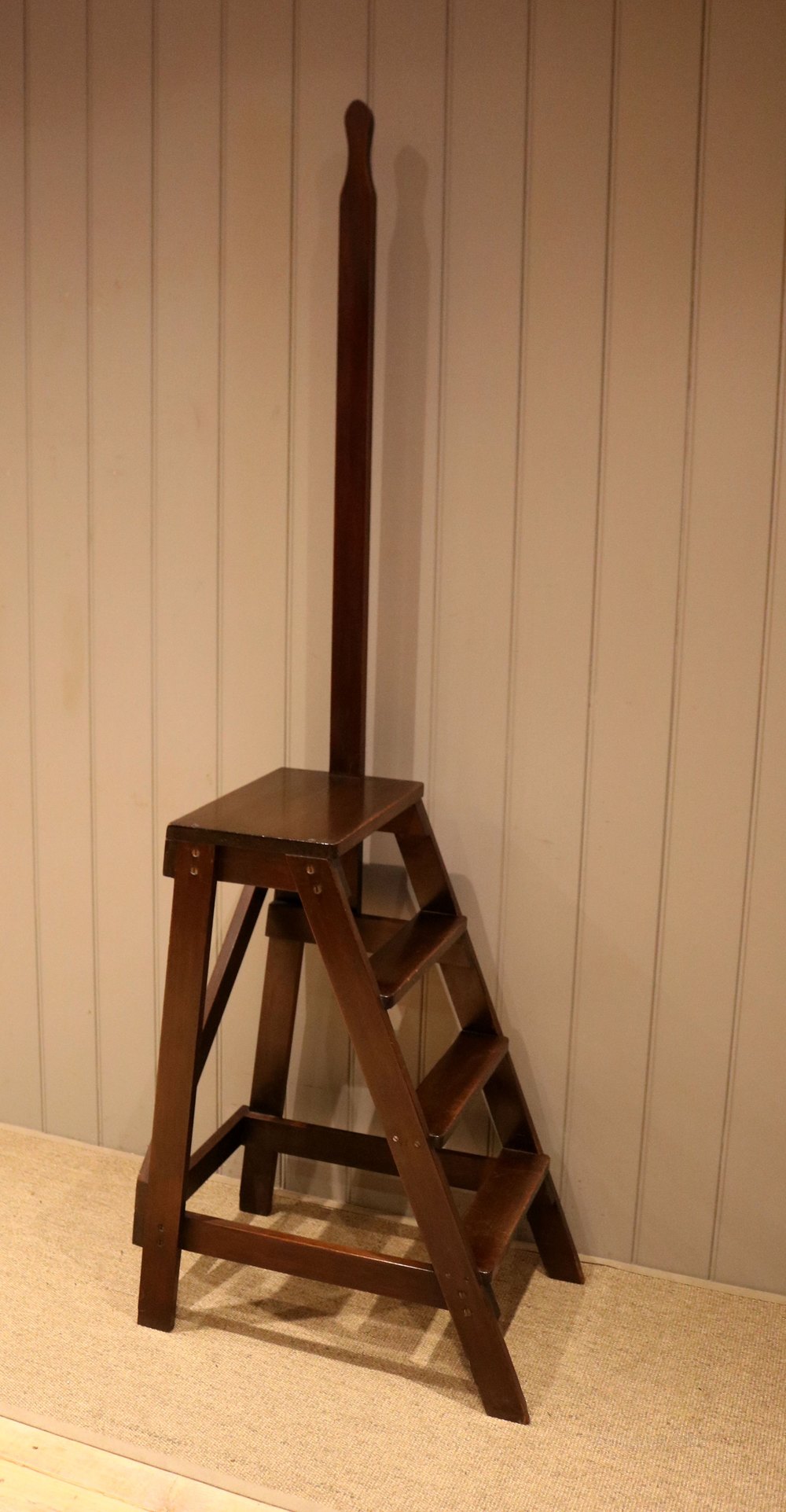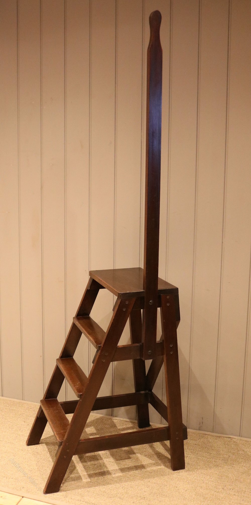 Substantial mahogany library steps / shop ladders having three seperatetreads with a rectangular platform having a verticle hand pole . The rear section uprights are united by stretchers . The height of the platform is 86.5 cm