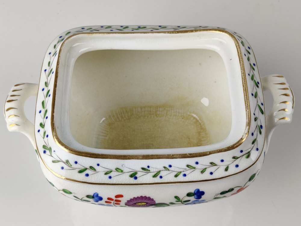 A gorgeous 19th Century, hand painted polychrome Sucre (Sugar Bowl). This piece is not marked, but is in great condition with no cracks or chips. There is a small amount of staining on the inside. A beautiful item which is very functional, and would look great anywhere.