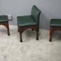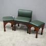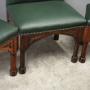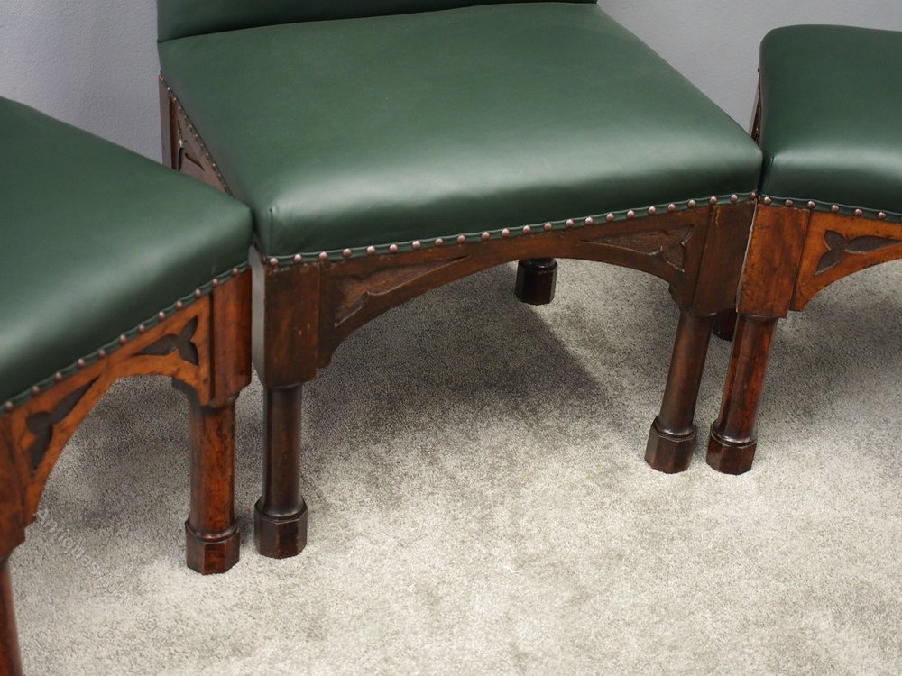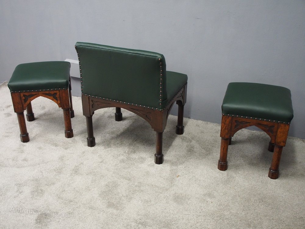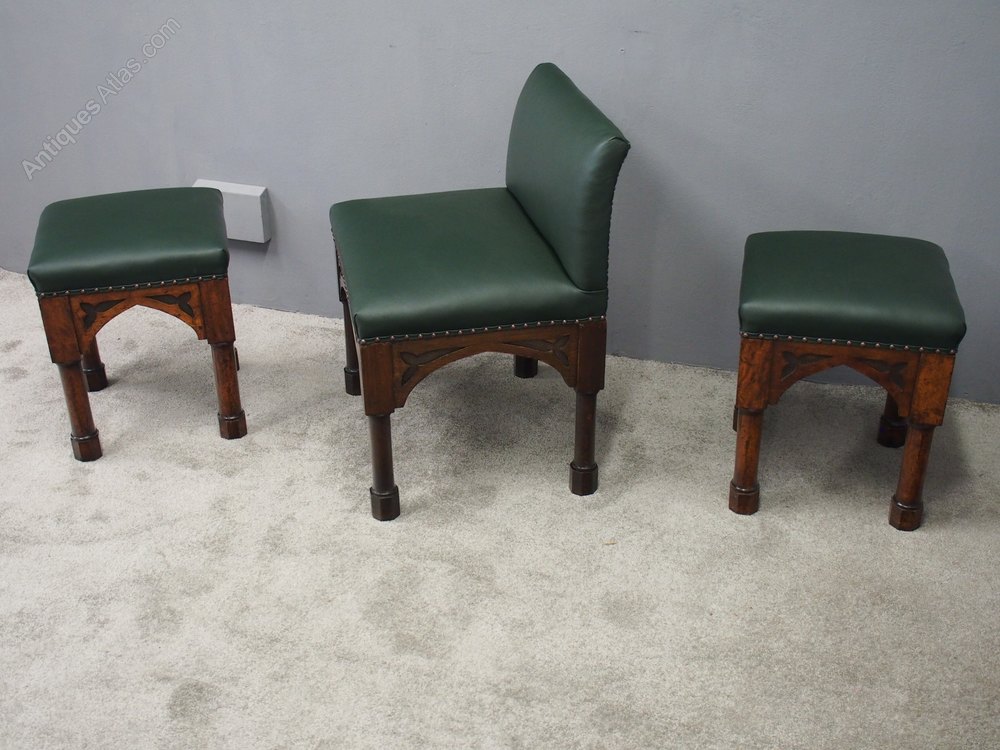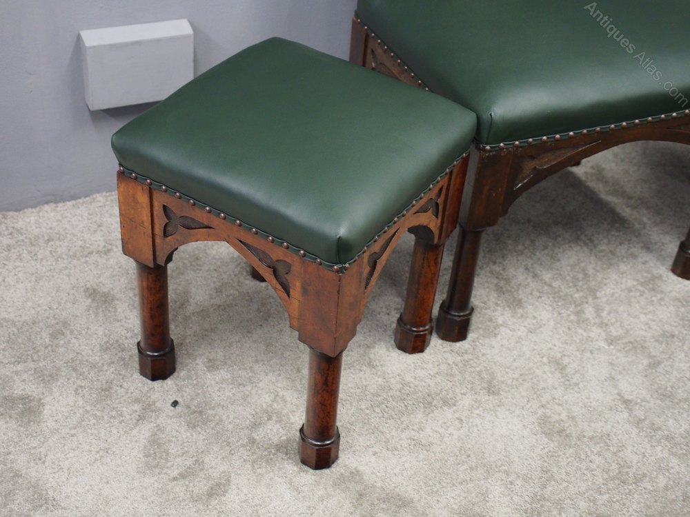 Circa 1890, rare suite of 3 late 19th century Gothic stools, all upholstered in quality green hide with brass studding. The largest with a low back and arched aprons with Gothic trefoil design over turned legs and unusual octagonal feet along with pair of matching square stools.