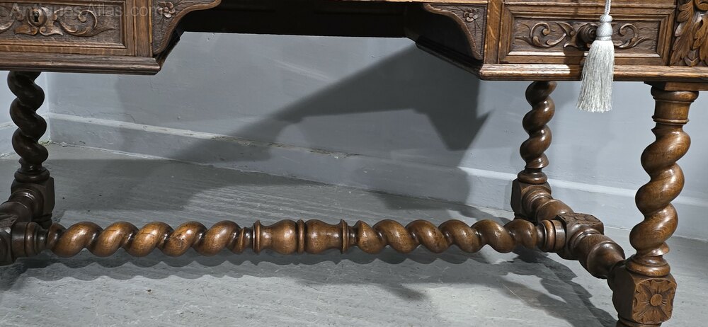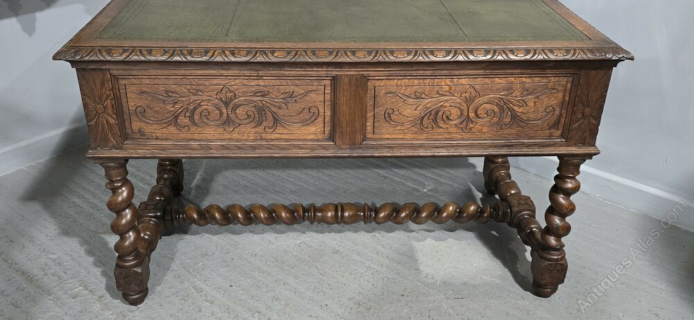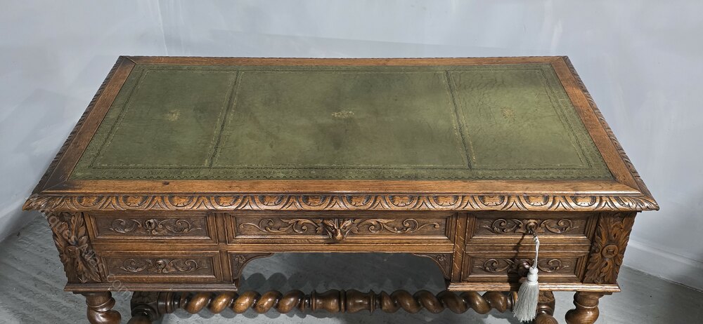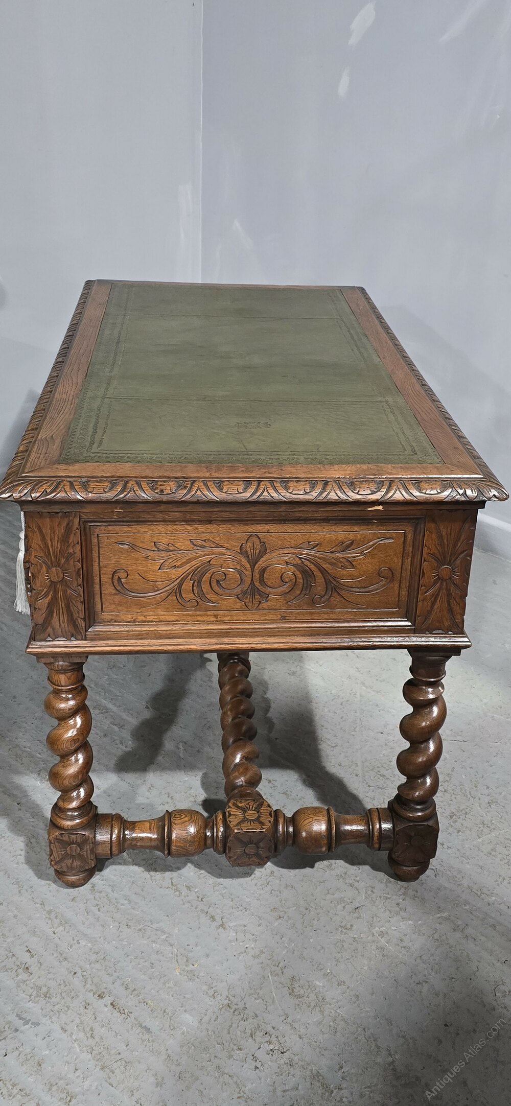 A very good green man carved oak desk, twisted legs and stretcher, green tooled leather top, freestanding, in overall very good condition.