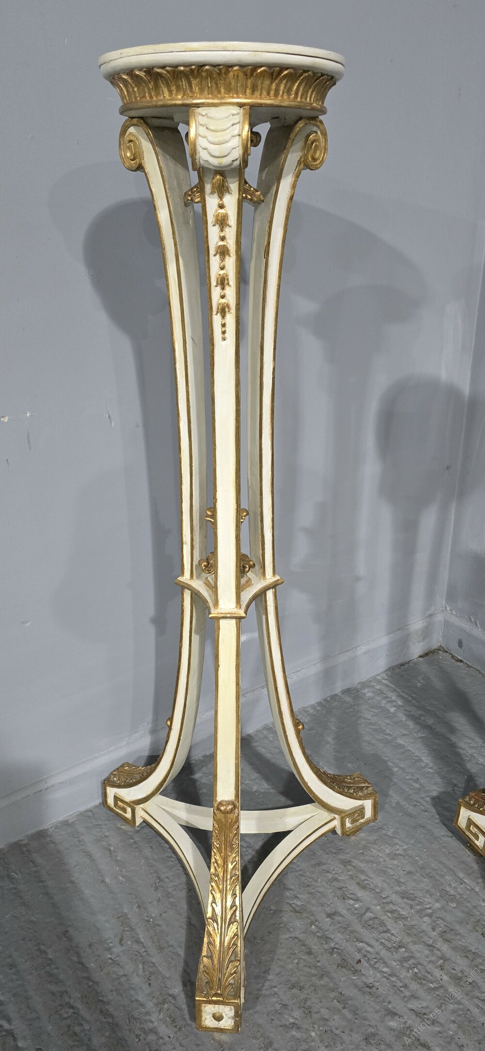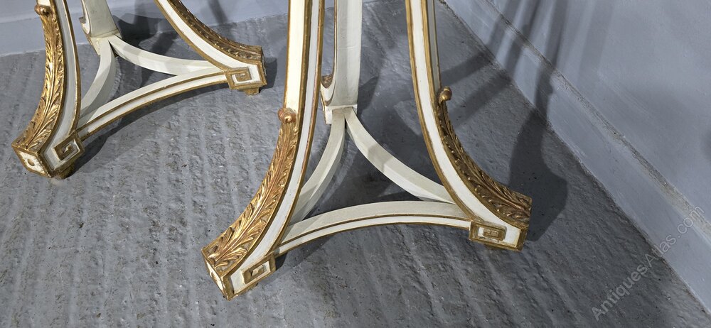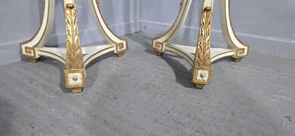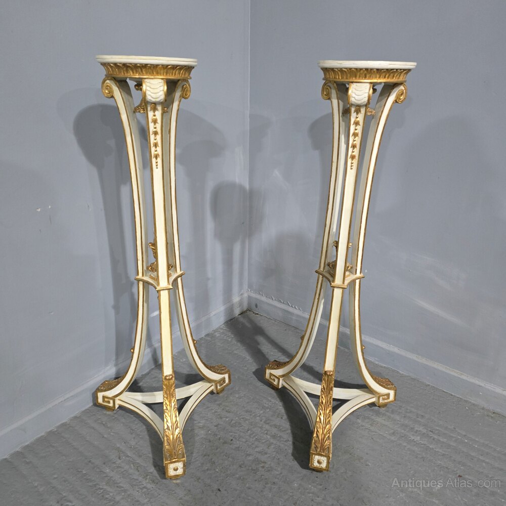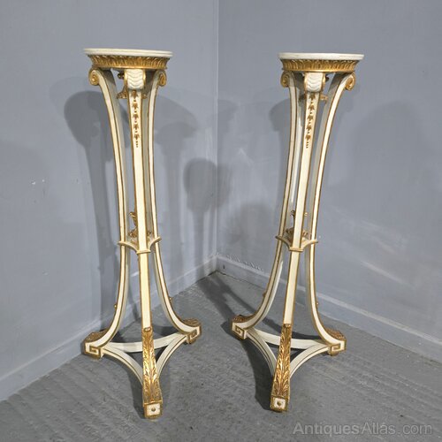 Very nice pair of English painted torchere stands oil and water parcel gilded, in very good overall condition.