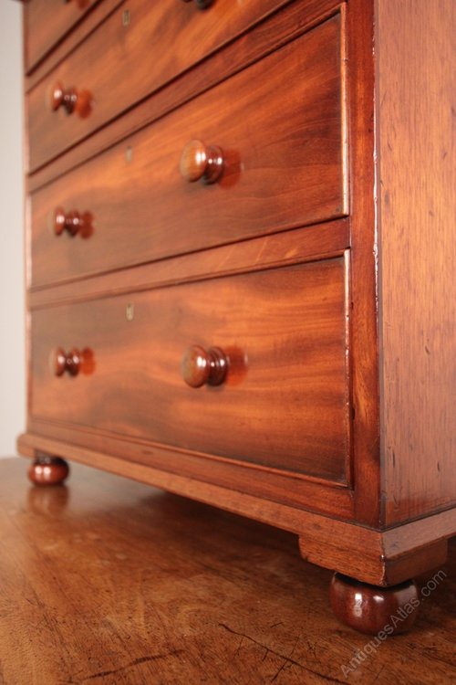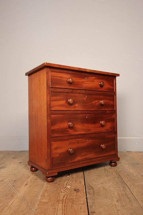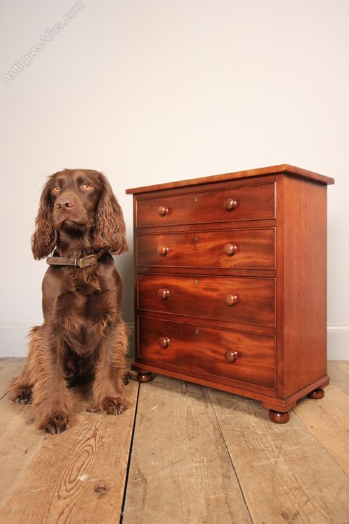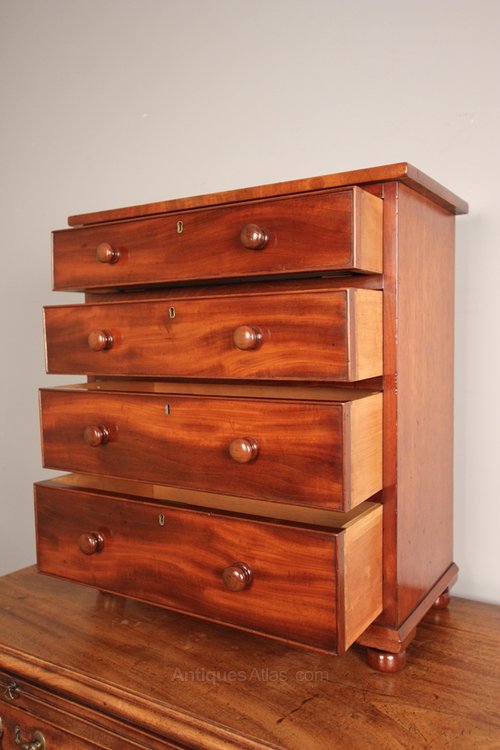 A very high quality 19th C Mahogany apprentice chest of drawers, having an arrangement of 5 graduated drawers and retaining the original knob handles and brass escutcheons. The whole raised on squat bun feet. Lovely colour in excellent order throughout. This little chest is a very practical and useful size, it can be used as a table top chest or even to the side of a sofa as a side/lamp table. English, Circa 1860.