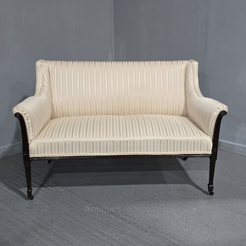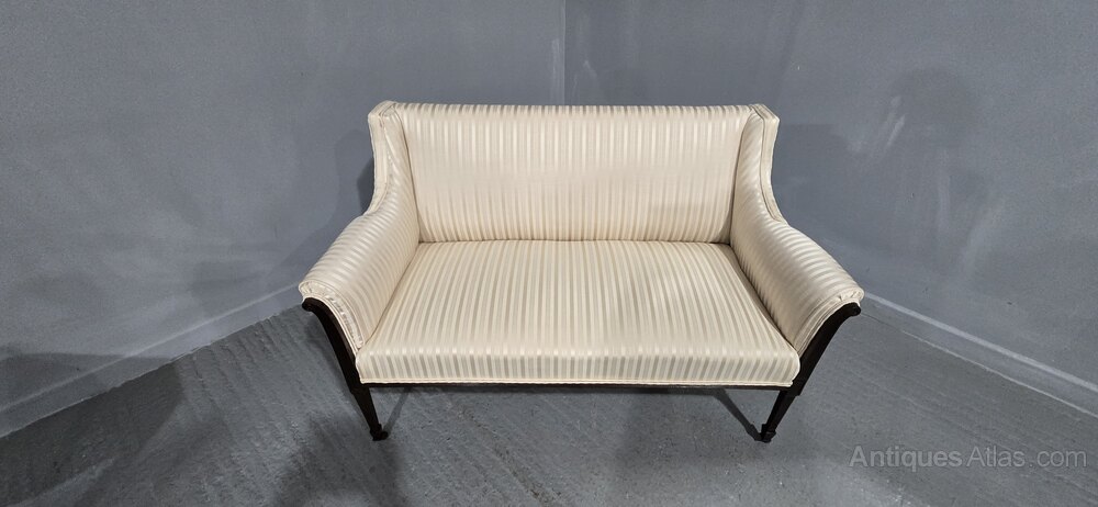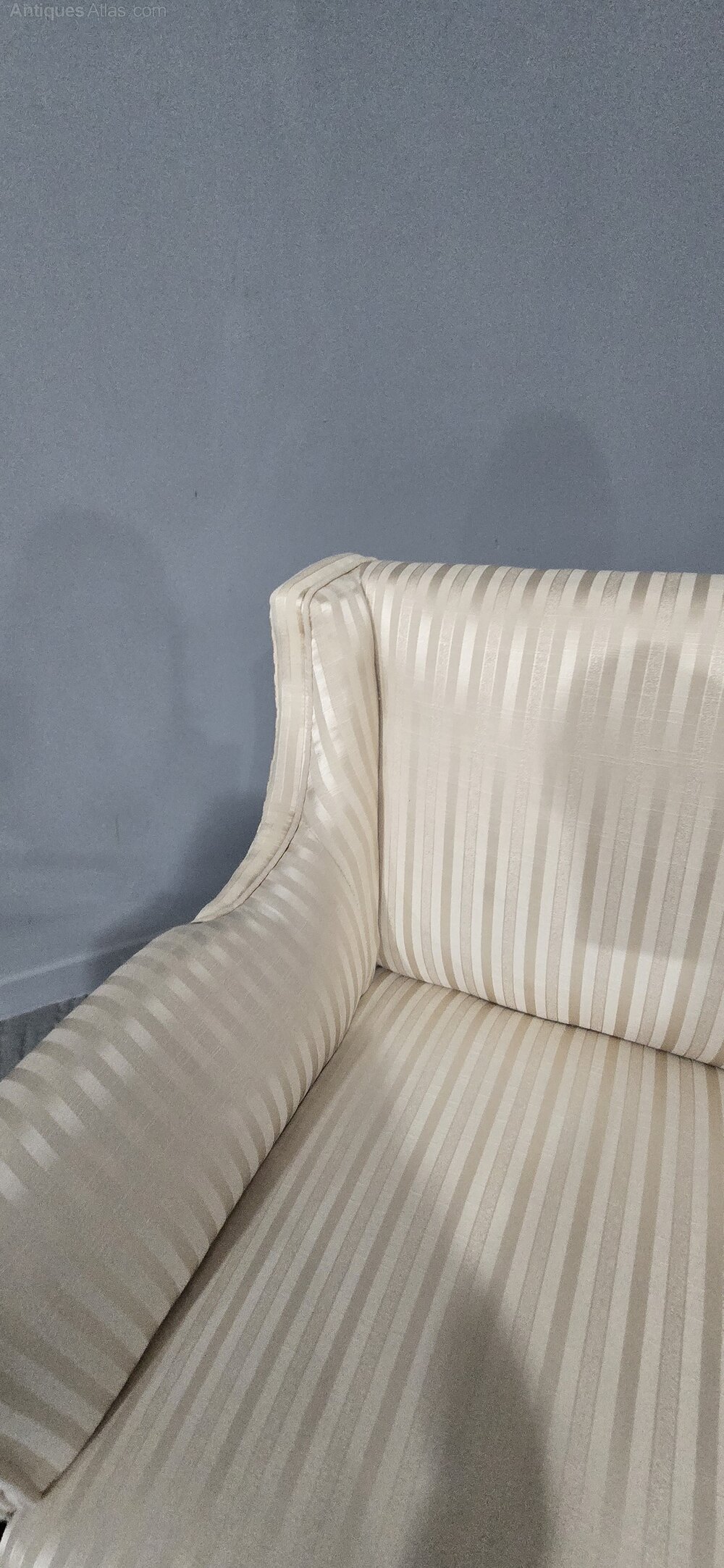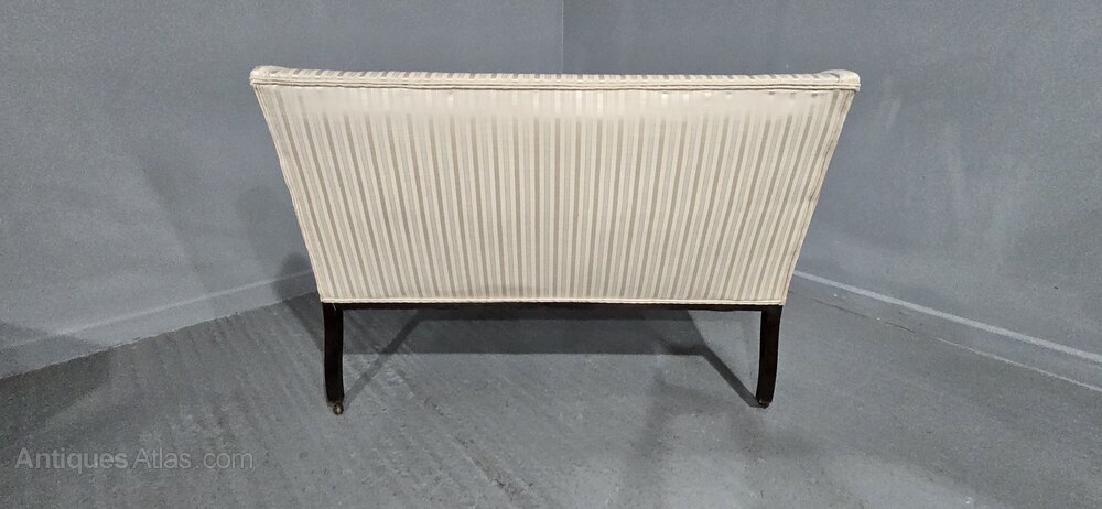 A wonderful mahogany framed Regency style two seater couch, recently reupholstered in fine Regency stripe fabric, standing on square spade foot and original castors, in very good overall condition.
