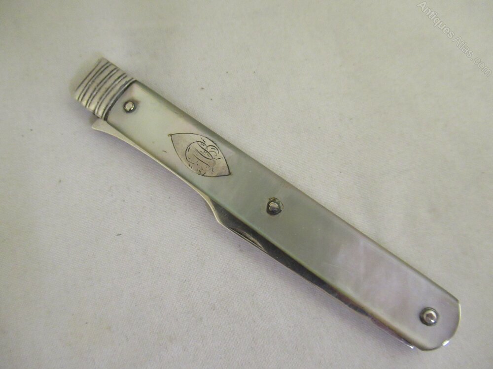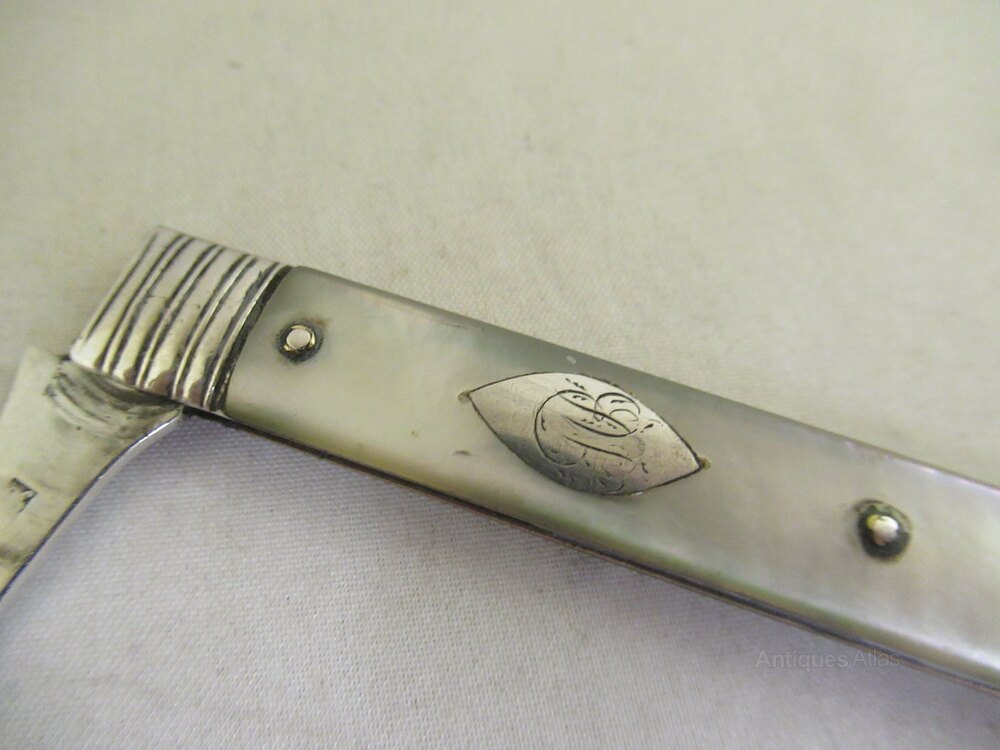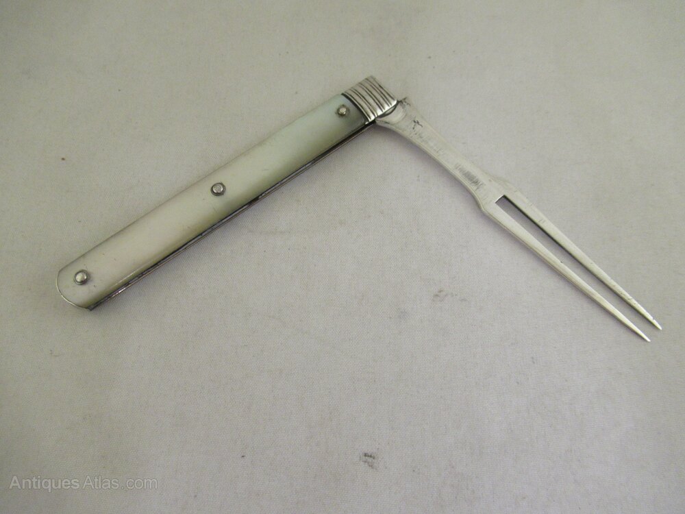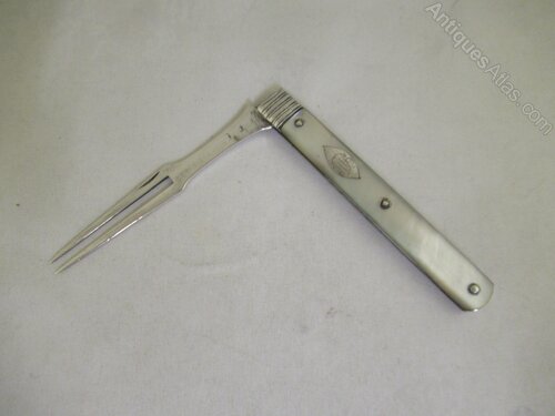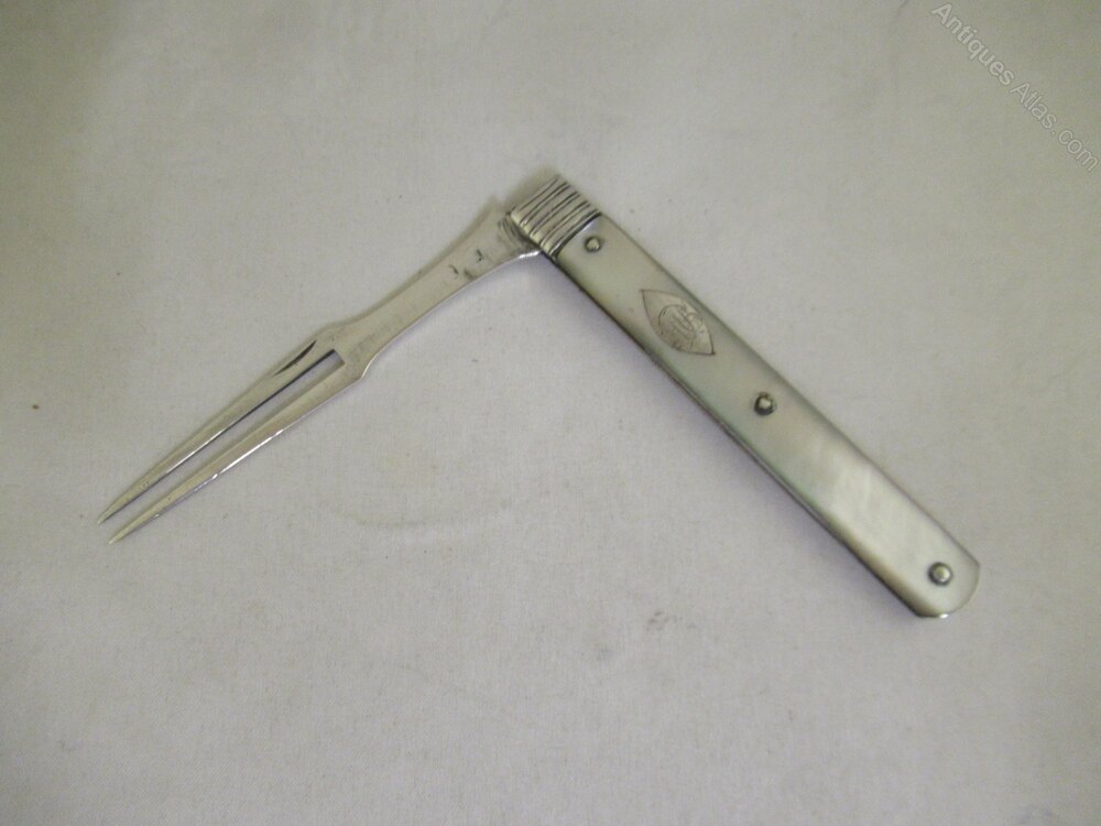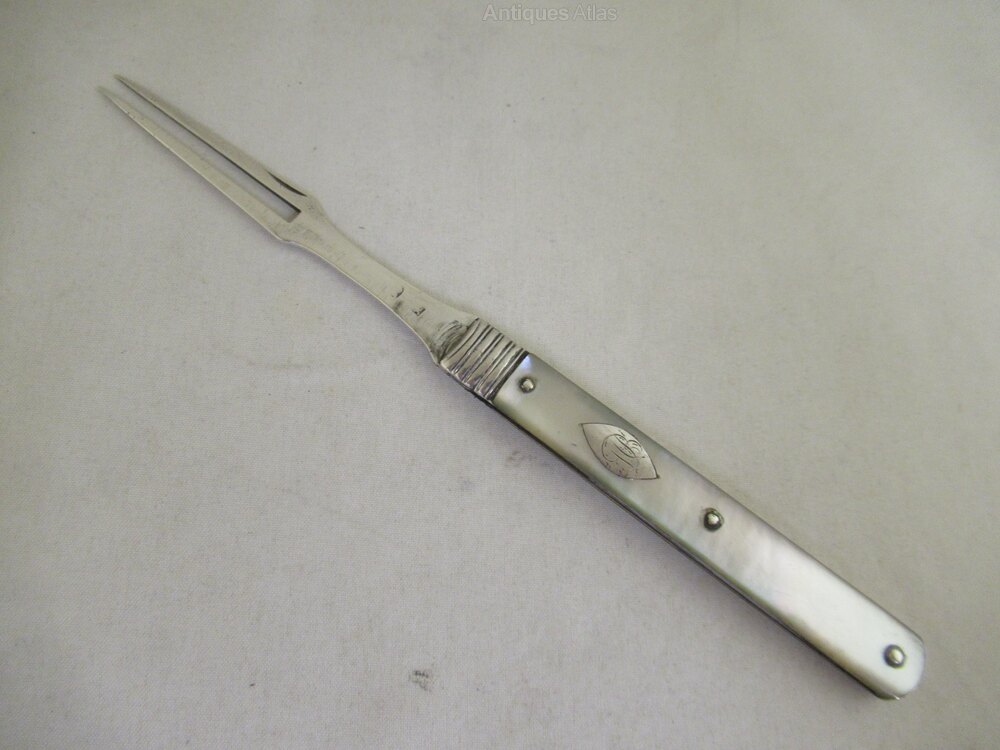 Attractive, straight Mother of Pearl scales to both sides, and three raised silver rivits holding the fork together.