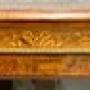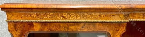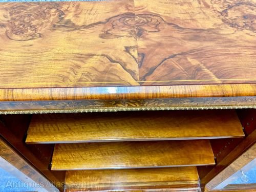 A very good Victorian inverted breakfront burr and figured walnut open and enclosed bookcase. The rectangular shaped top having book matched walnut veneers with outline box wood stinging and cross grain moulded edge. Below is the fine marquetry inlaid and ormolu beaded frieze. The open centre section with 2 solid walnut adjustable shelves and flanked by 2 cabinets with glazed doors which have canted edges with further marquetry inlay and again with 2 adjustable walnut shelves The whole raised on an inverted breakfront plinth with outline boxwood stinging. Condition - very good throughout with polished mahogany lining and working locks with key. Dimensions:- Height…40.5’’/ 103cm. Width…77.75’’/ 197.5cm. Depth…15.5’’/ 39.5cm. Delivery to most of U.K. mainland £75.
