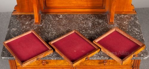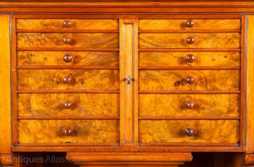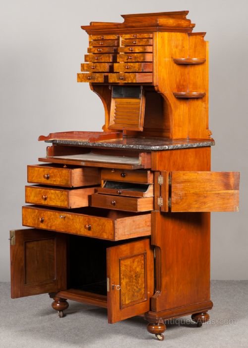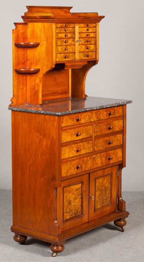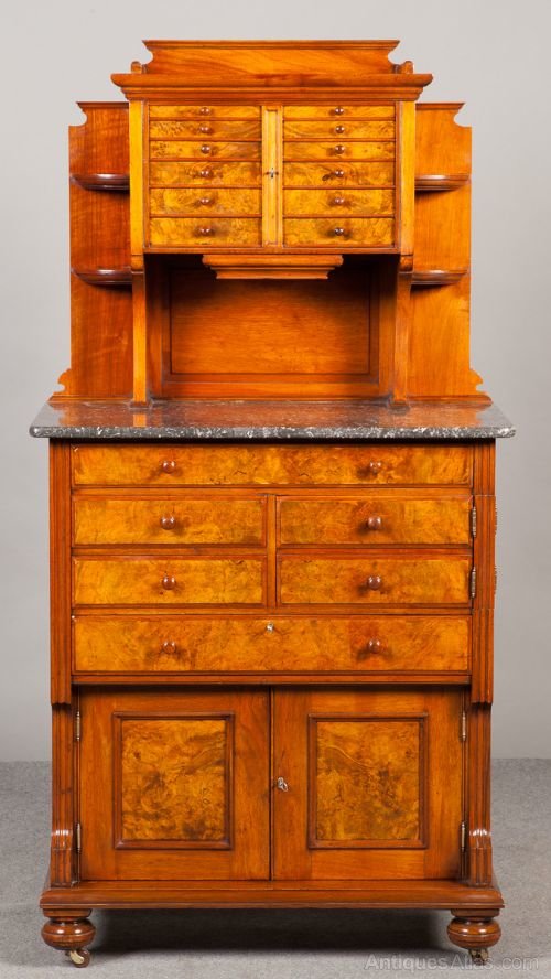 A superb Victorian walnut and burr walnut dentist cabinet by C.Ash and Sons, London, England and bearing label. The top with 12 graduated burr walnut veneered drawers and 1 lock which secures all drawers. In the centre is a drop down drawer fitted for drills. A removable and shaped three quarter gallery above and corner shelves to the sides. The base with grey variegated and speckled marble top and 9 burr walnut drawers and dummy drawers below,again 1 lock secures all drawers. The cupboard with 2 burr walnut panelled doors and unusual locking system. The whole standing on turned bun feet with brass and porcelain castors.Freestanding with solid walnut polished back. Various lift out trays etc. Quality cabinet making and in fine condition. More photos available on request. Sizes- Height 62.25''..158cm. Width 32''..81cm. Depth 17''..43cm.Delivery to U.K. mainland £95.