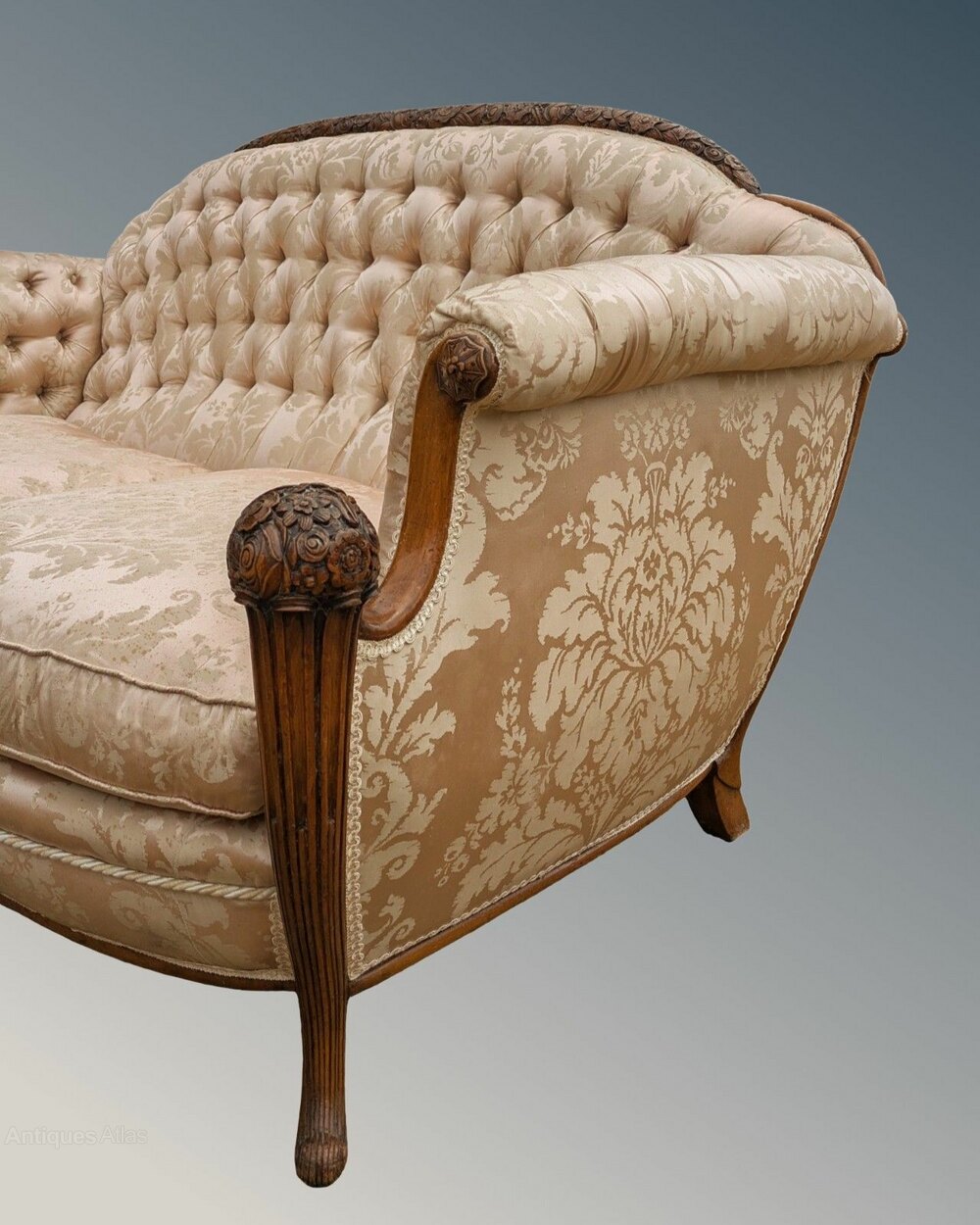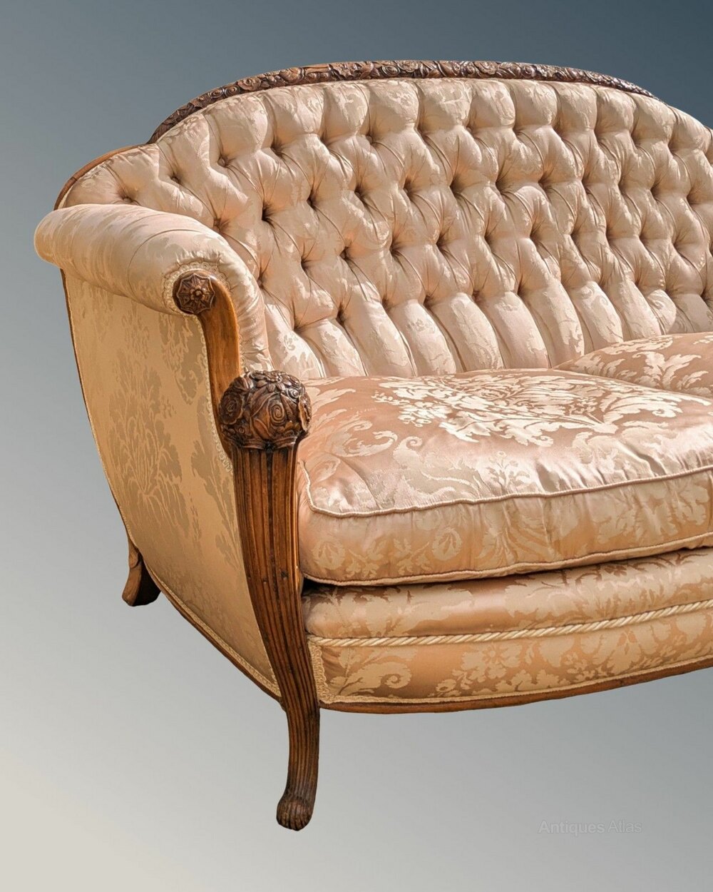 This is a fabulous French carved walnut sofa beautifully upholstered in silk brocade dating from around 1900. The sofa has been meticulously and very skillfully handmade to an incredible standard. It has a very heavy hardwood frame, with absolutely no give and tight joints, and a show frame in intricately carved solid walnut. The design is very eye-catching with sweeping curves and carved floral knop hand rests, reflecting the changing fashions of the times. It is upholstered in a shell pink silk brocade and has deep buttoning to the back and separate thick squab cushions, feather-filled, making a most comfortable seat. The upholstery is to a standard difficult to find these days and is in excellent condition throughout, with no wear or fading at all. The sofa measures 72 cm high by 166 cm wide by 90 cm deep overall. The squab cushions each measure 62 cm wide by 62 cm deep, with the seat being 40 cm from the floor. UK delivery can be arranged with our local courier and costs £85 plus VAT to most areas.