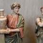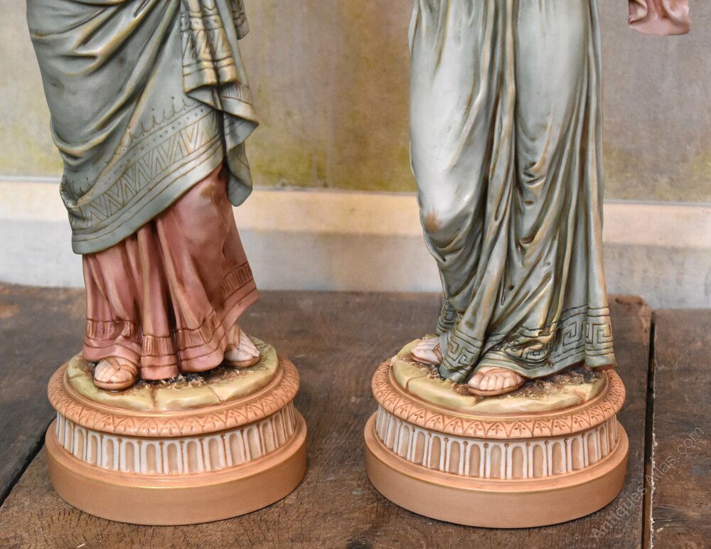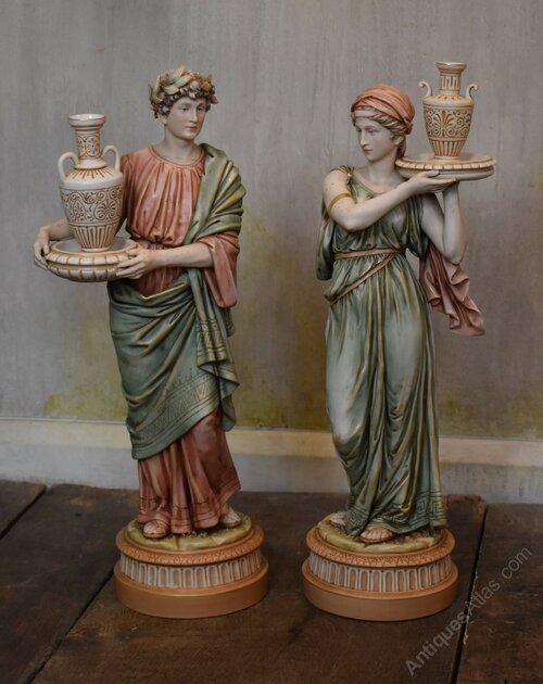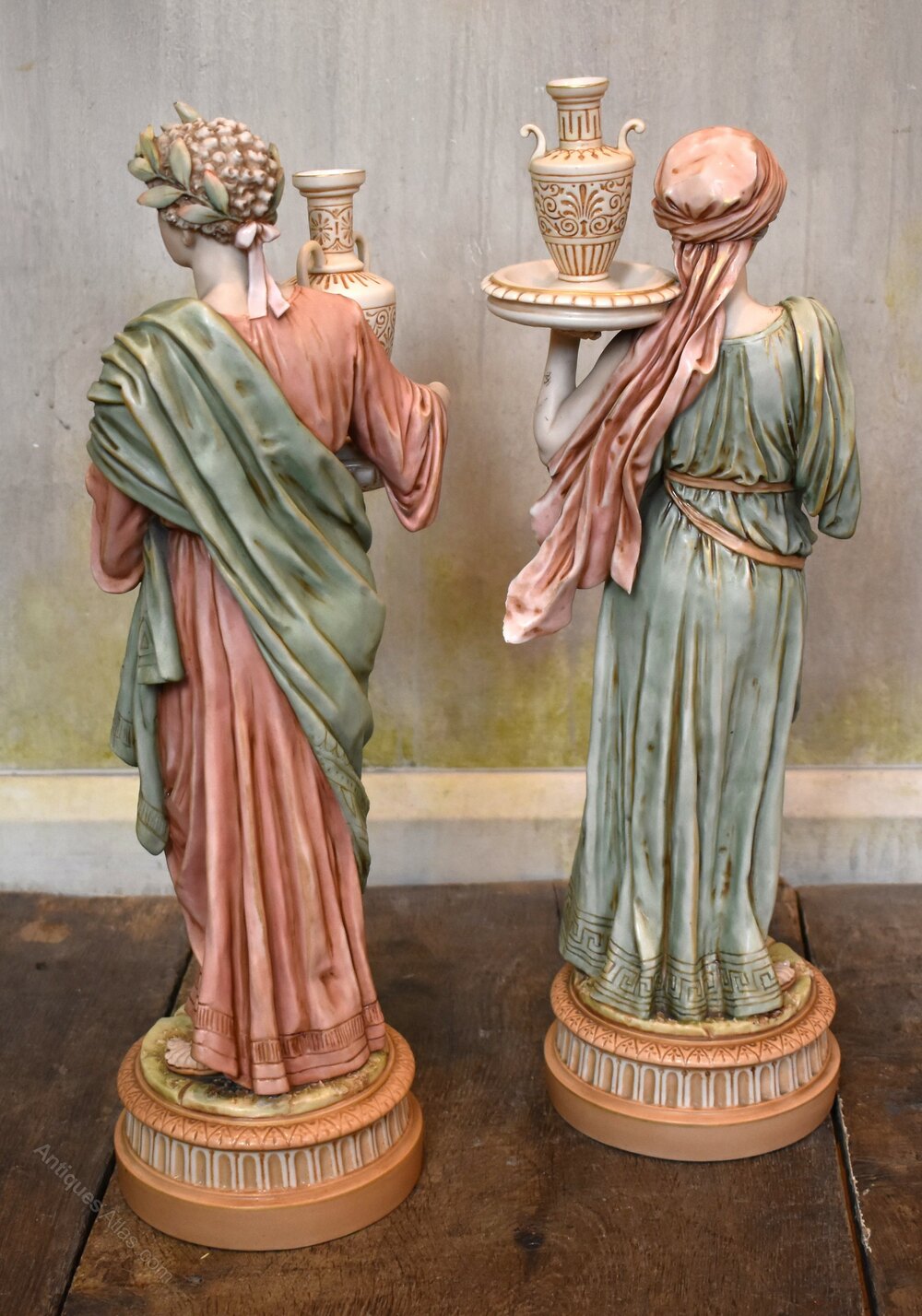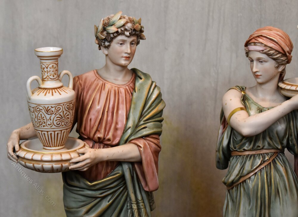 A fine pair of Royal Dux figures in the neoclassical manner and possibly representing Ganymede and Hebe, the cupbearers to the gods. The pair are beautifully modelled in stunning detail and decorated in the traditional Royal Dux palette of blue, pink, cream and gold. The figures are of an impressive size and finished to the same high standard all the way around. The pair are both marked with the Royal Dux pink triangle mark with the central E and an early design number. The two figures are in very good condition there is the odd surface mark, very minor chip to the laurel in the male figure’s hair and a possibility the ewer the female figure is carrying has been reglued. The pair are stunning examples of porcelain figures with an impressive look. C.1900