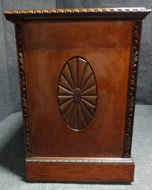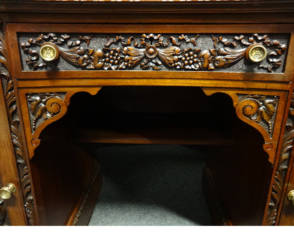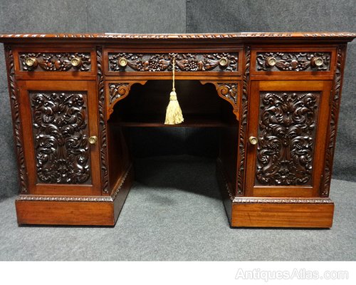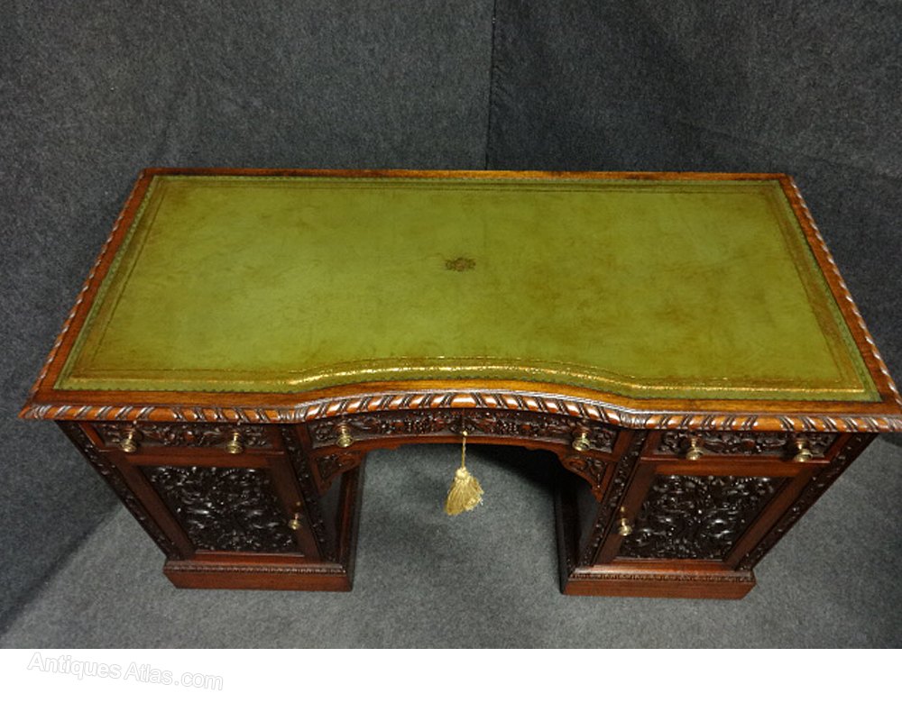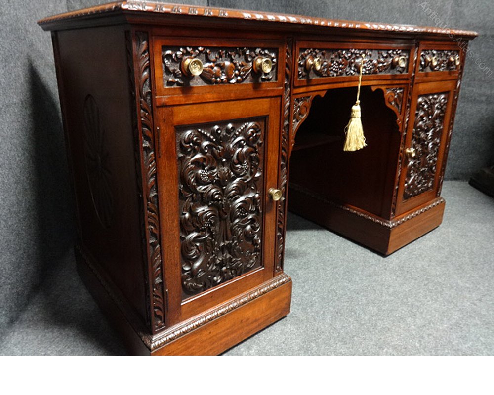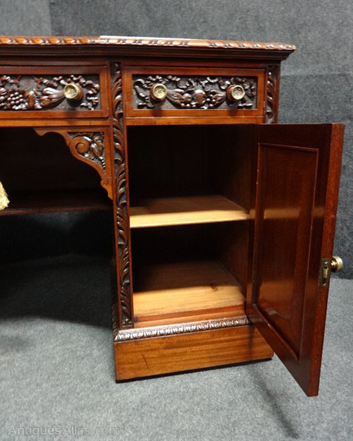 A very good quality pedestal mahogany desk, concave front, three drawers over two cupboards, top quality carvings to the front , carvings to the sides, excellent colour and condition.