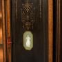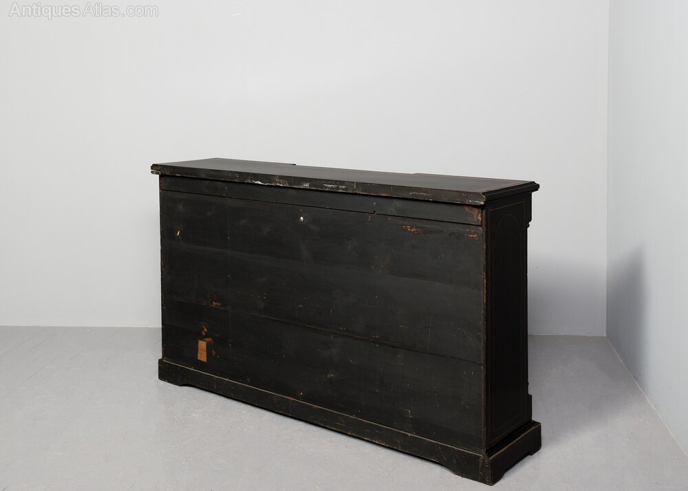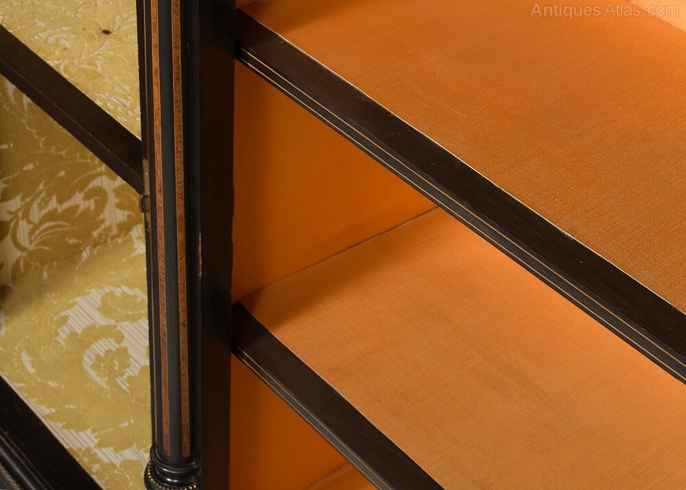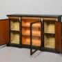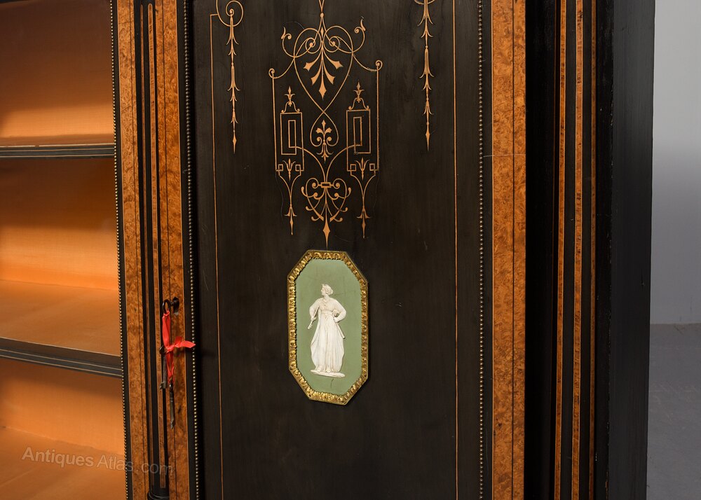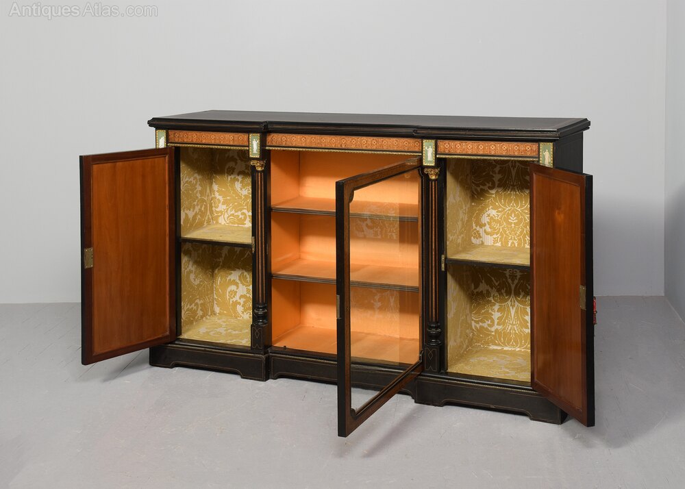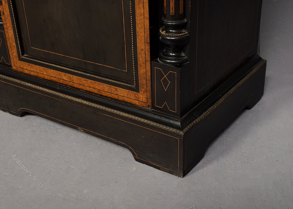 Circa 1870. Superb quality Aesthetic movement ebonized and inlaid amboyna three-door credenza. The breakfront top with amboyna, boxwood and ebony string inlay above a frieze with neoclassical boxwood, foliate inlay on an amboyna background, above cast brass foliate mounts. The two side ebonized panelled side doors with Wedgwood plaques and a central glazed doors with ornate and beaded brass mounts opening to a shelved interior. The doors separated and flanked by Corinthian columns with cast brass capitals and inlaid columns. All supported on reverse breakfront base with brass beading. In excellent condition.