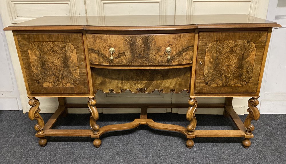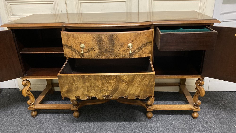A wonderful quality Sideboard made from Walnut with excellent Burr Walnut in the Carolean style. Made and labelled inside door by the Bath Cabinet Makers Company, 33 Great Pulteney Steet, London. The 2 outer doors are lockable (key present) and it has 2 large central drawers all providing a lot of storage. The centre bows out and the Carolean legs are particularly nice.