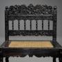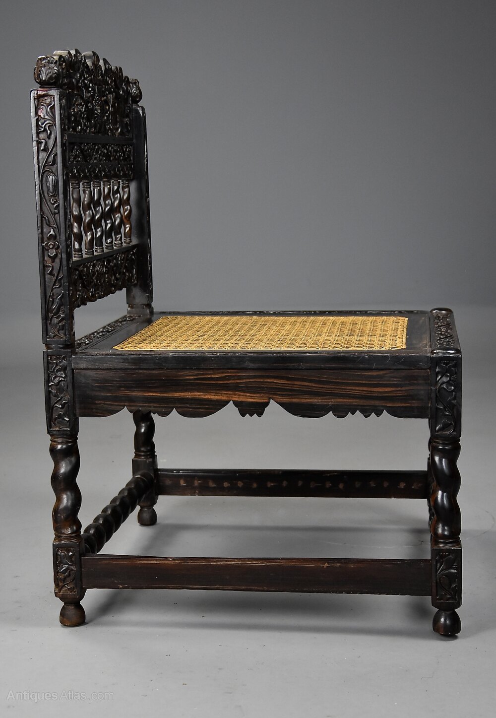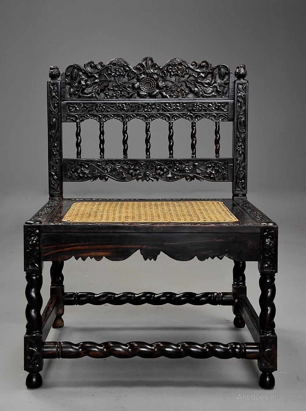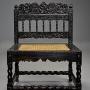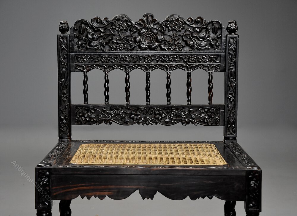 A superb quality mid 17th century (circa 1660) solid ebony low chair with intricate carving from The Coromandel Coast, India - the South Indian Coromandel Coast was the centre for production of carved ebony furniture during 1650-1660.