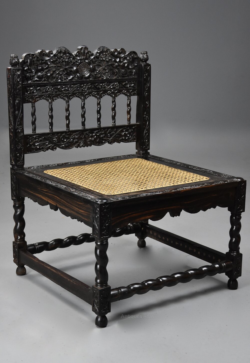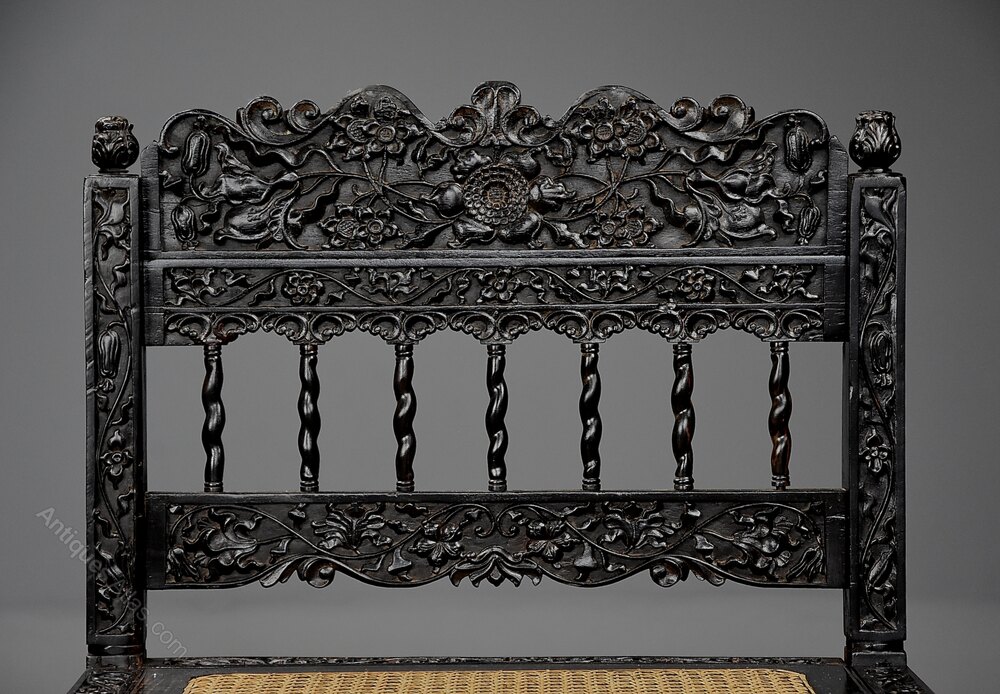 This chair consists of a profusely carved top rail of low relief foliate and floral decoration with carved uprights and foliate carved finials to the top.